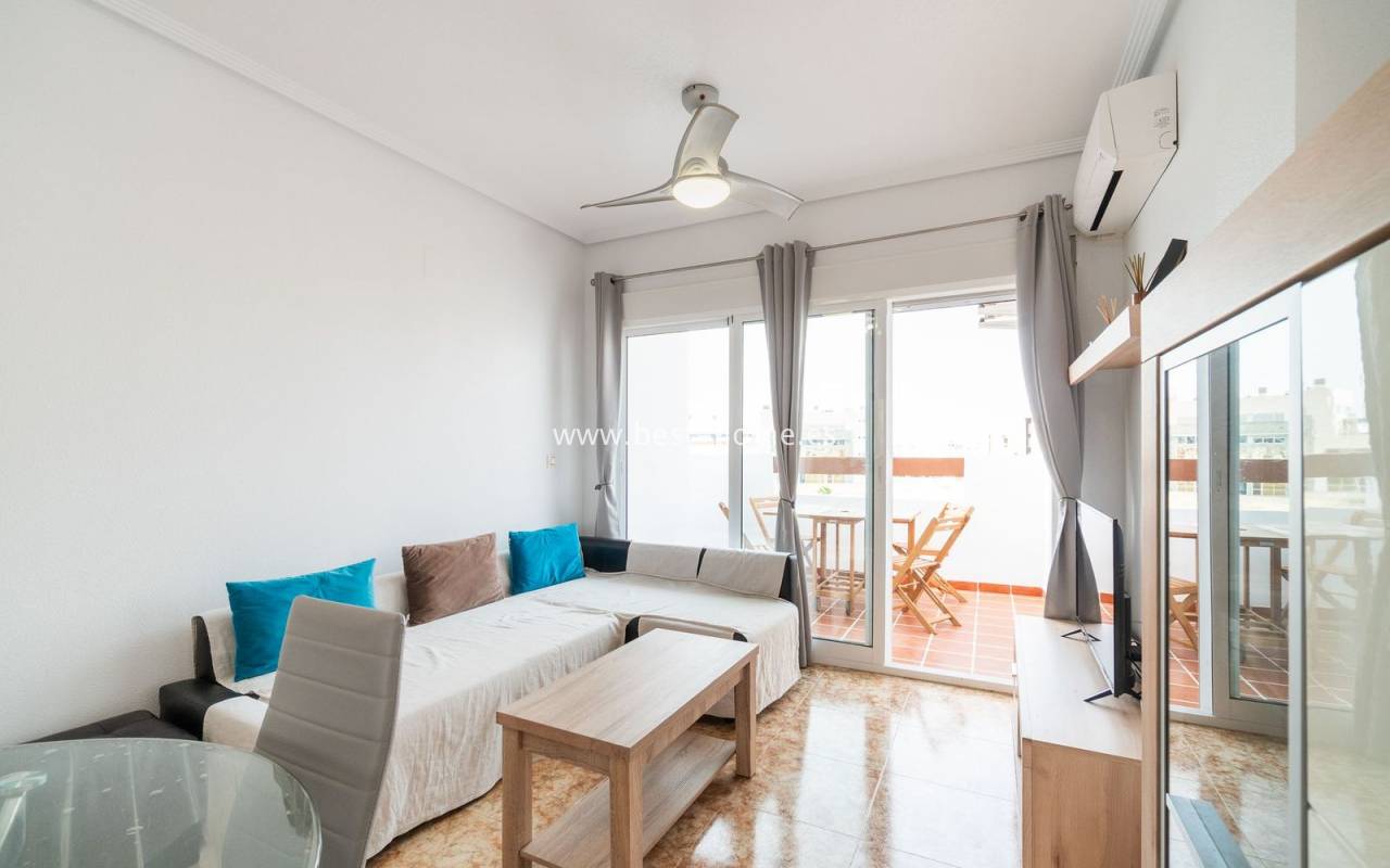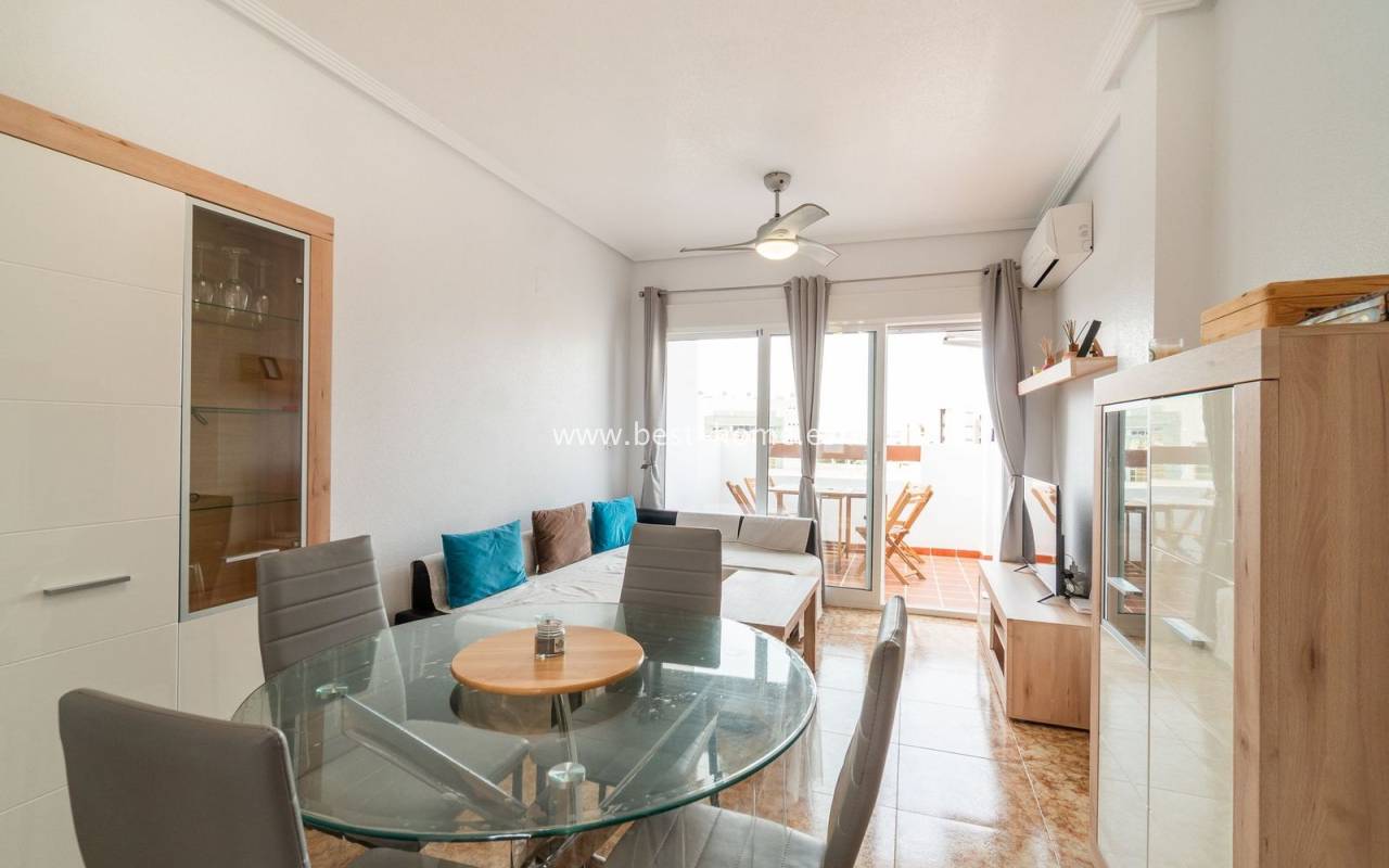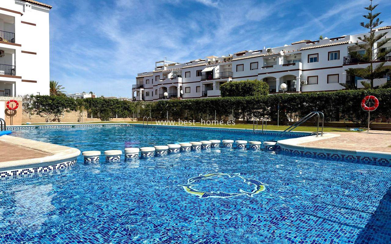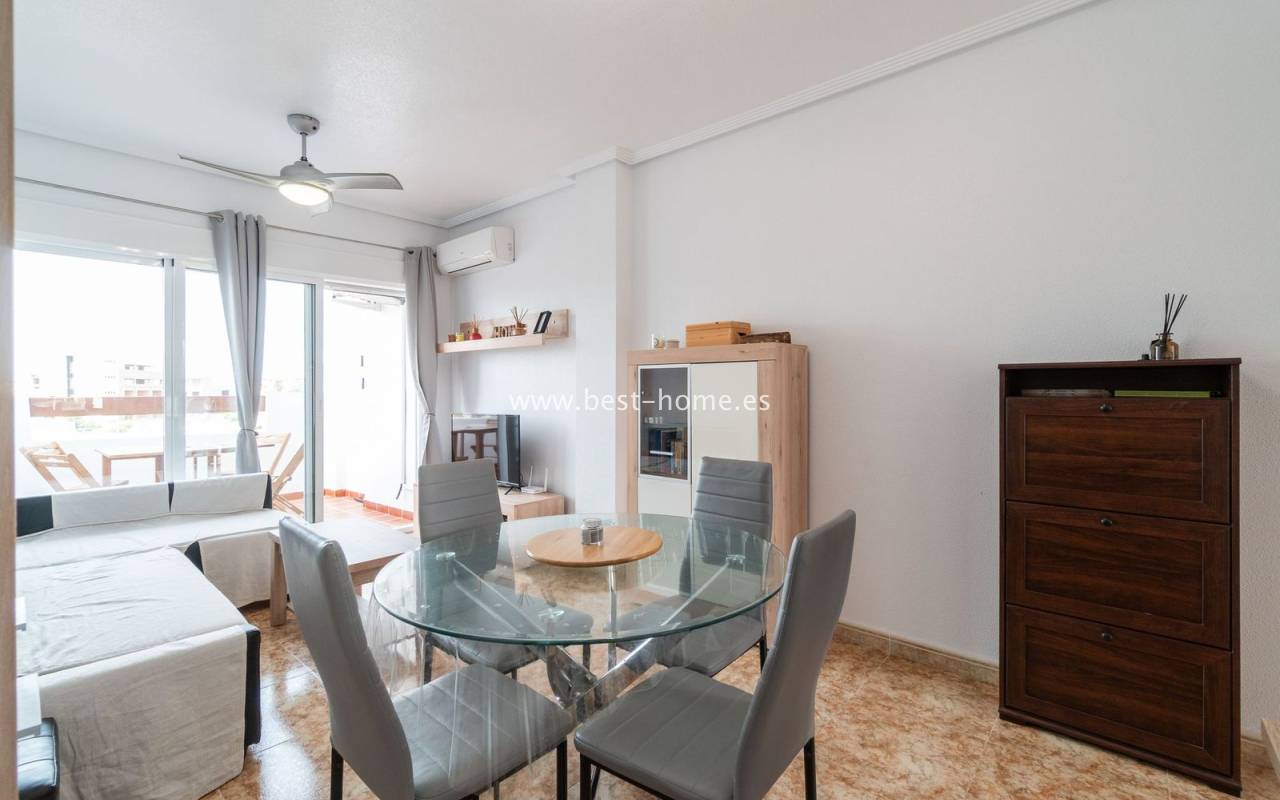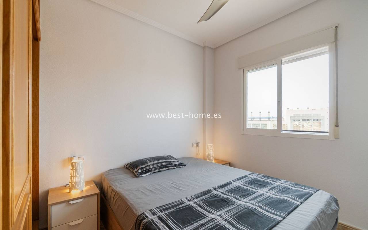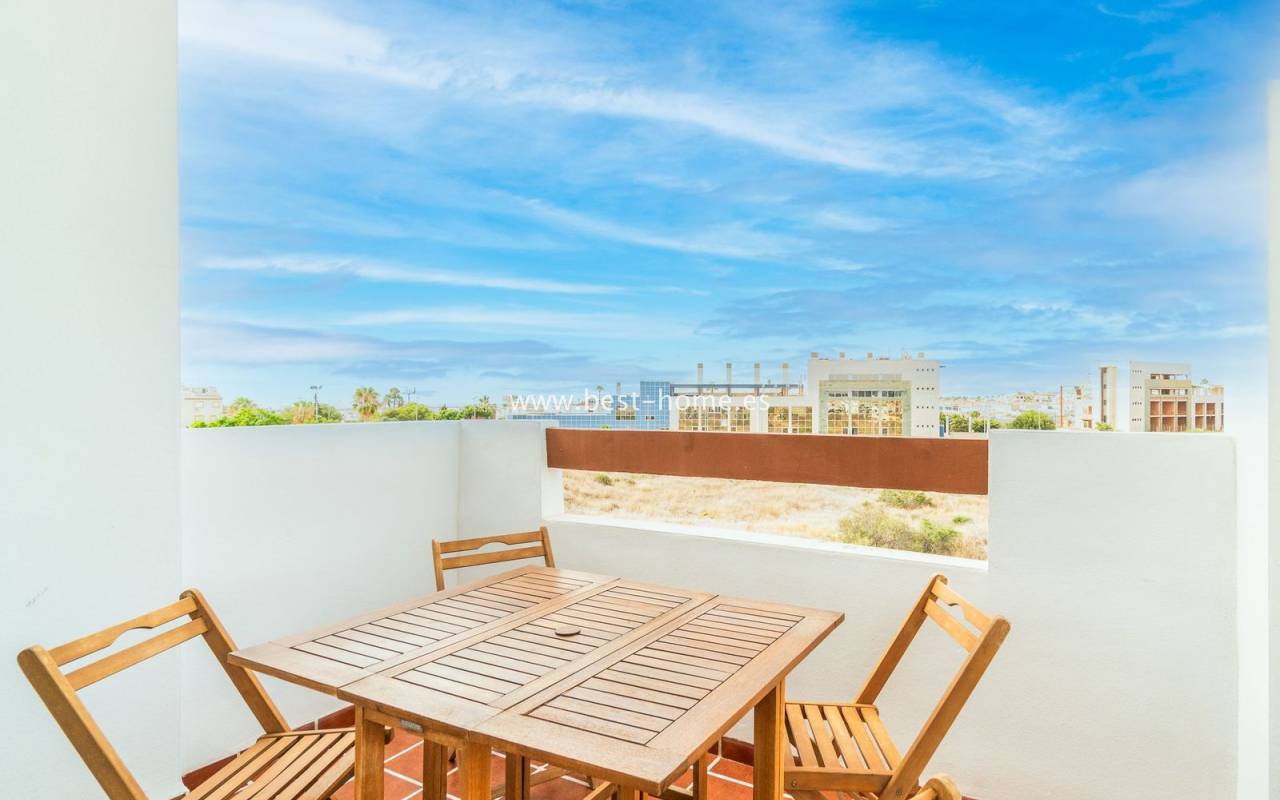 Penthouse with a large solarium, sea views, underground garage, and community pool in the Punta Prima urbanization. It features a bright, spacious living room with access to a sunny terrace, a separate kitchen equipped with appliances, two double bedrooms, including the master with an en-suite bathroom, and a second bathroom. Upstairs, there's a private solarium with sea views and a relaxation area. The apartment is furnished and equipped with air conditioning. An additional advantage is a parking space in the underground garage included in the price. The complex also features a residents' swimming pool. The beach is approximately 650 meters away. Nearby, you'll find numerous restaurants, cafes, and pastry shops.