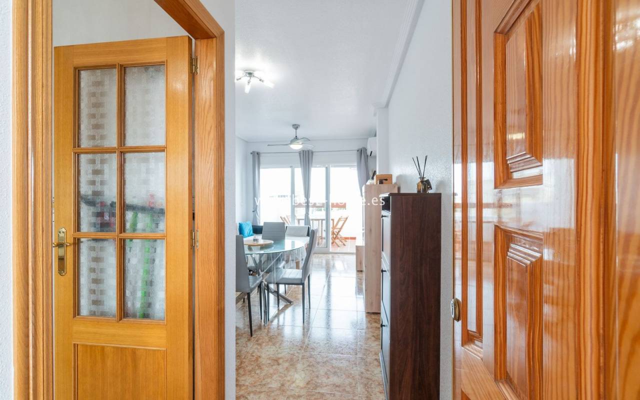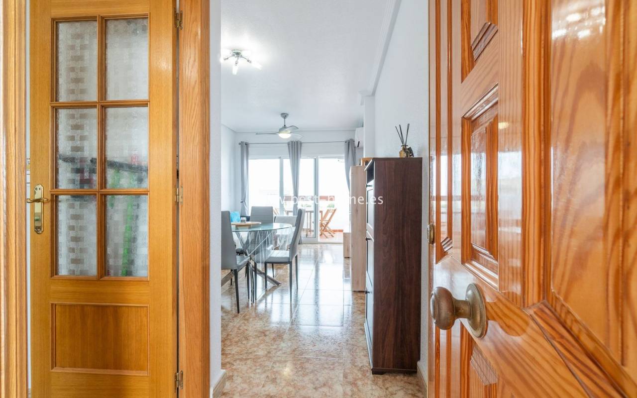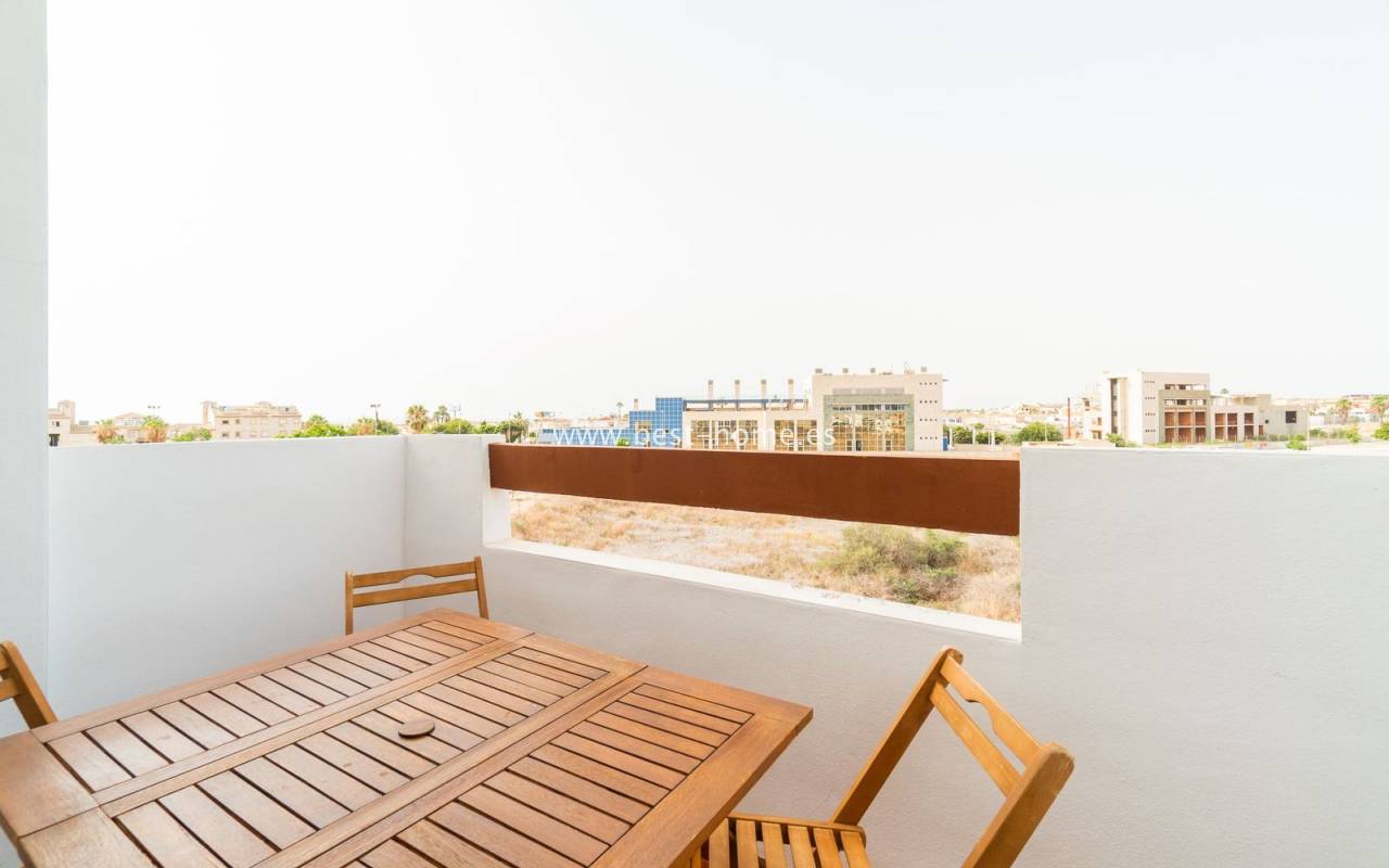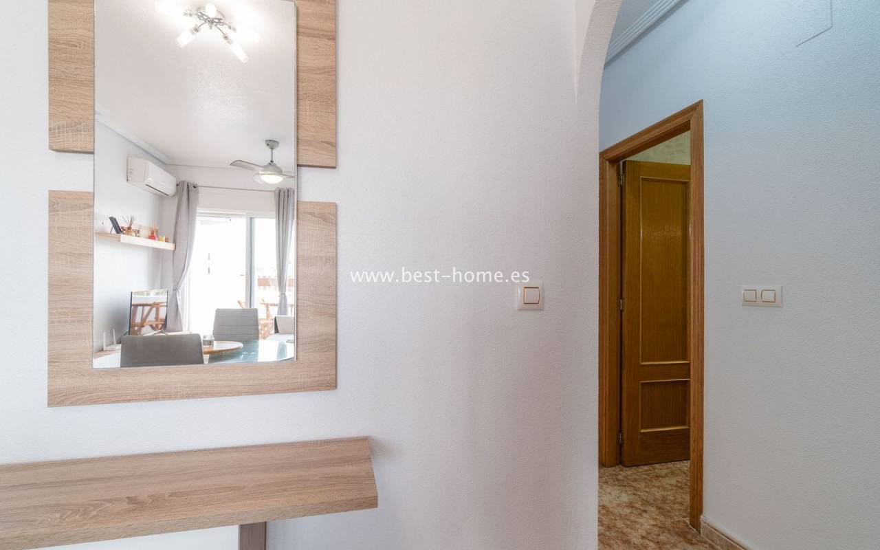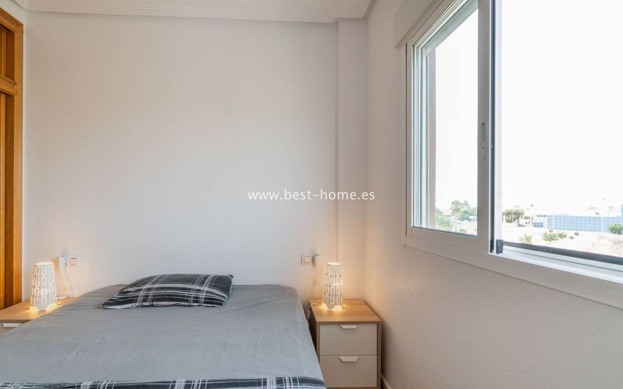 Penthouse with a large solarium, sea views, underground garage, and community pool in the Punta Prima urbanization. It features a bright, spacious living room with access to a sunny terrace, a separate kitchen equipped with appliances, two double bedrooms, including the master with an en-suite bathroom, and a second bathroom. Upstairs, there's a private solarium with sea views and a relaxation area. The apartment is furnished and equipped with air conditioning. An additional advantage is a parking space in the underground garage included in the price. The complex also features a residents' swimming pool. The beach is approximately 650 meters away. Nearby, you'll find numerous restaurants, cafes, and pastry shops.