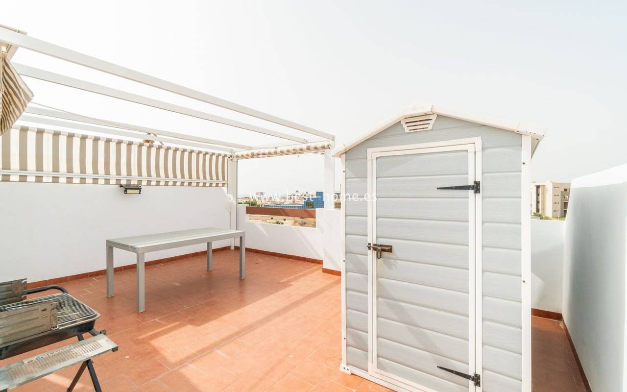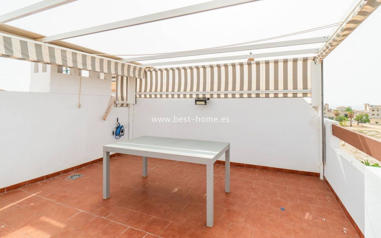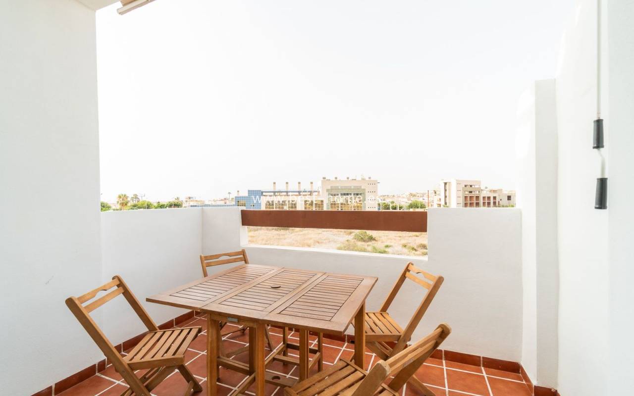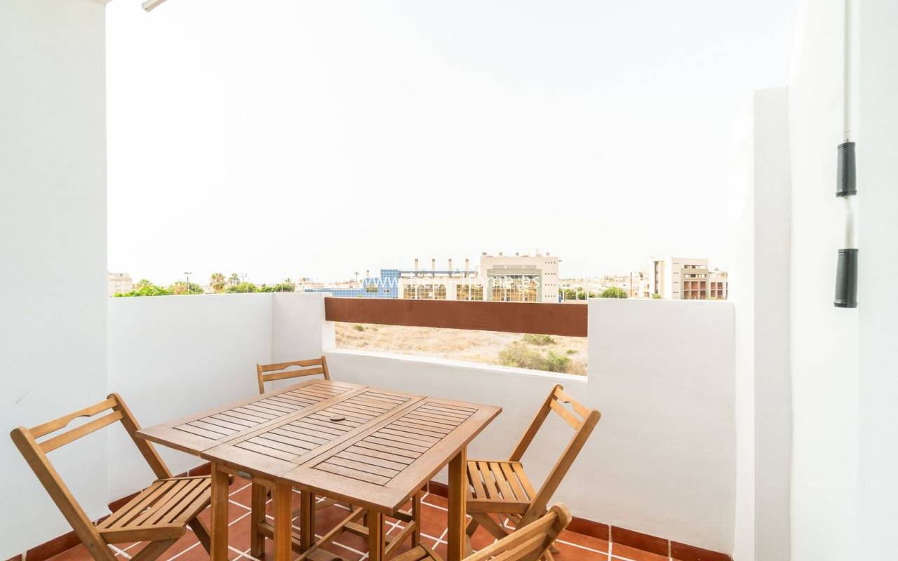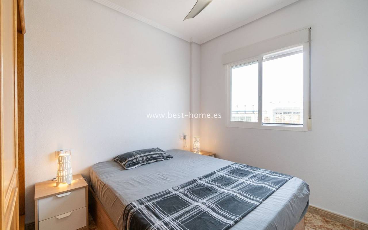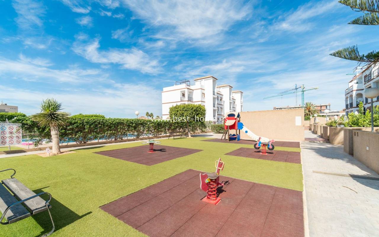 Penthouse with a large solarium, sea views, underground garage, and community pool in the Punta Prima urbanization. It features a bright, spacious living room with access to a sunny terrace, a separate kitchen equipped with appliances, two double bedrooms, including the master with an en-suite bathroom, and a second bathroom. Upstairs, there's a private solarium with sea views and a relaxation area. The apartment is furnished and equipped with air conditioning. An additional advantage is a parking space in the underground garage included in the price. The complex also features a residents' swimming pool. The beach is approximately 650 meters away. Nearby, you'll find numerous restaurants, cafes, and pastry shops.