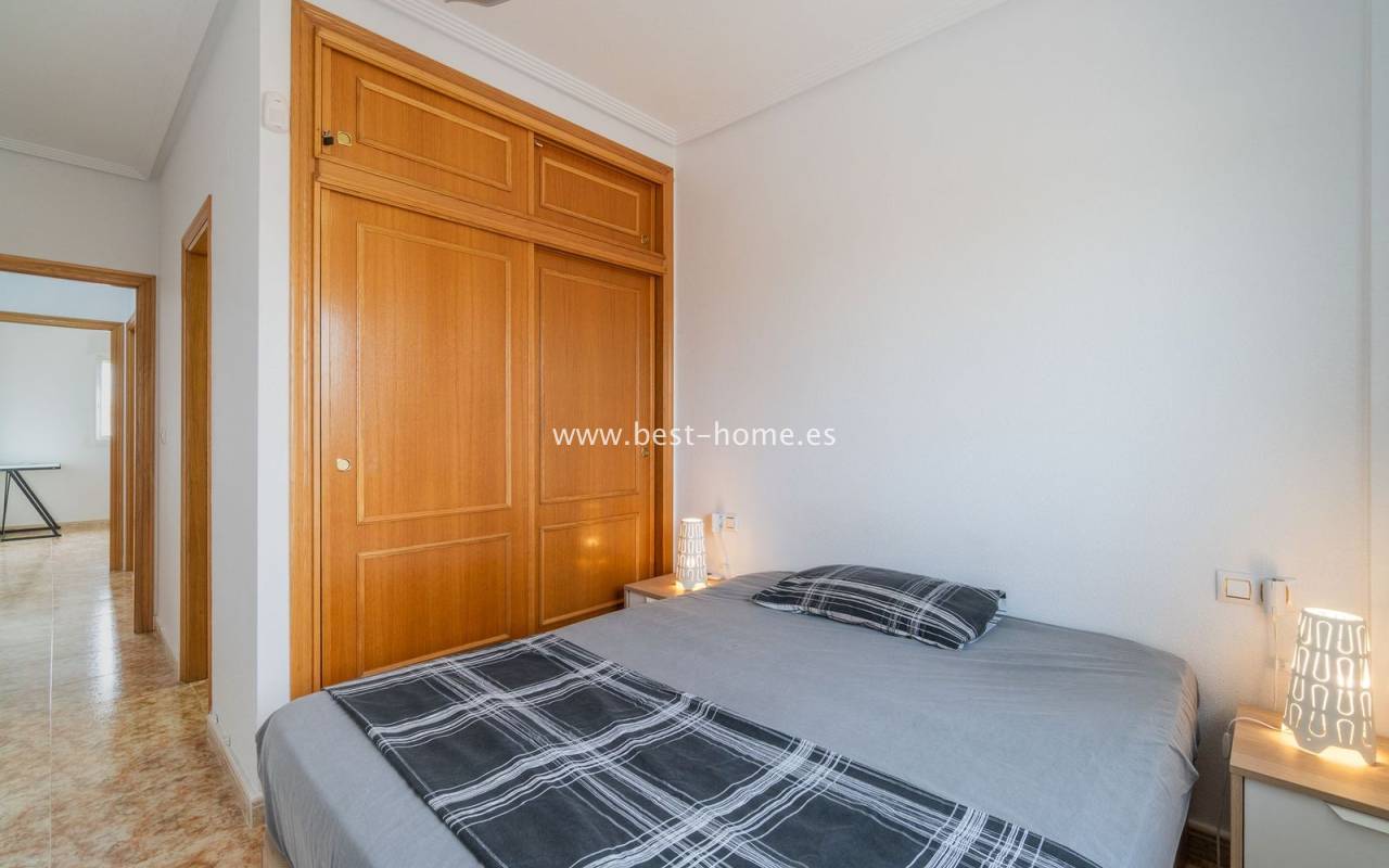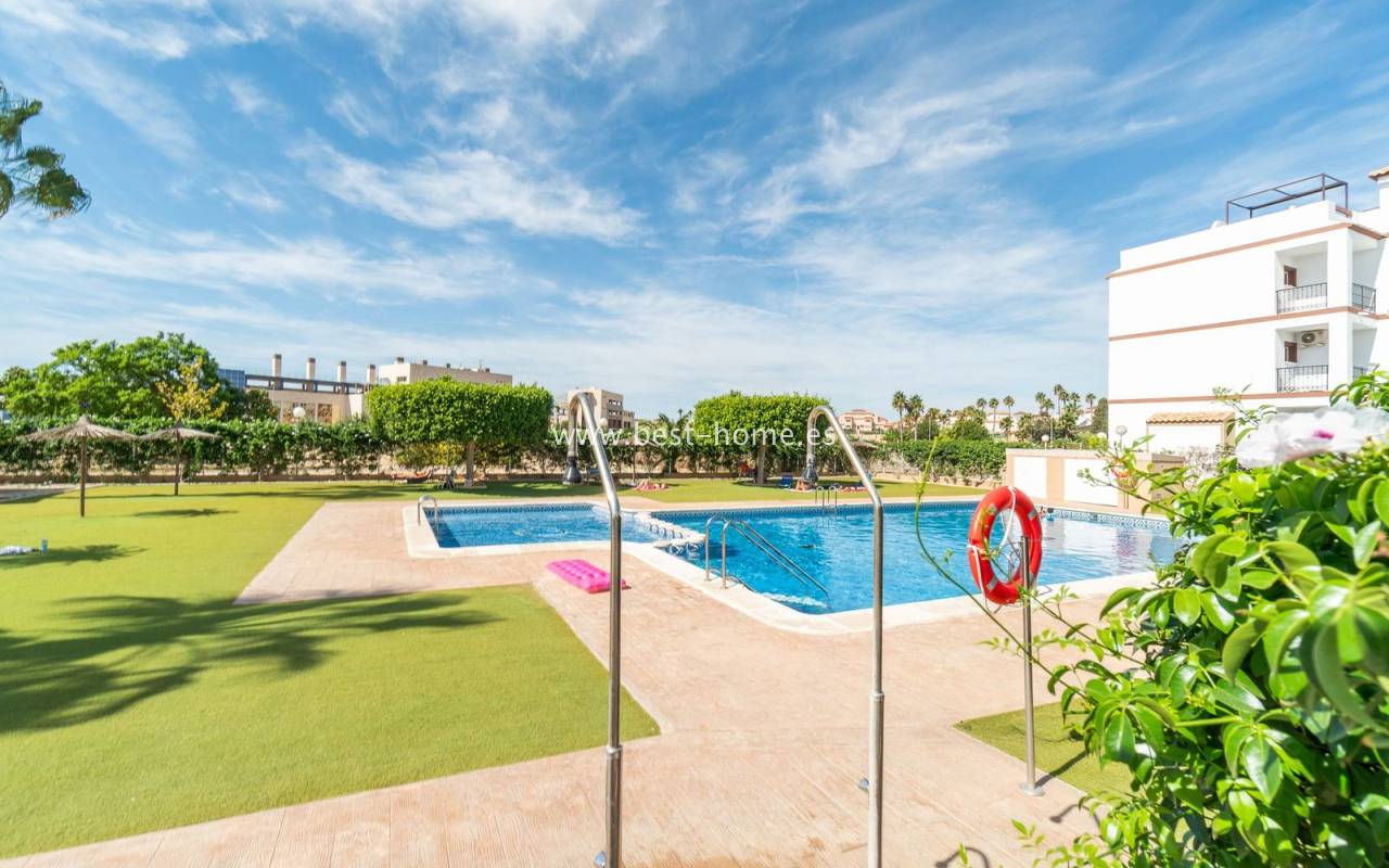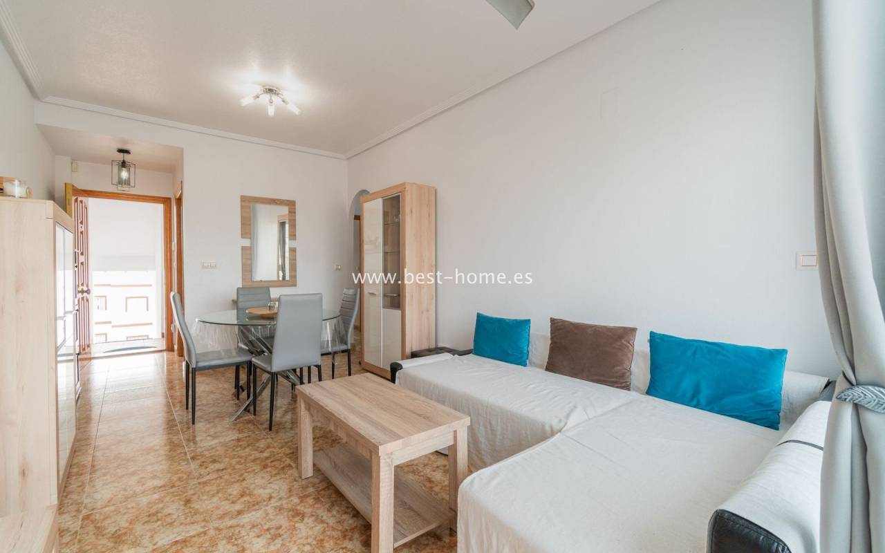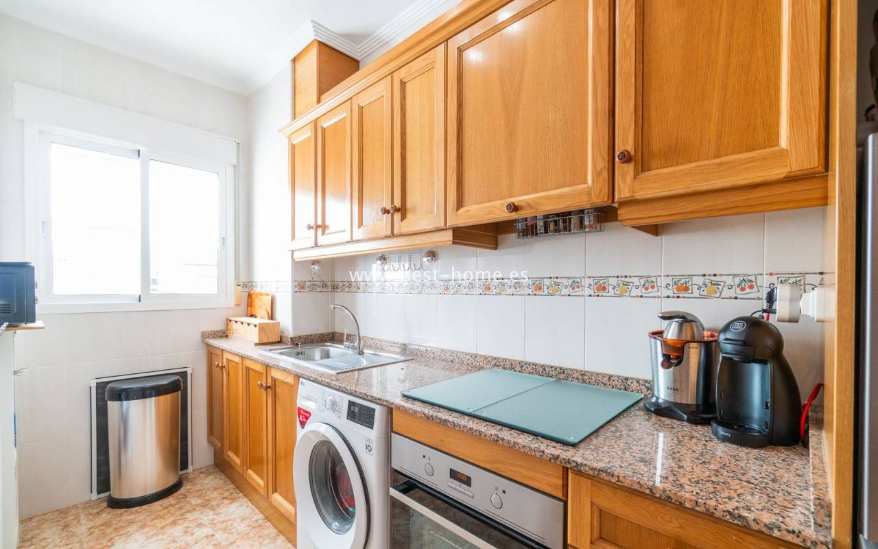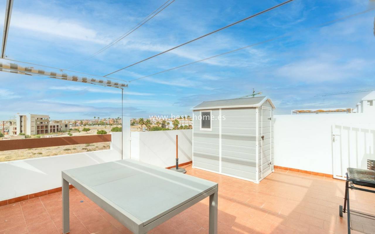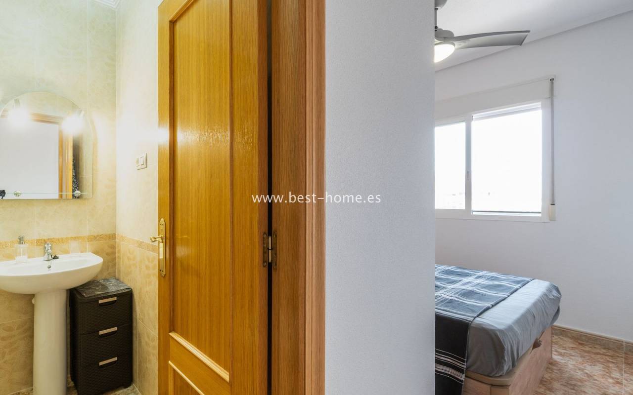 Penthouse with a large solarium, sea views, underground garage, and community pool in the Punta Prima urbanization. It features a bright, spacious living room with access to a sunny terrace, a separate kitchen equipped with appliances, two double bedrooms, including the master with an en-suite bathroom, and a second bathroom. Upstairs, there's a private solarium with sea views and a relaxation area. The apartment is furnished and equipped with air conditioning. An additional advantage is a parking space in the underground garage included in the price. The complex also features a residents' swimming pool. The beach is approximately 650 meters away. Nearby, you'll find numerous restaurants, cafes, and pastry shops.
