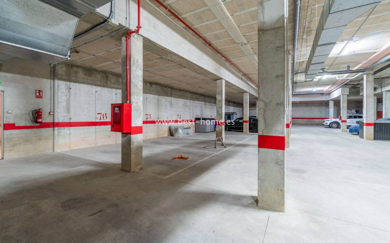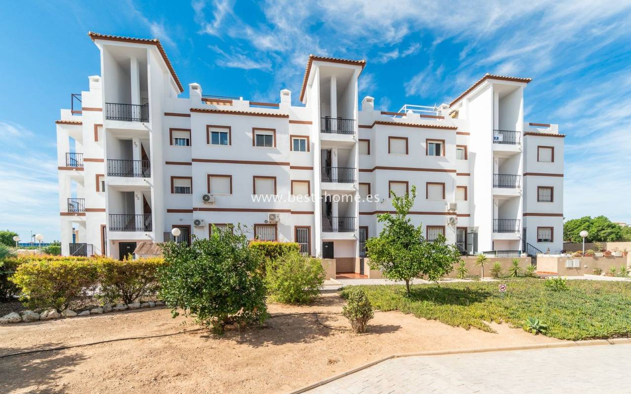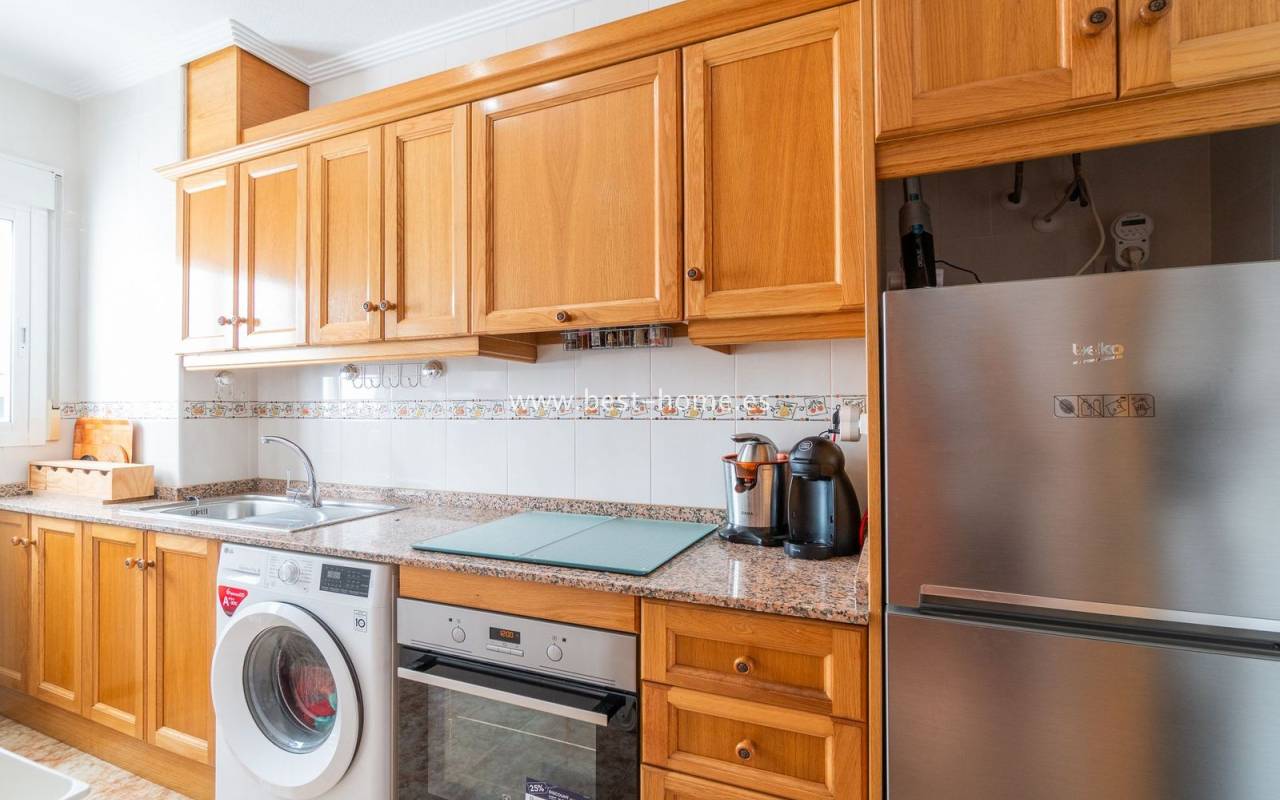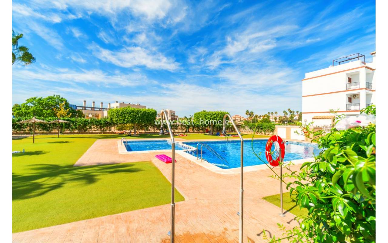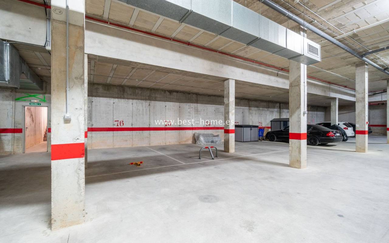 Penthouse with a large solarium, sea views, underground garage, and community pool in the Punta Prima urbanization. It features a bright, spacious living room with access to a sunny terrace, a separate kitchen equipped with appliances, two double bedrooms, including the master with an en-suite bathroom, and a second bathroom. Upstairs, there's a private solarium with sea views and a relaxation area. The apartment is furnished and equipped with air conditioning. An additional advantage is a parking space in the underground garage included in the price. The complex also features a residents' swimming pool. The beach is approximately 650 meters away. Nearby, you'll find numerous restaurants, cafes, and pastry shops.