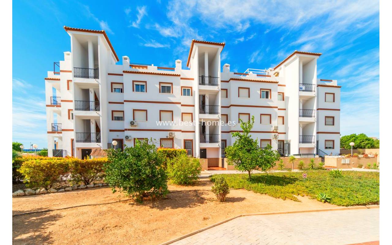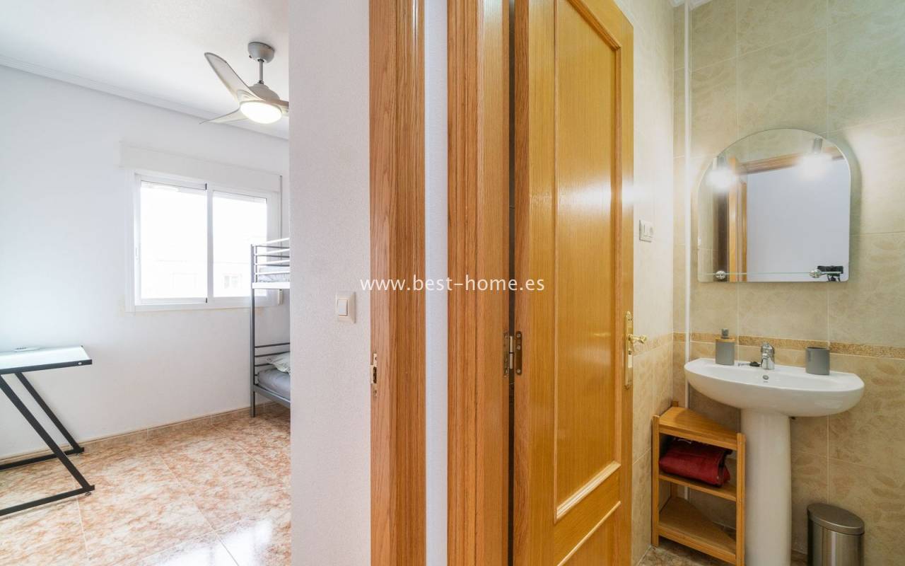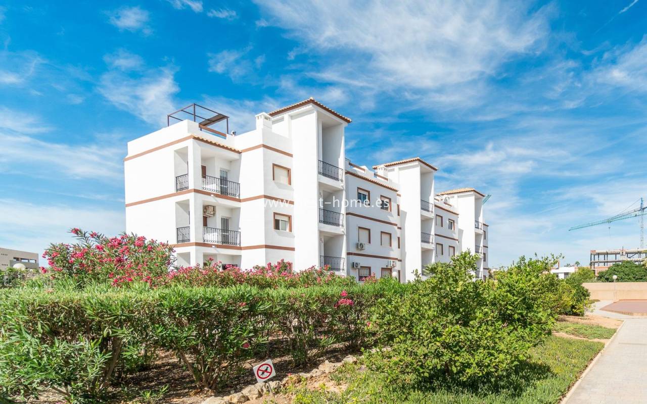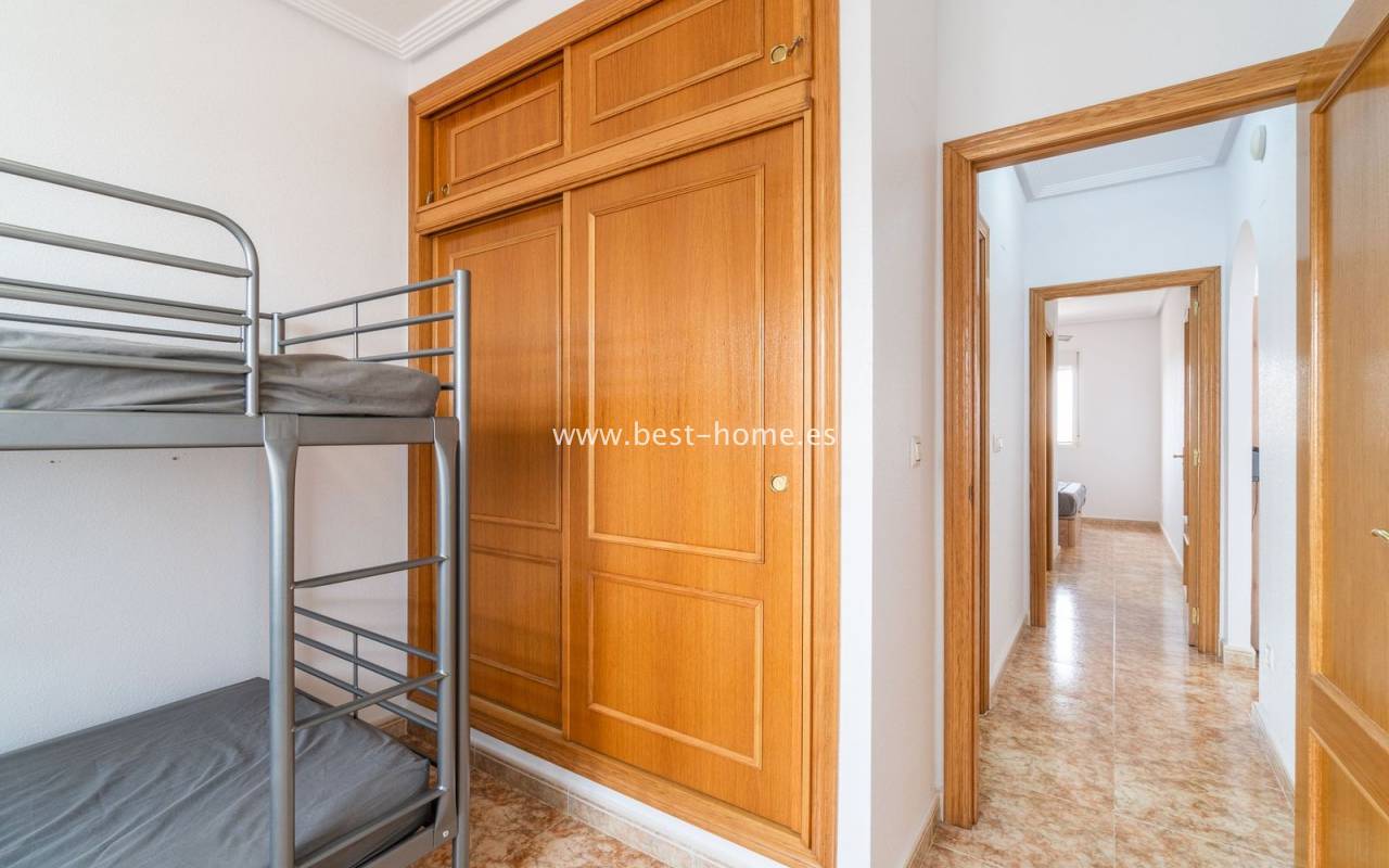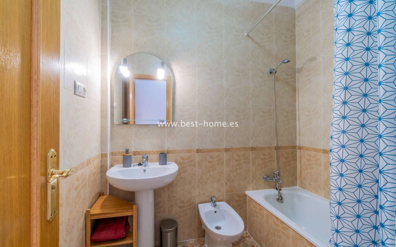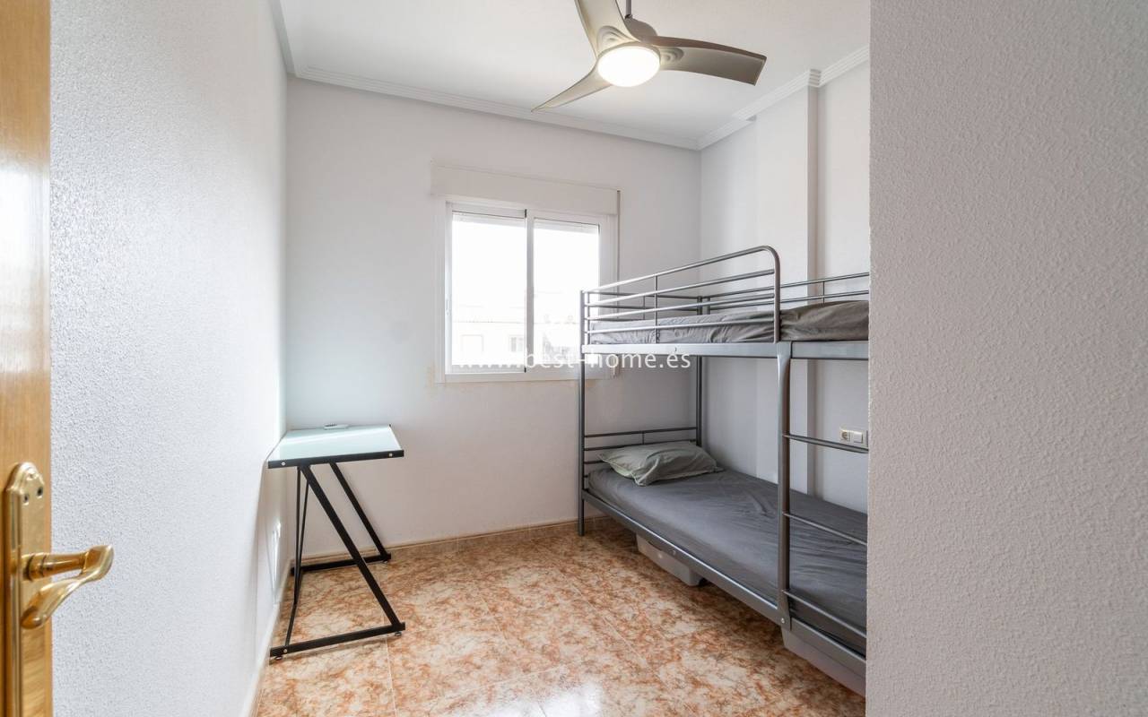 Penthouse with a large solarium, sea views, underground garage, and community pool in the Punta Prima urbanization. It features a bright, spacious living room with access to a sunny terrace, a separate kitchen equipped with appliances, two double bedrooms, including the master with an en-suite bathroom, and a second bathroom. Upstairs, there's a private solarium with sea views and a relaxation area. The apartment is furnished and equipped with air conditioning. An additional advantage is a parking space in the underground garage included in the price. The complex also features a residents' swimming pool. The beach is approximately 650 meters away. Nearby, you'll find numerous restaurants, cafes, and pastry shops.