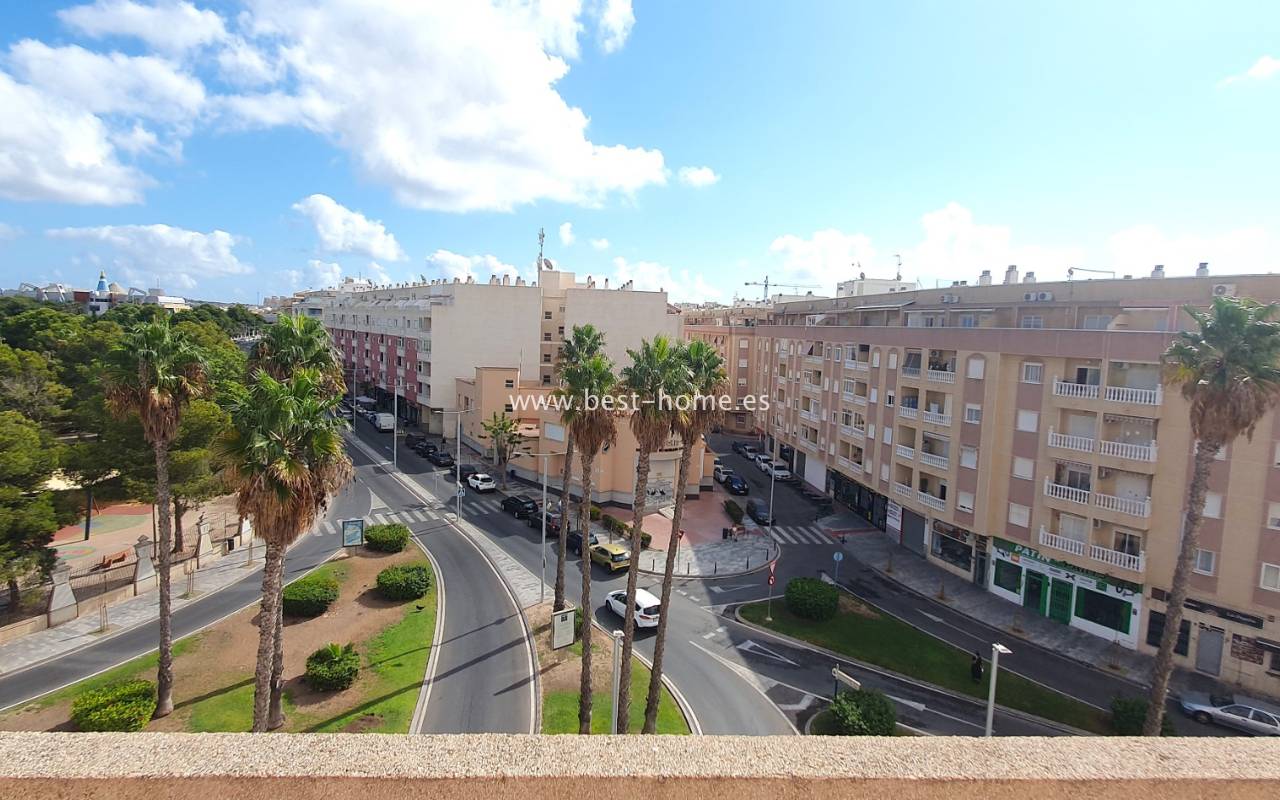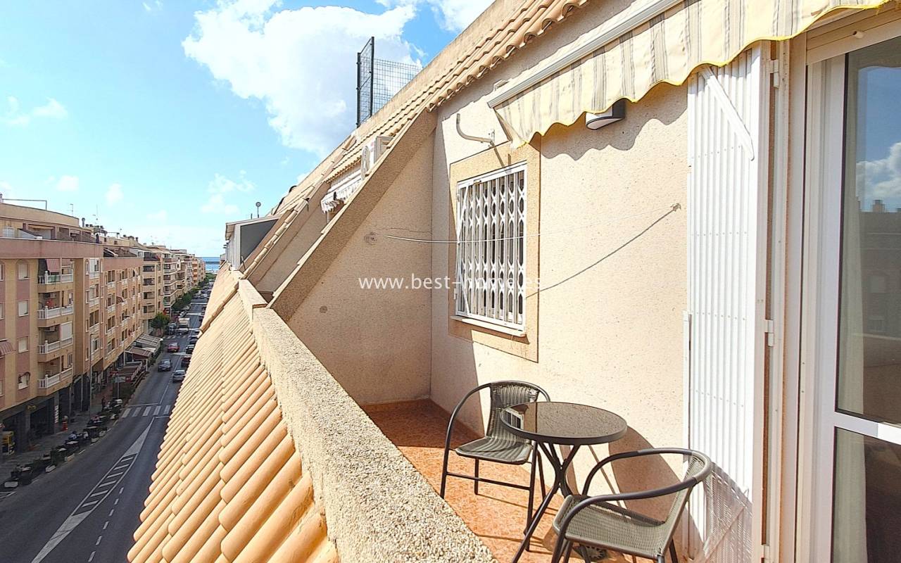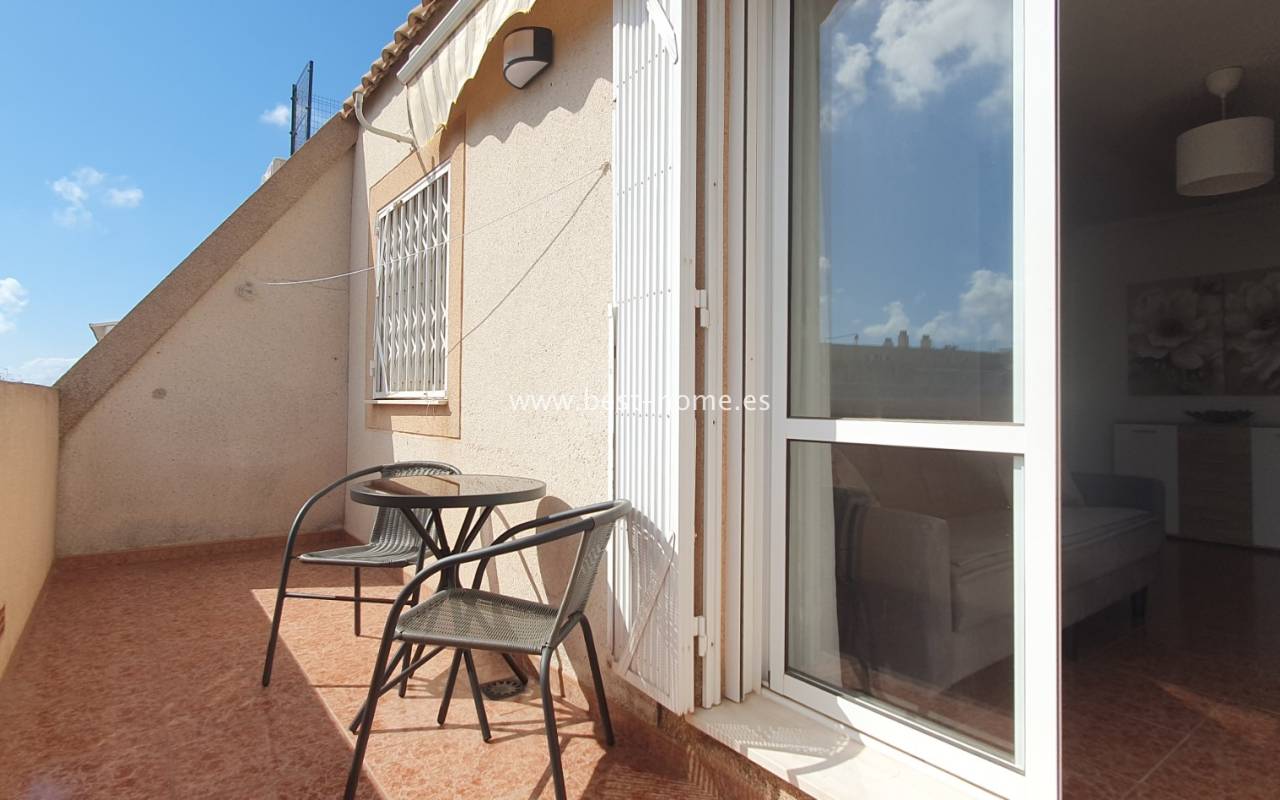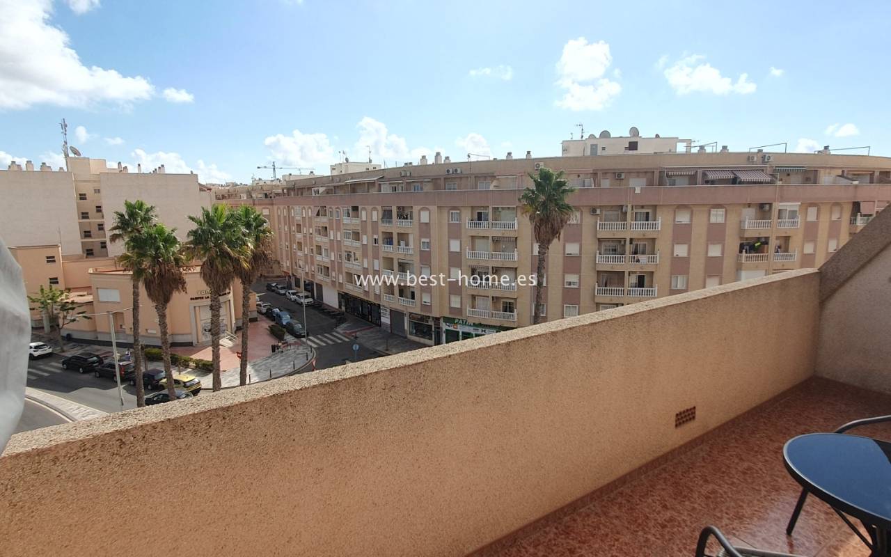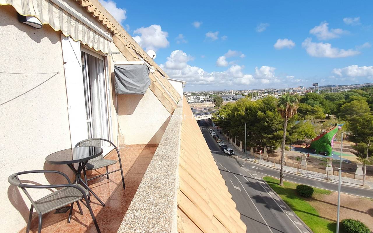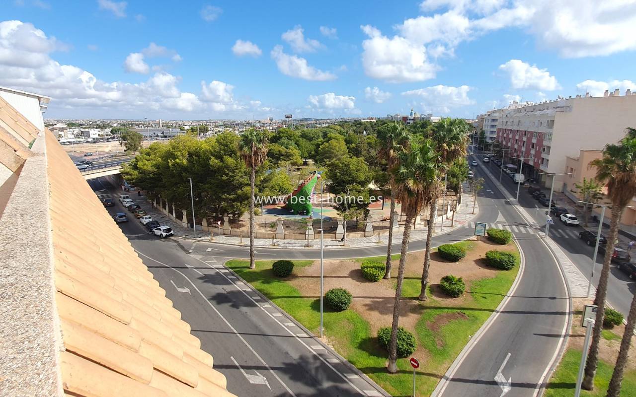 This penthouse is located next to the Nationes Park, offering side sea views and a community pool in Torrevieja. It features a living room with access to a terrace offering side sea views and a picturesque park, a separate kitchen equipped with appliances, two double bedrooms with fitted wardrobes, and a bathroom. The apartment is furnished and equipped with air conditioning. The complex also boasts a community swimming pool for residents, surrounded by a park with natural grass and trees. This property also boasts a tourist license. Numerous pubs, restaurants, and cafes are located nearby.