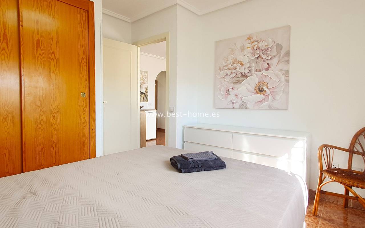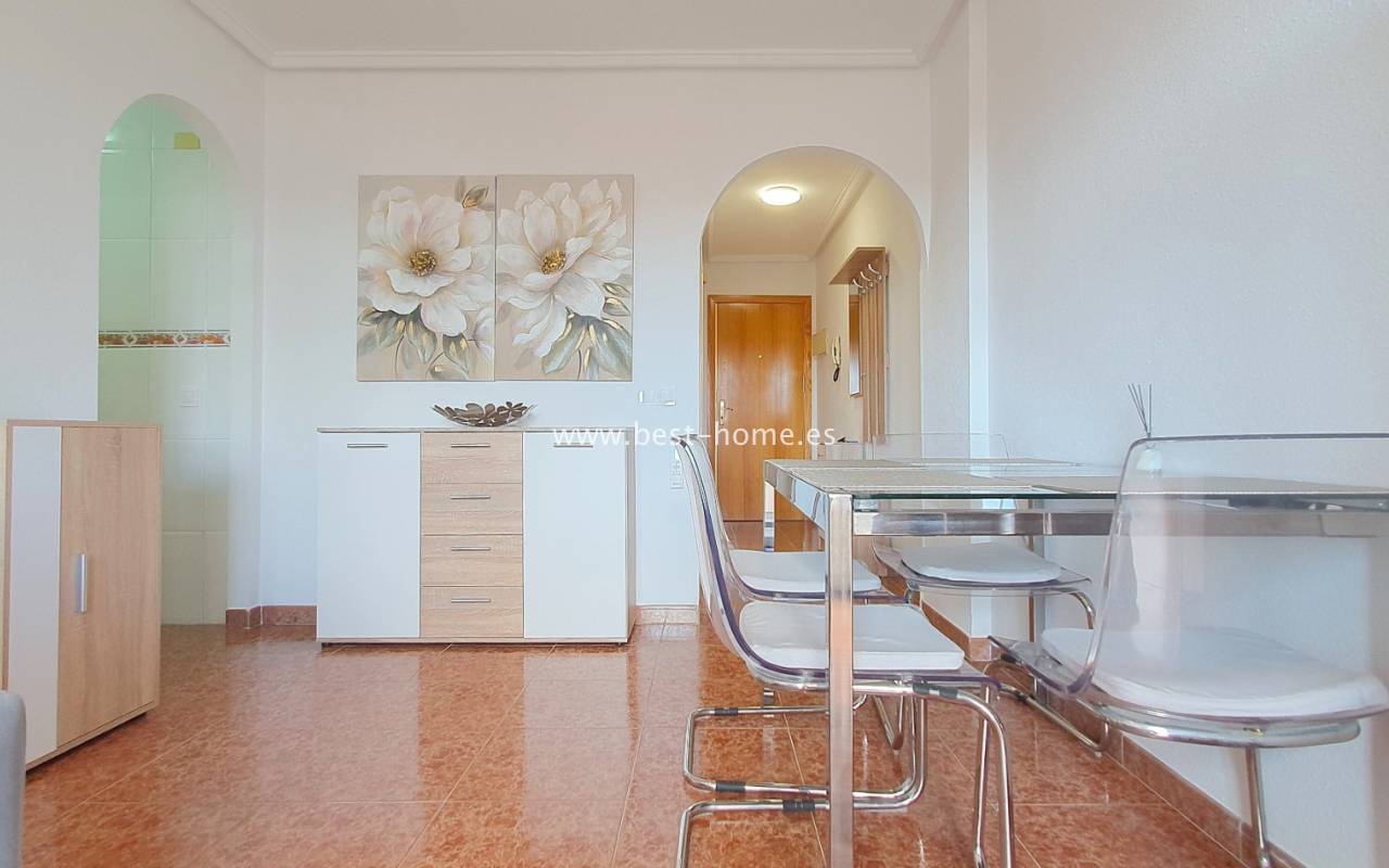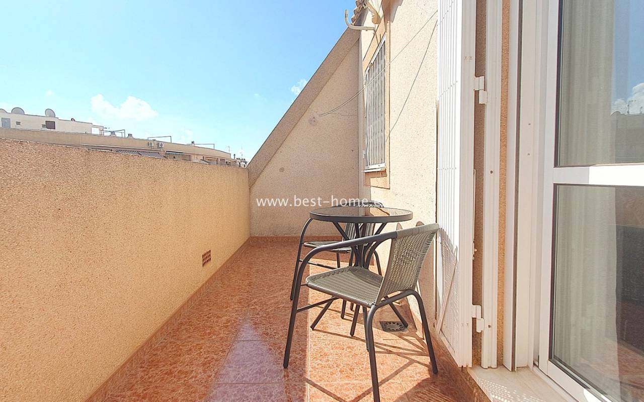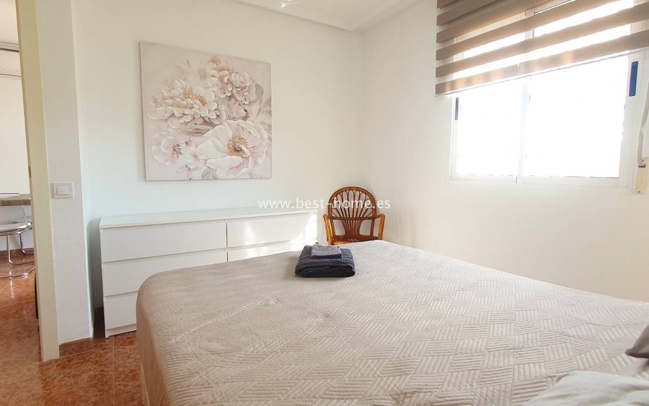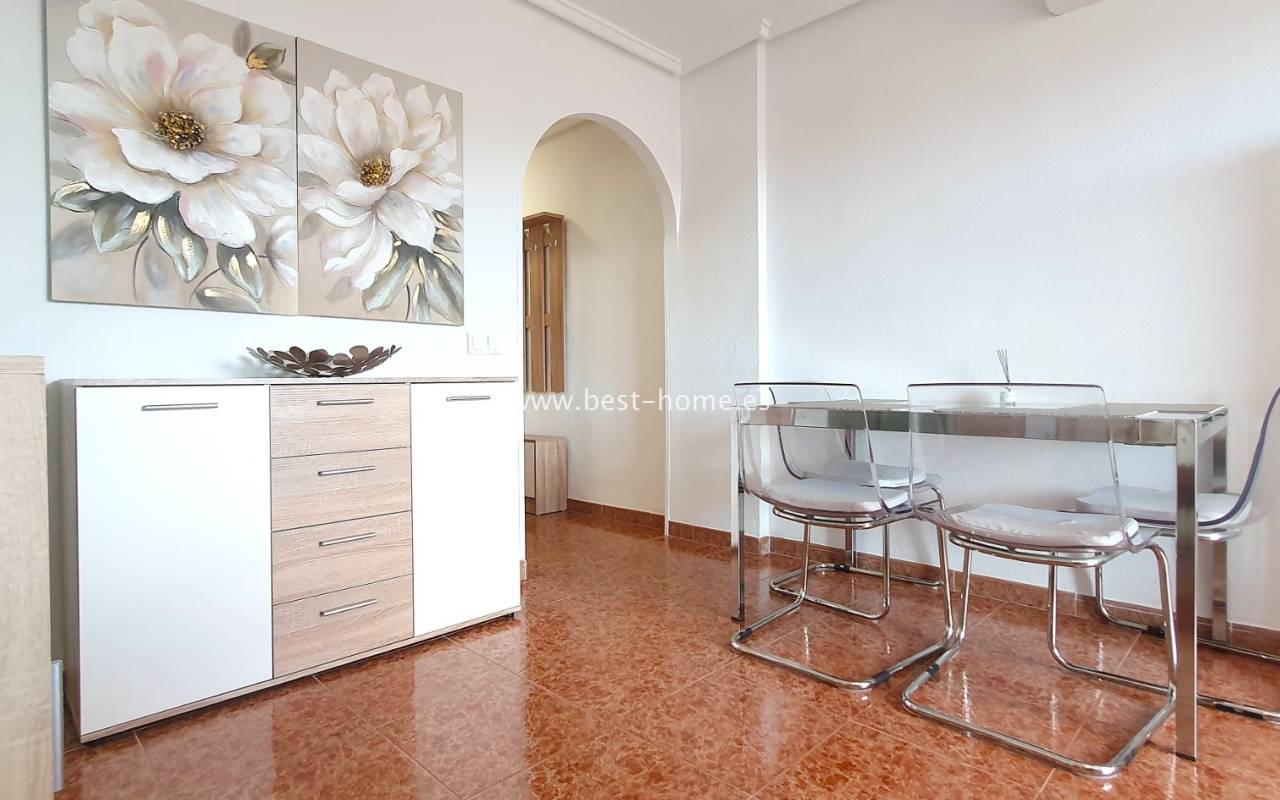 This penthouse is located next to the Nationes Park, offering side sea views and a community pool in Torrevieja. It features a living room with access to a terrace offering side sea views and a picturesque park, a separate kitchen equipped with appliances, two double bedrooms with fitted wardrobes, and a bathroom. The apartment is furnished and equipped with air conditioning. The complex also boasts a community swimming pool for residents, surrounded by a park with natural grass and trees. This property also boasts a tourist license. Numerous pubs, restaurants, and cafes are located nearby.