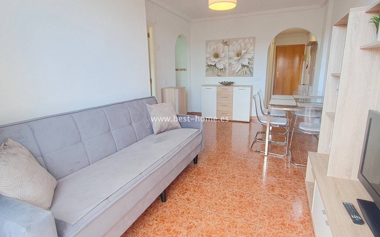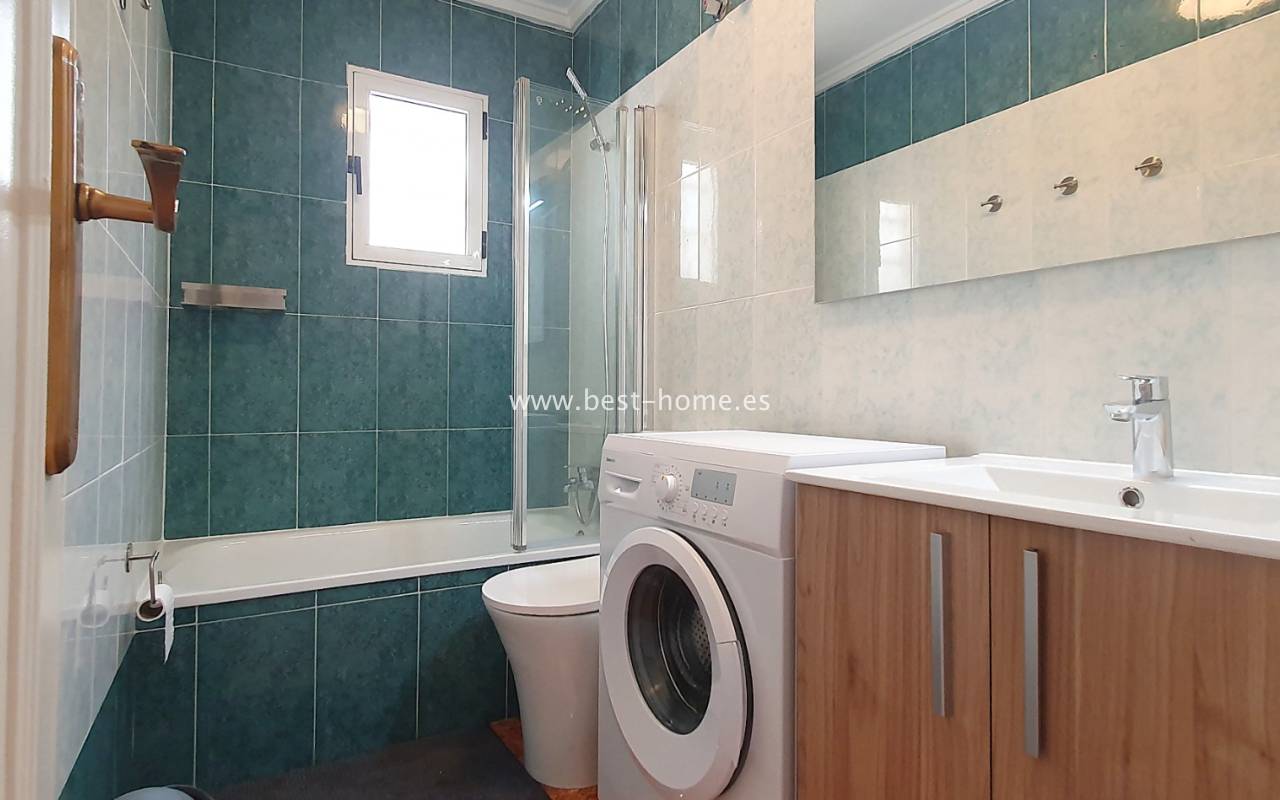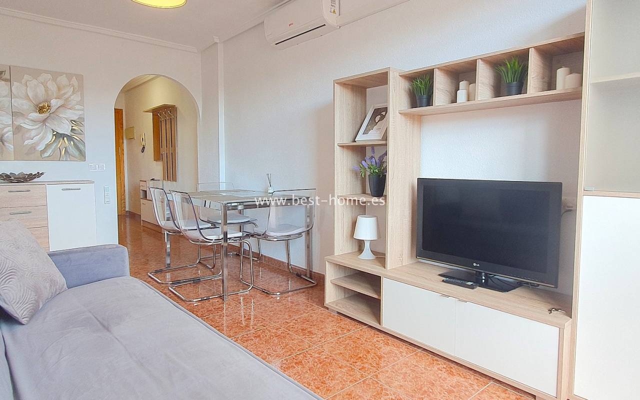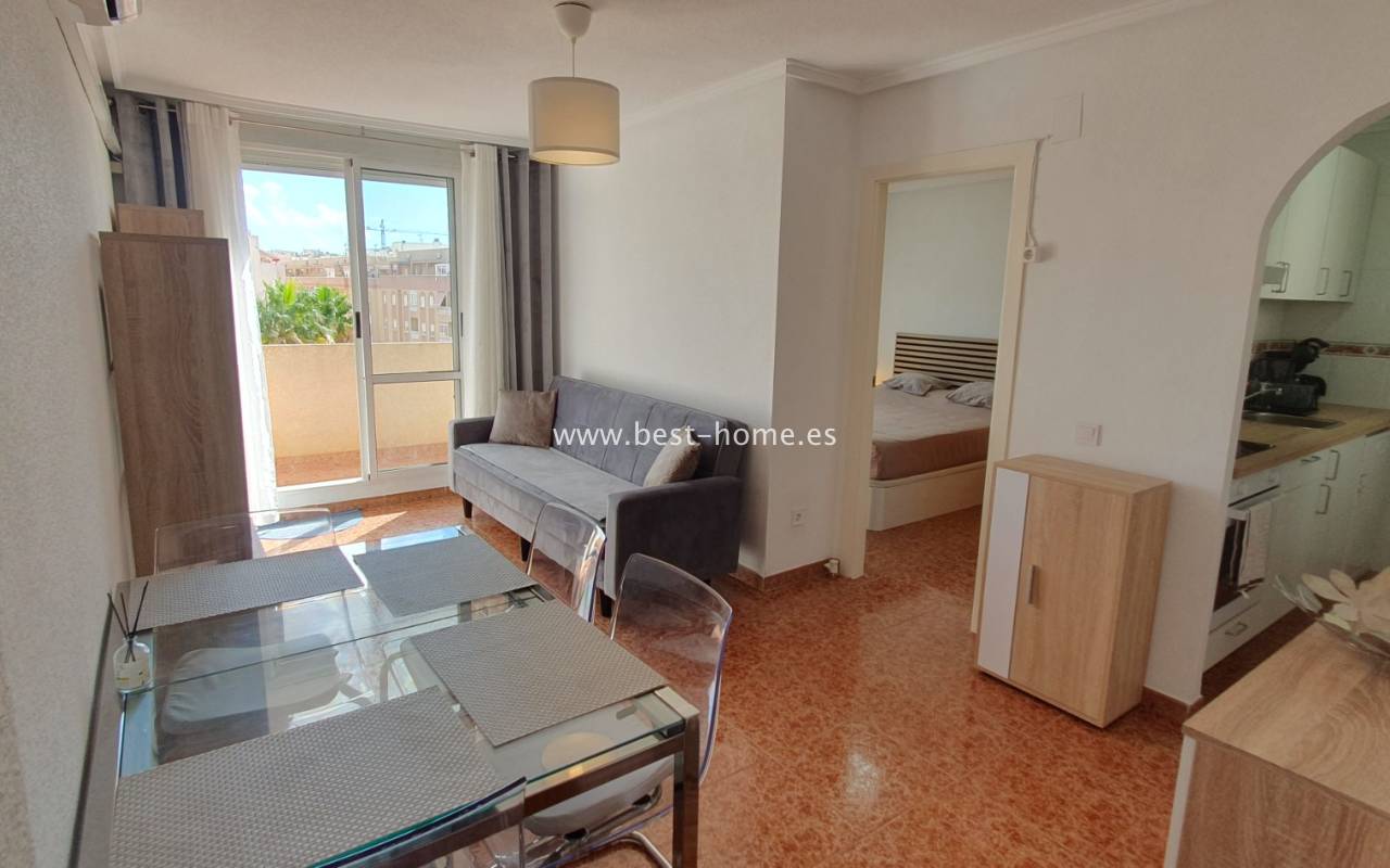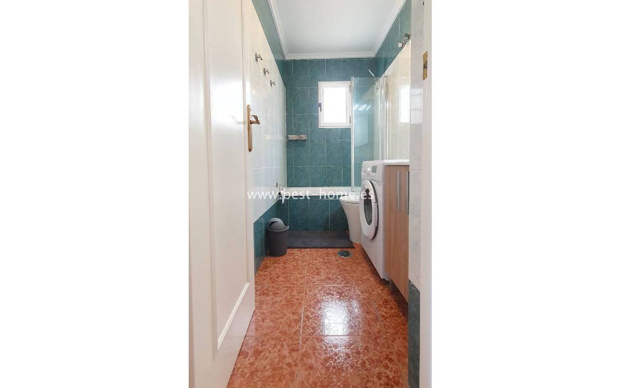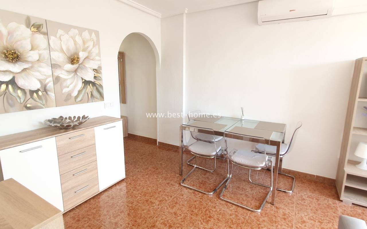 This penthouse is located next to the Nationes Park, offering side sea views and a community pool in Torrevieja. It features a living room with access to a terrace offering side sea views and a picturesque park, a separate kitchen equipped with appliances, two double bedrooms with fitted wardrobes, and a bathroom. The apartment is furnished and equipped with air conditioning. The complex also boasts a community swimming pool for residents, surrounded by a park with natural grass and trees. This property also boasts a tourist license. Numerous pubs, restaurants, and cafes are located nearby.
