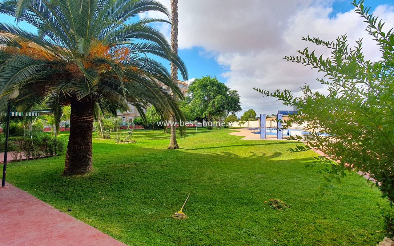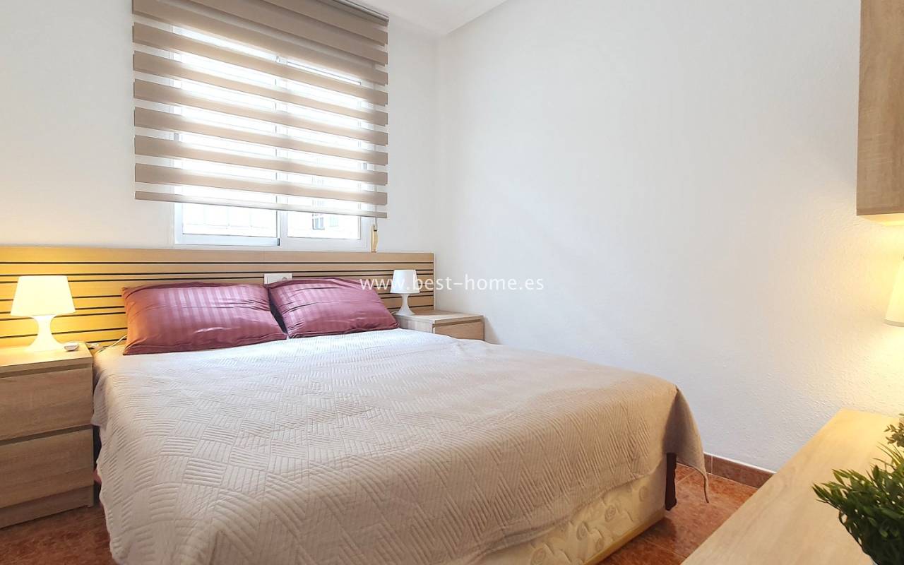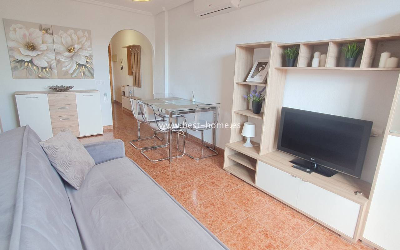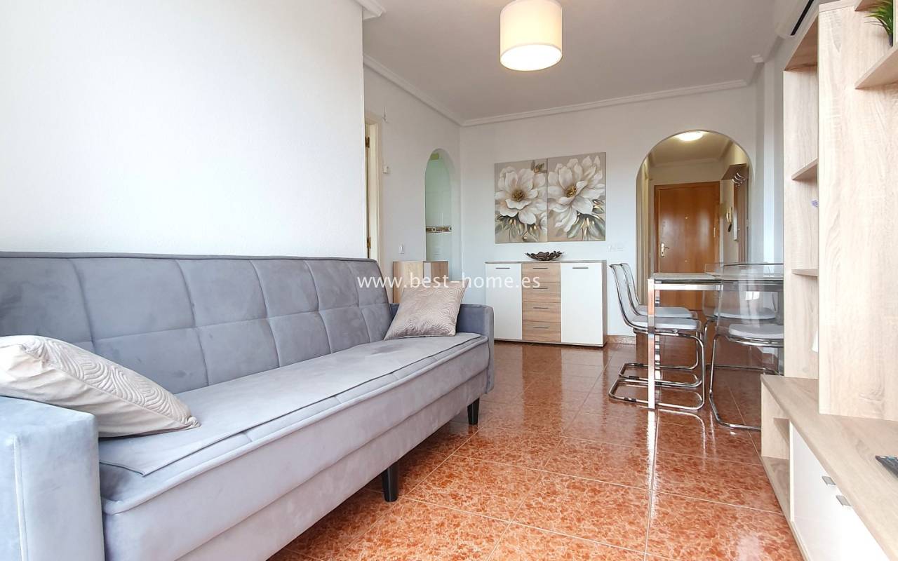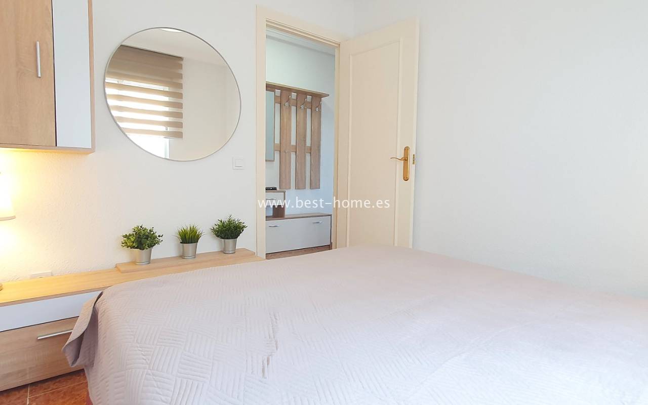This penthouse is located next to the Nationes Park, offering side sea views and a community pool in Torrevieja. It features a living room with access to a terrace offering side sea views and a picturesque park, a separate kitchen equipped with appliances, two double bedrooms with fitted wardrobes, and a bathroom. The apartment is furnished and equipped with air conditioning. The complex also boasts a community swimming pool for residents, surrounded by a park with natural grass and trees. This property also boasts a tourist license. Numerous pubs, restaurants, and cafes are located nearby.