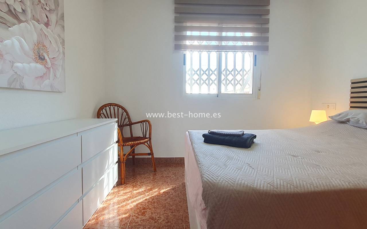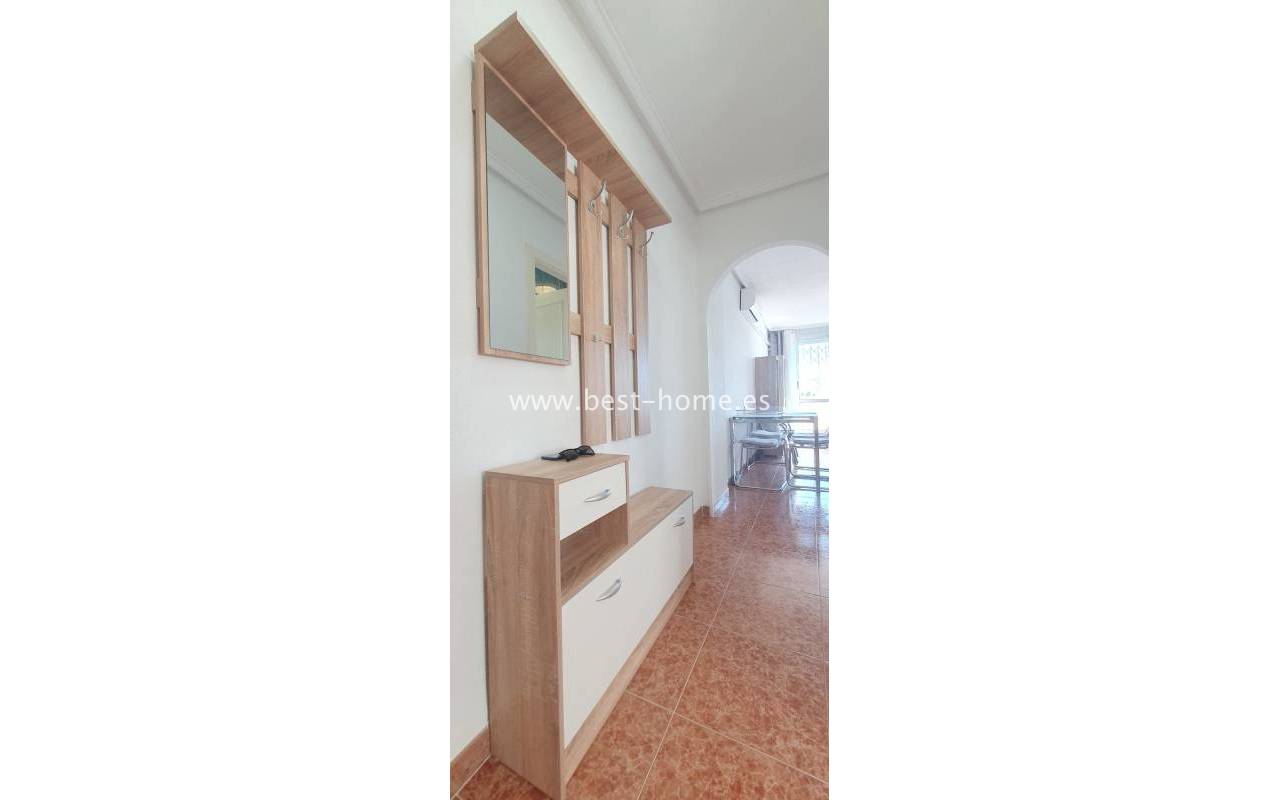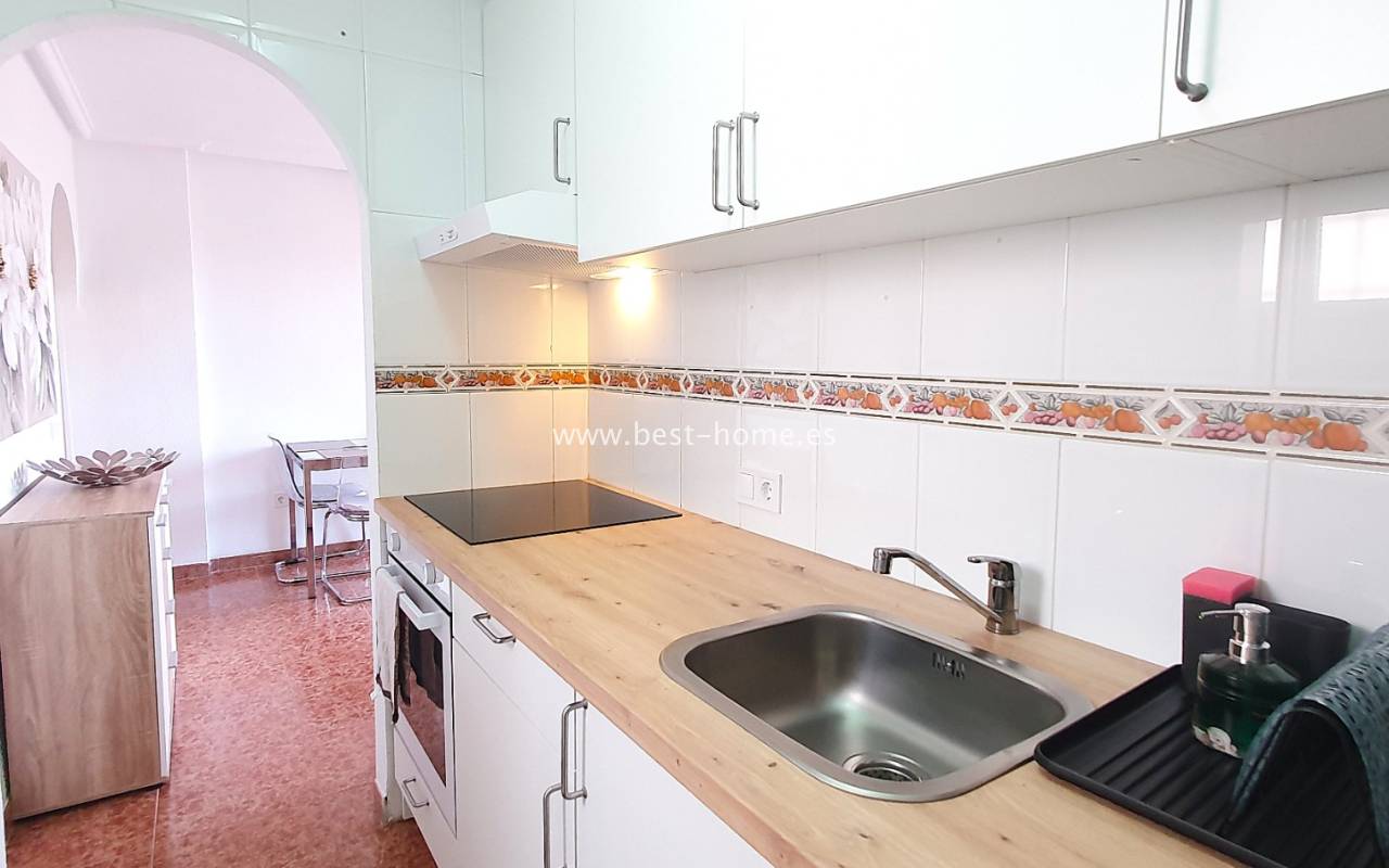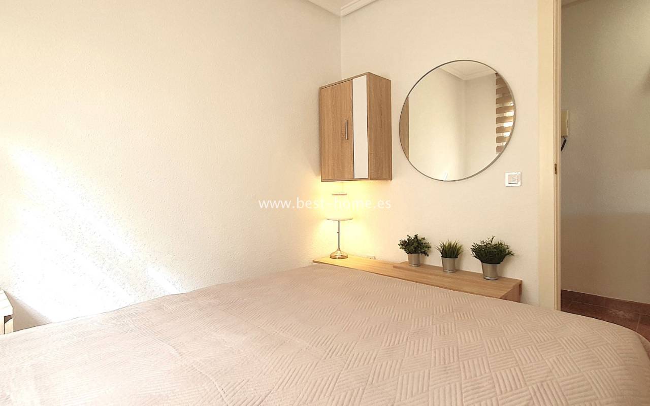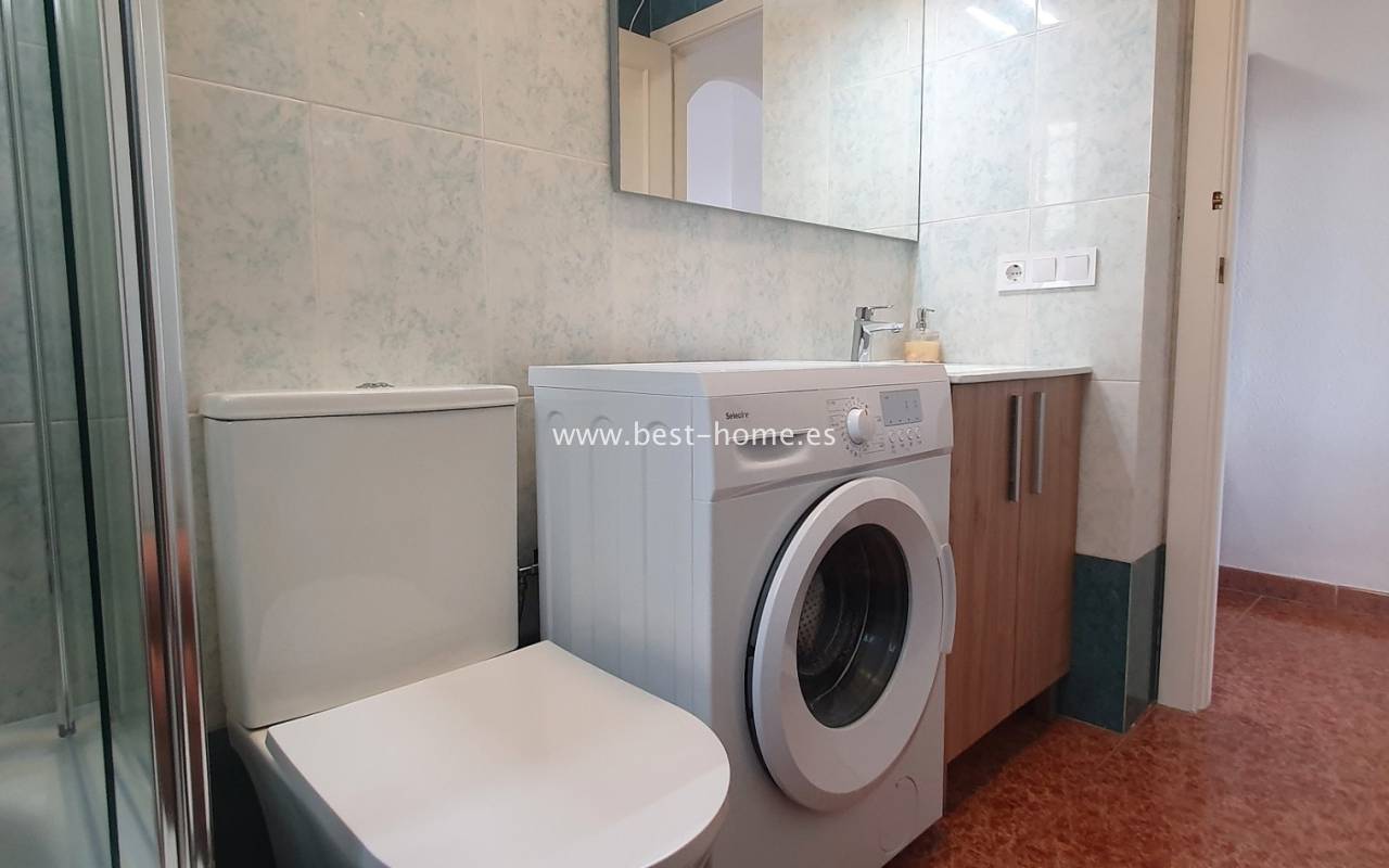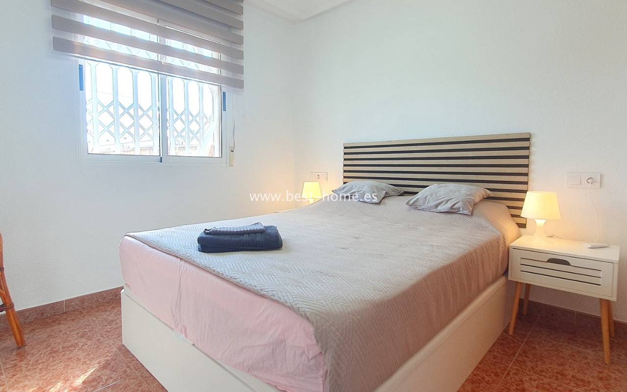This penthouse is located next to the Nationes Park, offering side sea views and a community pool in Torrevieja. It features a living room with access to a terrace offering side sea views and a picturesque park, a separate kitchen equipped with appliances, two double bedrooms with fitted wardrobes, and a bathroom. The apartment is furnished and equipped with air conditioning. The complex also boasts a community swimming pool for residents, surrounded by a park with natural grass and trees. This property also boasts a tourist license. Numerous pubs, restaurants, and cafes are located nearby.