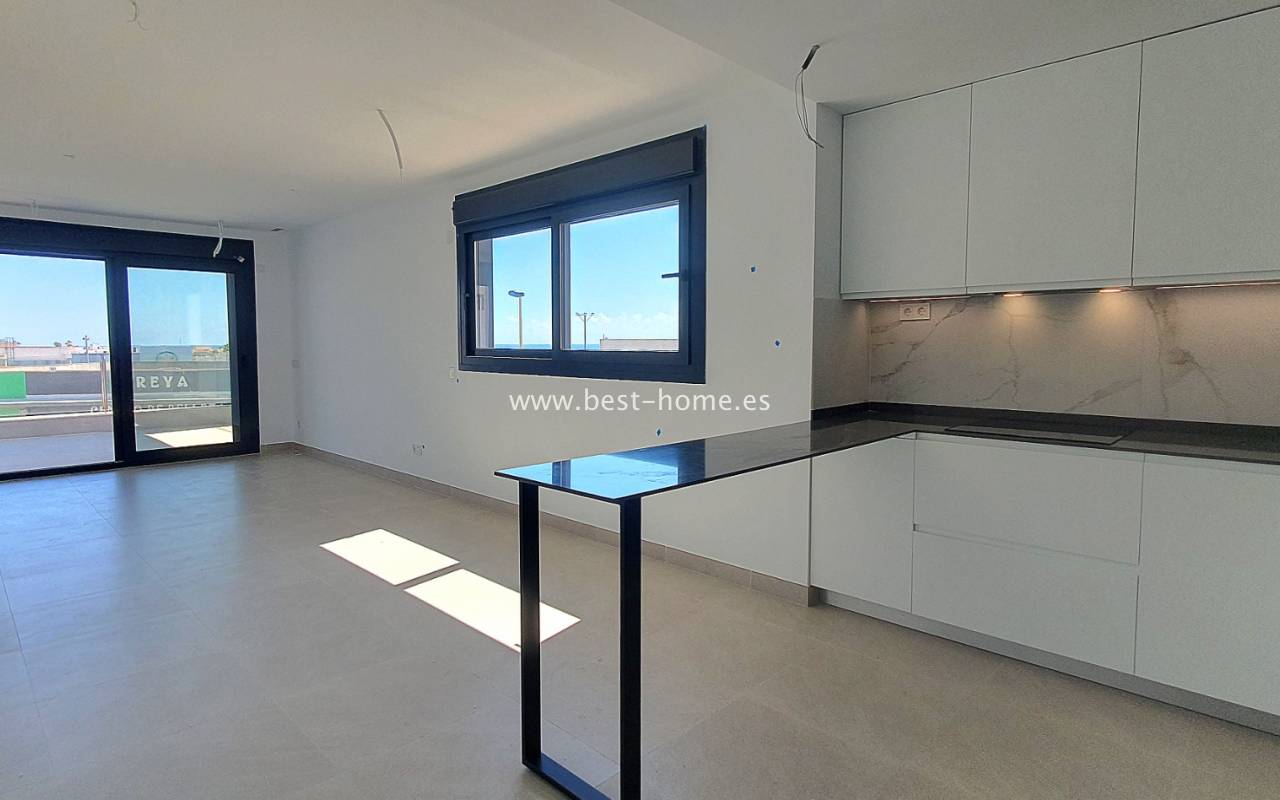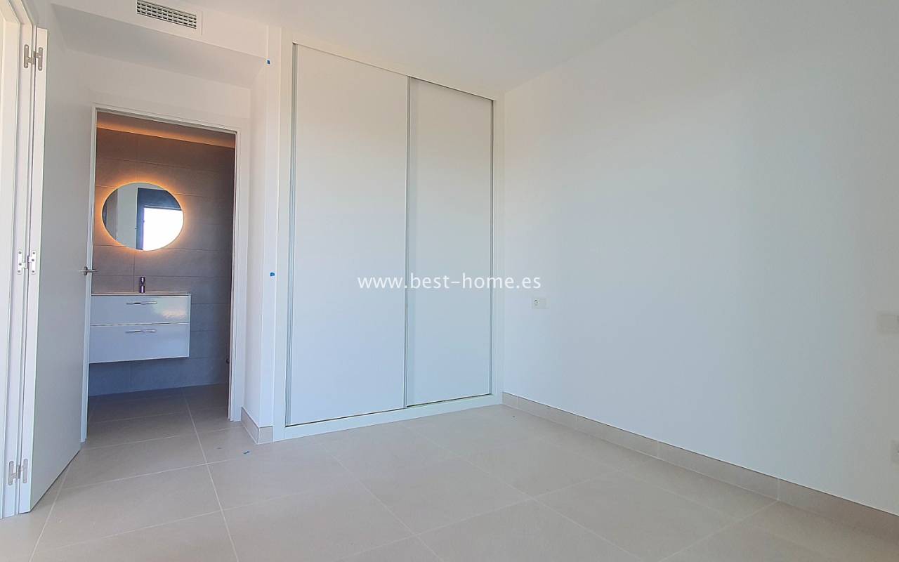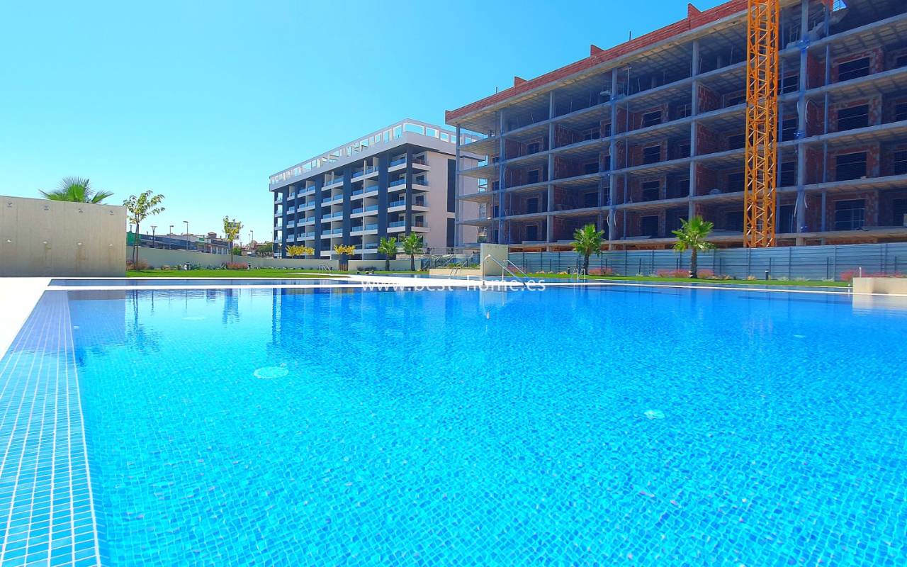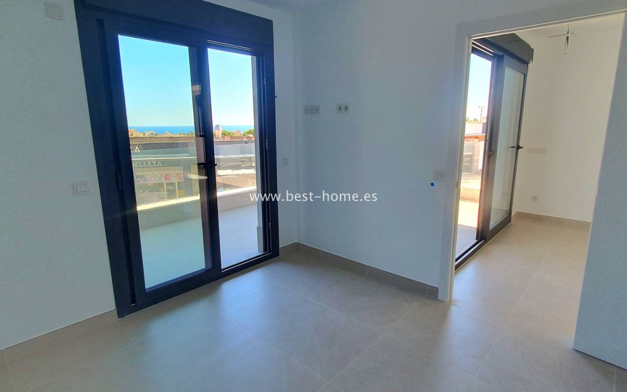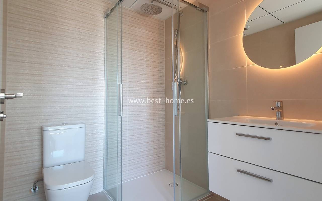For sale is a modern apartment in a newly developing residential complex in the Aguas Nuevas district of Torrevieja. The property is located on the second floor and consists of two bedrooms and two bathrooms, one of which is directly connected to the master bedroom. The master bedroom has access to a spacious 20 m² terrace, while the living room also opens onto the terrace, offering a view of the sea.