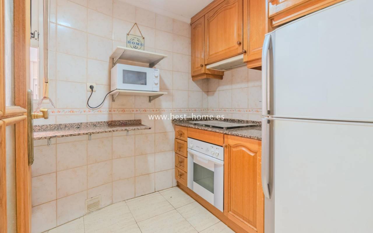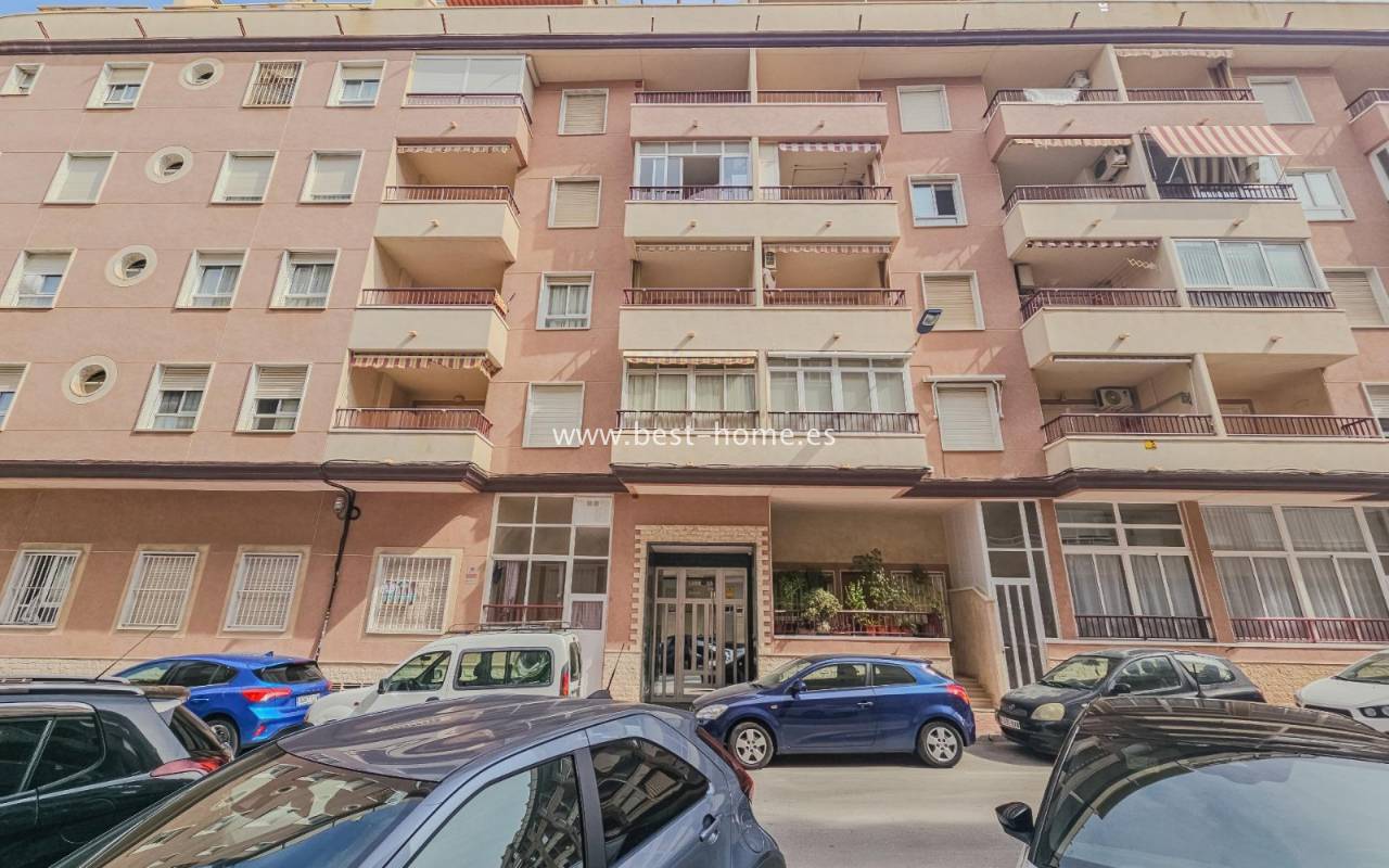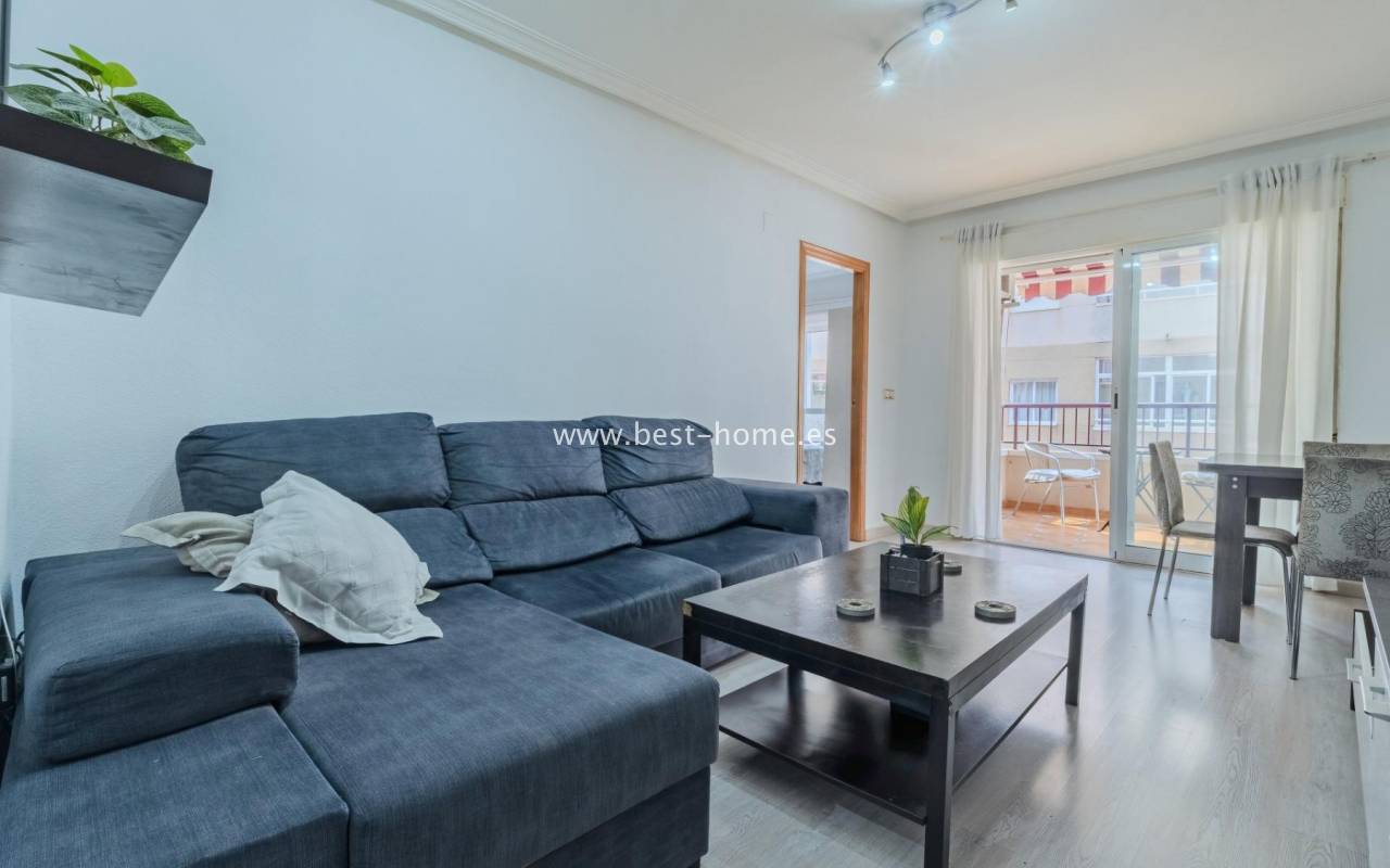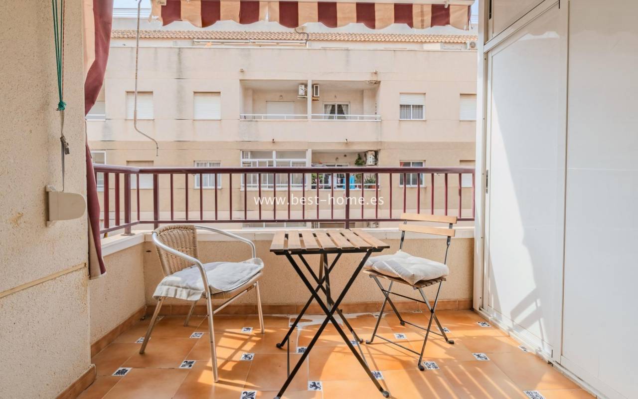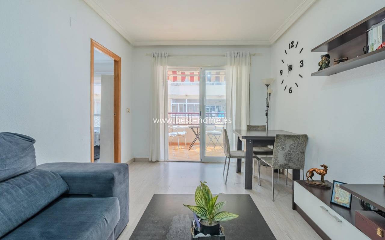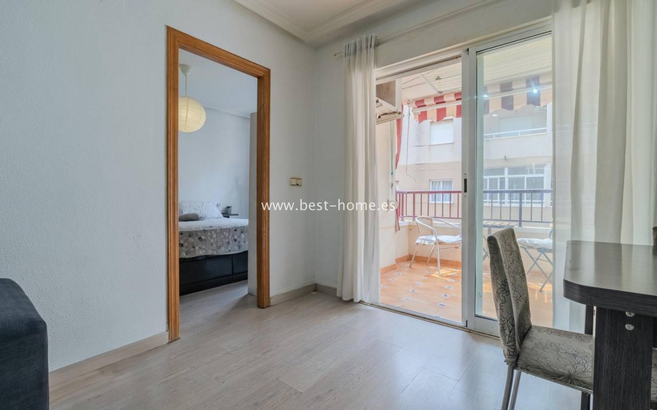 Sunny, affordable third-floor apartment near Naciones Park in Torrevieja. It features a bright, spacious living room with access to a south-facing terrace and built-in wardrobe, two double bedrooms, a kitchen equipped with appliances, and a bathroom. The apartment is furnished and equipped with appliances. Nearby are the picturesque Naciones Park, a shopping mall, and a wide selection of shops, bars, and restaurants.