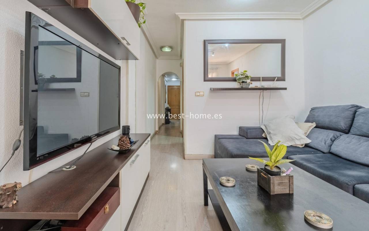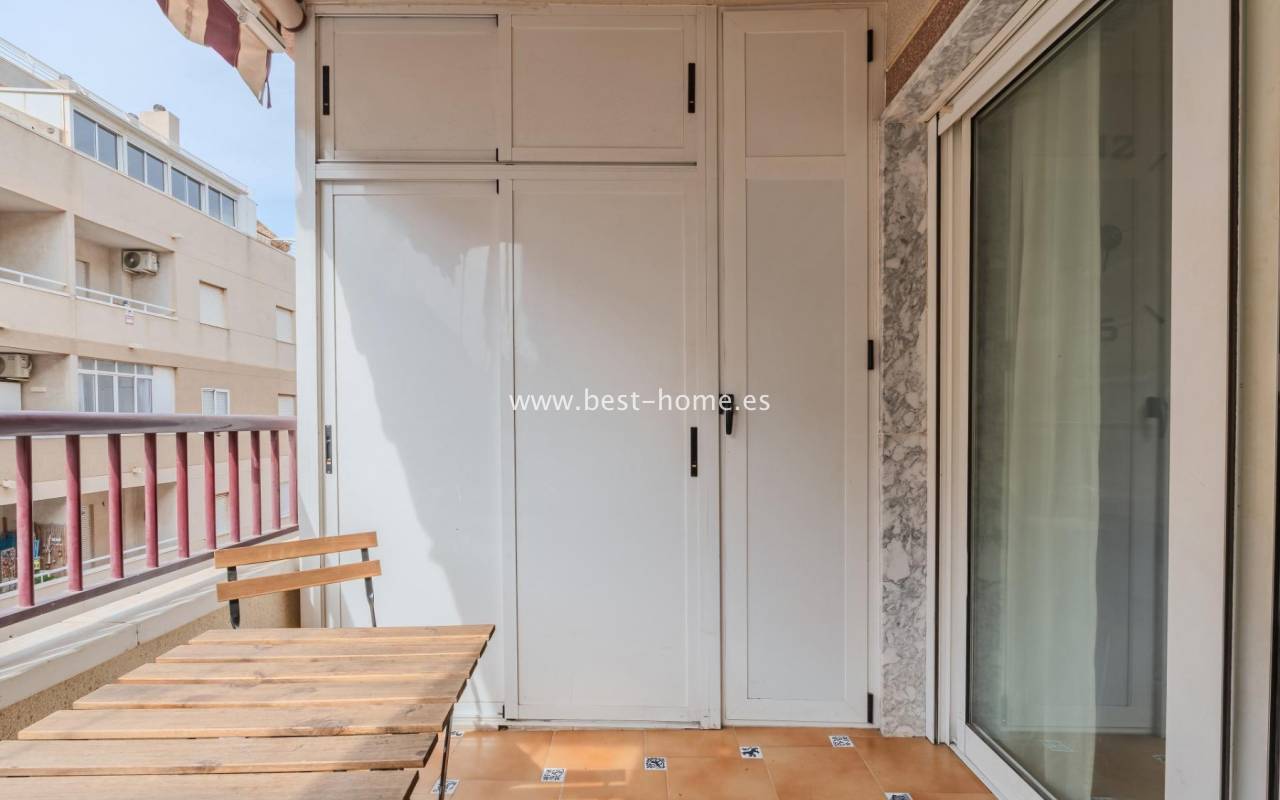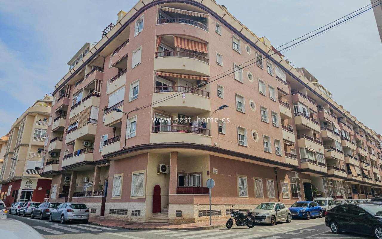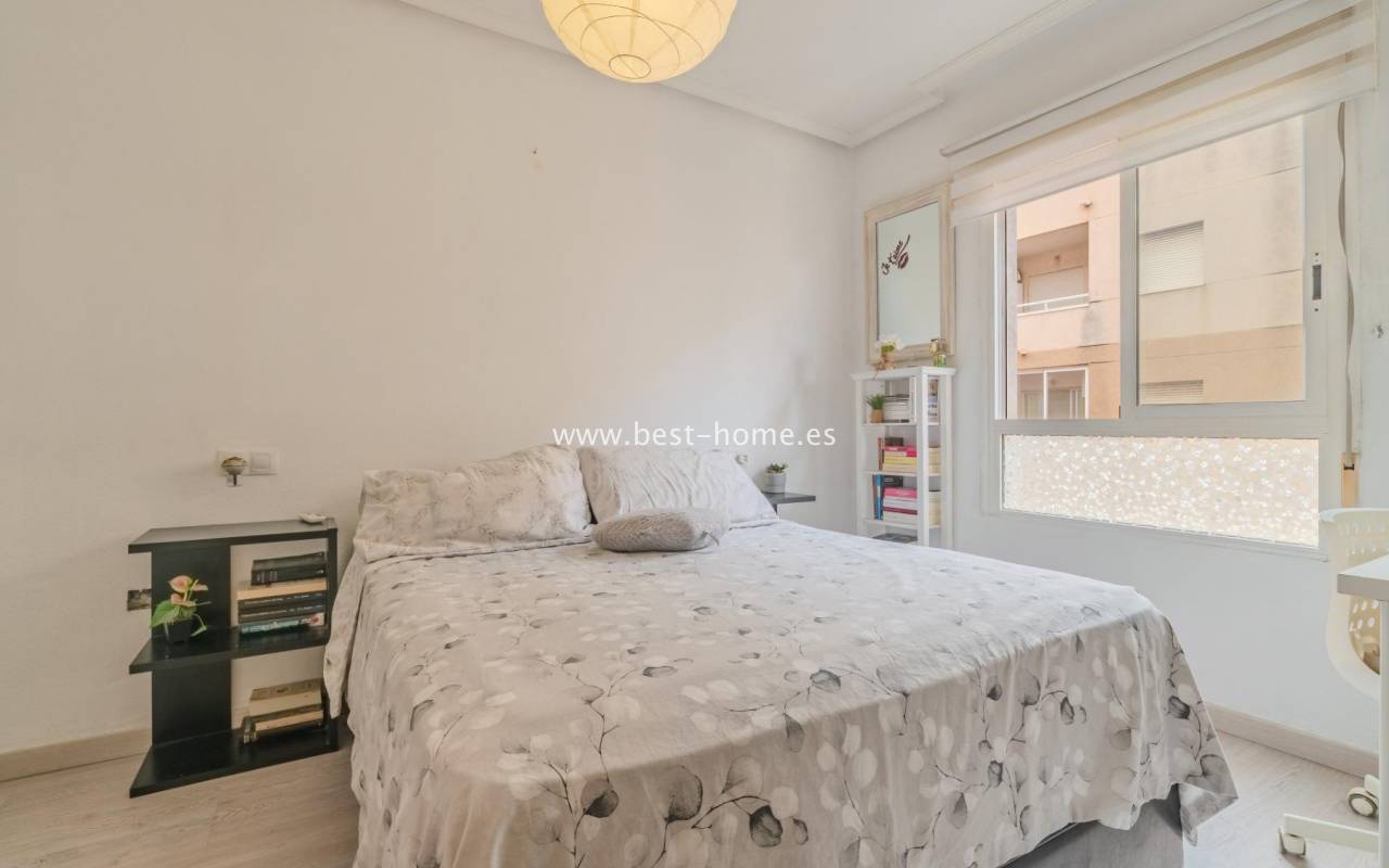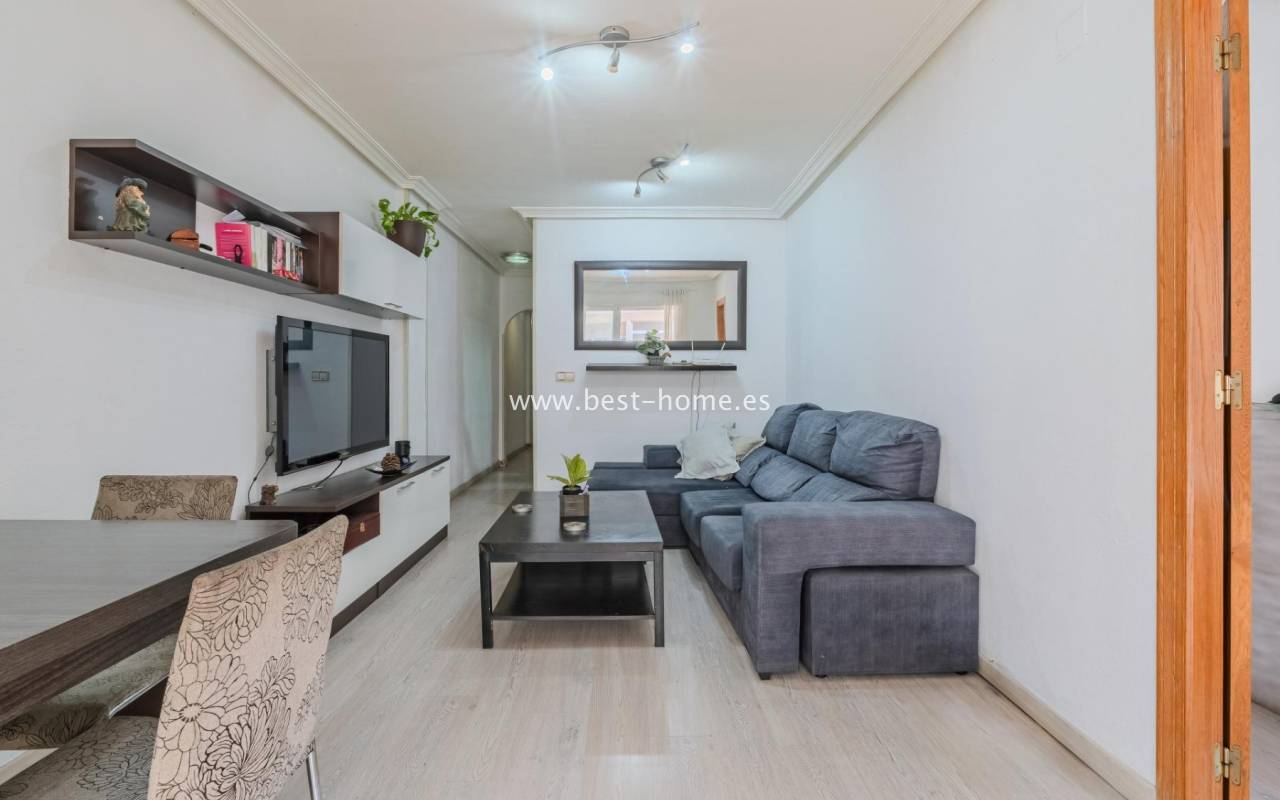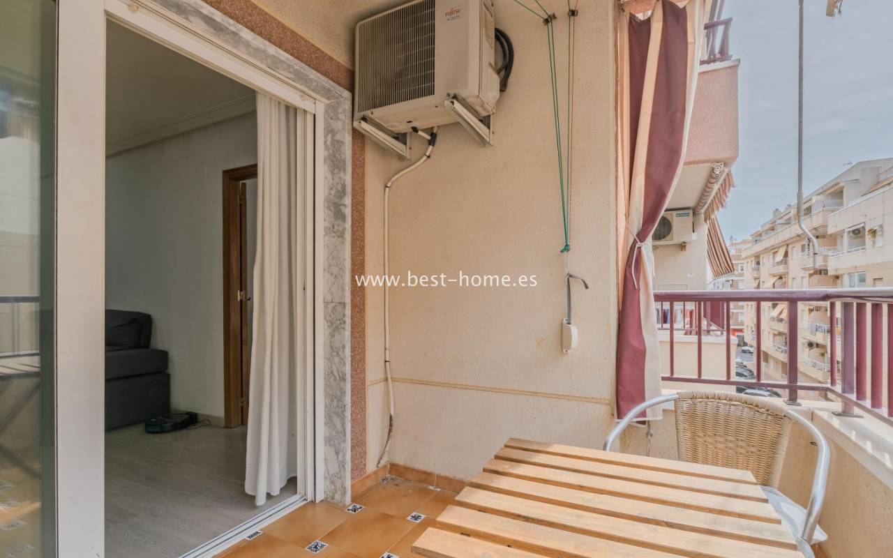Sunny, affordable third-floor apartment near Naciones Park in Torrevieja. It features a bright, spacious living room with access to a south-facing terrace and built-in wardrobe, two double bedrooms, a kitchen equipped with appliances, and a bathroom. The apartment is furnished and equipped with appliances. Nearby are the picturesque Naciones Park, a shopping mall, and a wide selection of shops, bars, and restaurants.