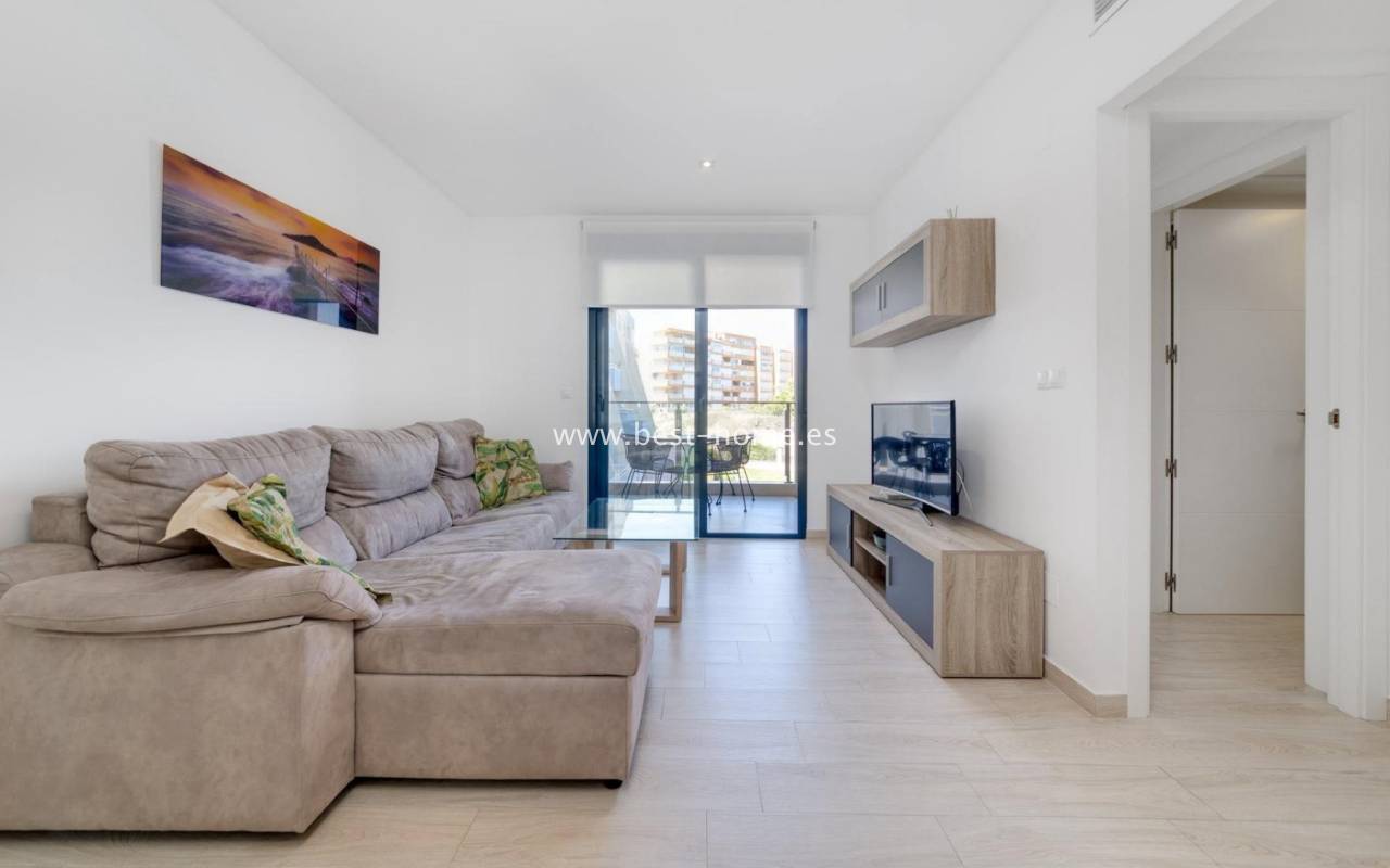A fantastic sea-view apartment in a modern, first-line development with a community pool in La Mata. It features a living room with access to a large terrace overlooking the Mediterranean Sea, dunes, and pine forest. The apartment also features a large kitchen equipped with high-quality appliances, two double bedrooms with built-in wardrobes, the master bedroom with a sea view, and two bathrooms. The complex boasts a beautiful swimming pool for residents. A picturesque sandy beach with a promenade is 100 meters away. The excellent location makes this property ideal for both permanent residence and rental investment.