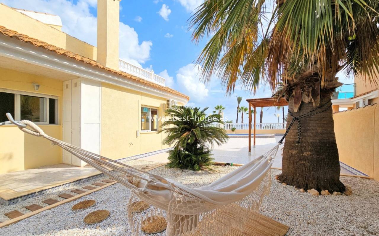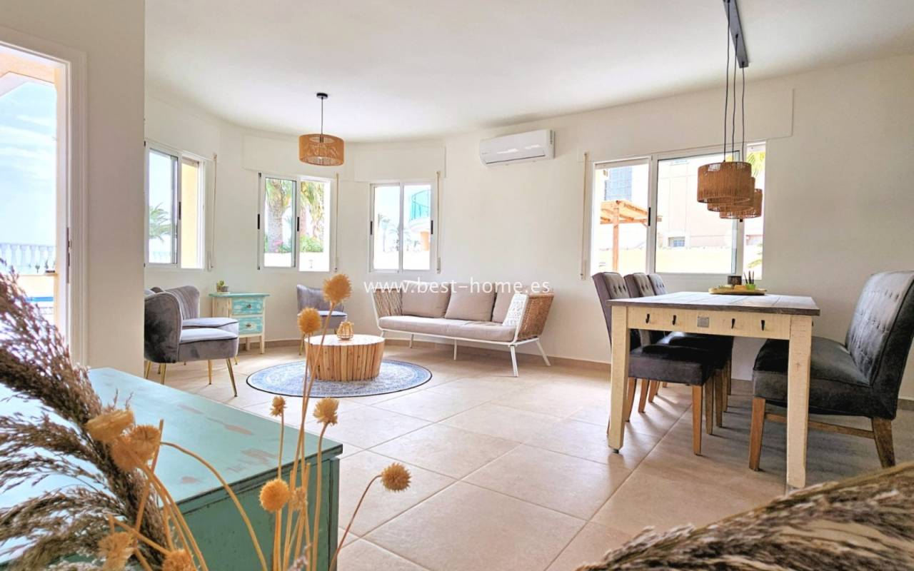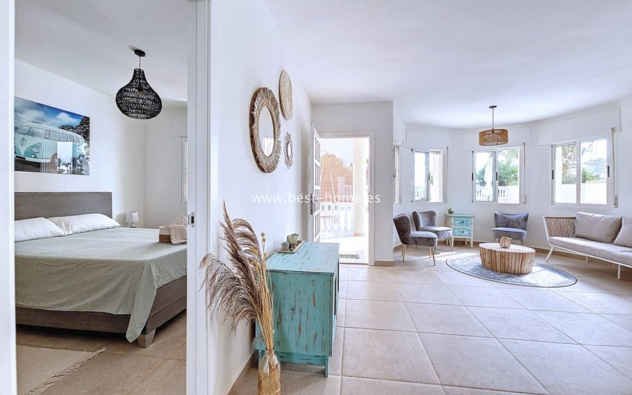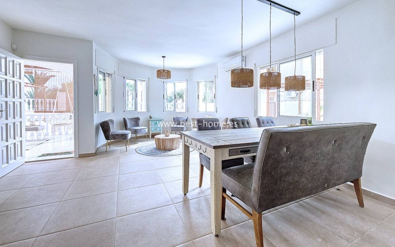 This extraordinary villa is located in the cosy neighbourhood of "Estrella de Mar", a quiet area among greenery right on the beach of the Mar Menor!
