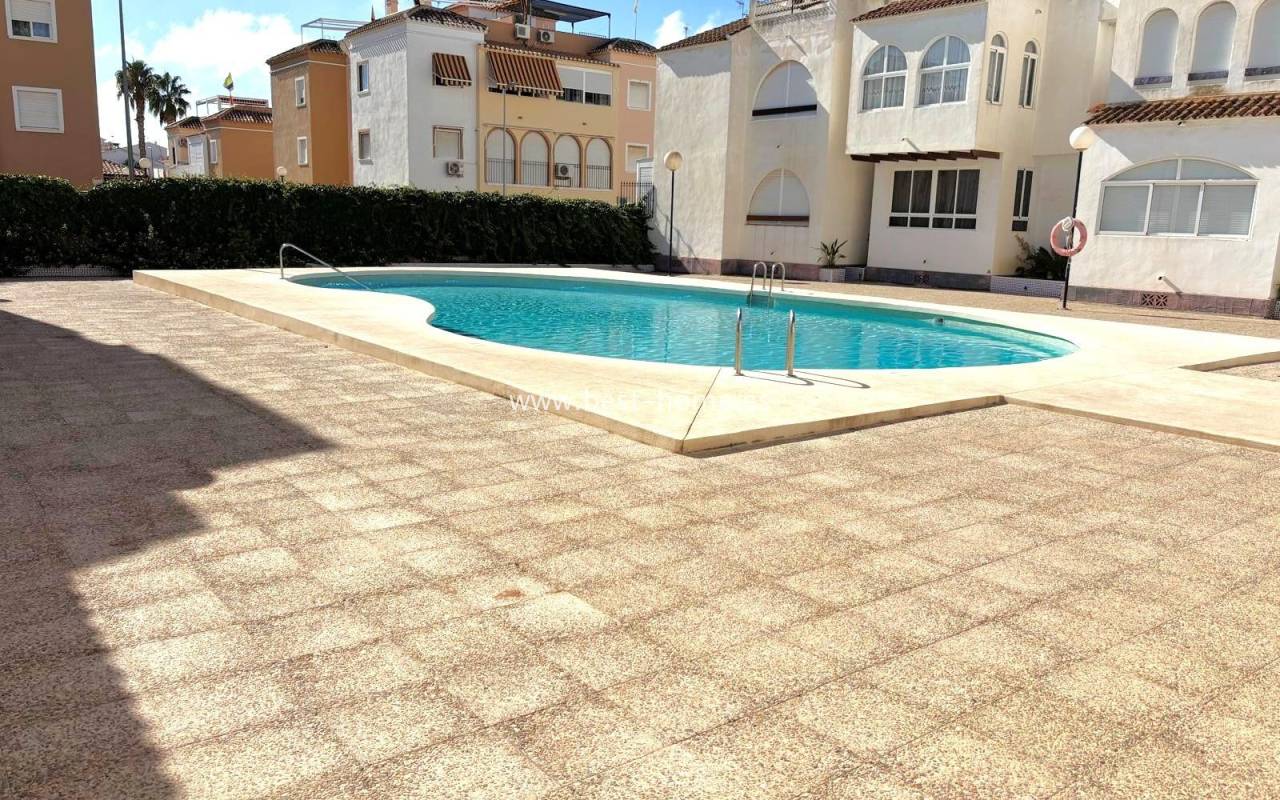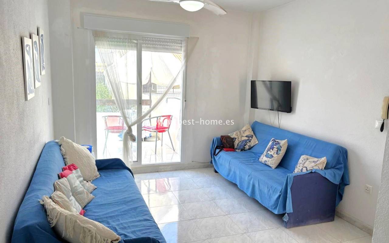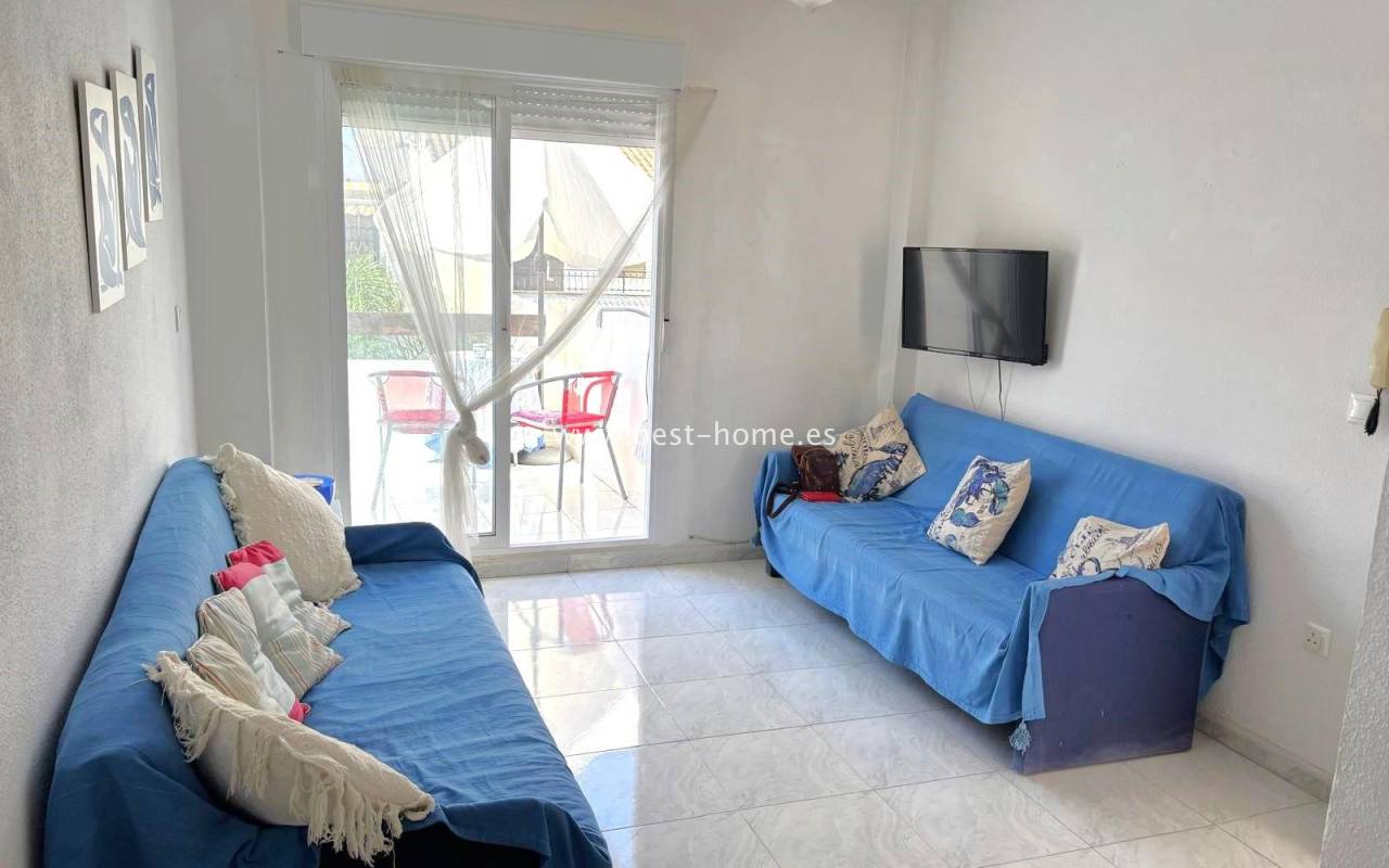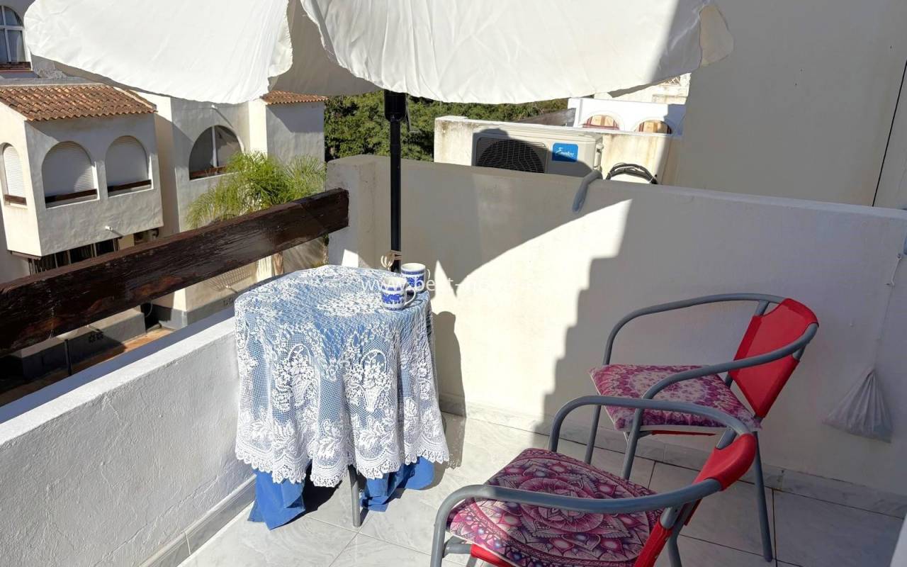 A sunny penthouse in a picturesque Mediterranean-style development with a community pool. It features a living room with access to a terrace overlooking the patio, palm trees, and park, an American-style kitchen equipped with appliances, one double bedroom, and a bathroom. The development also boasts a residents' swimming pool. Nearby, you'll find bars, restaurants, a Dialprix grocery store, a bakery, and a pharmacy.