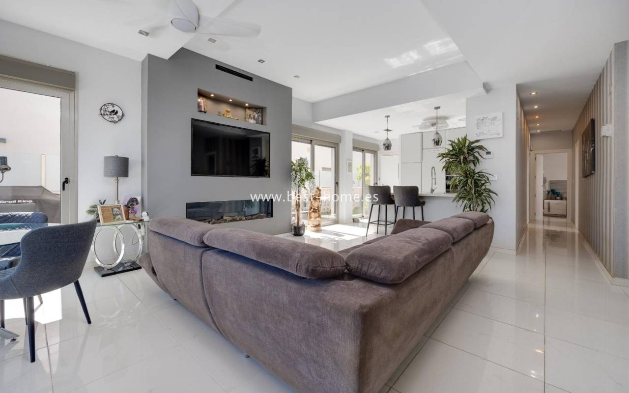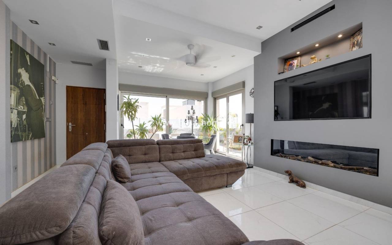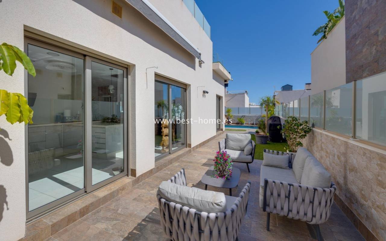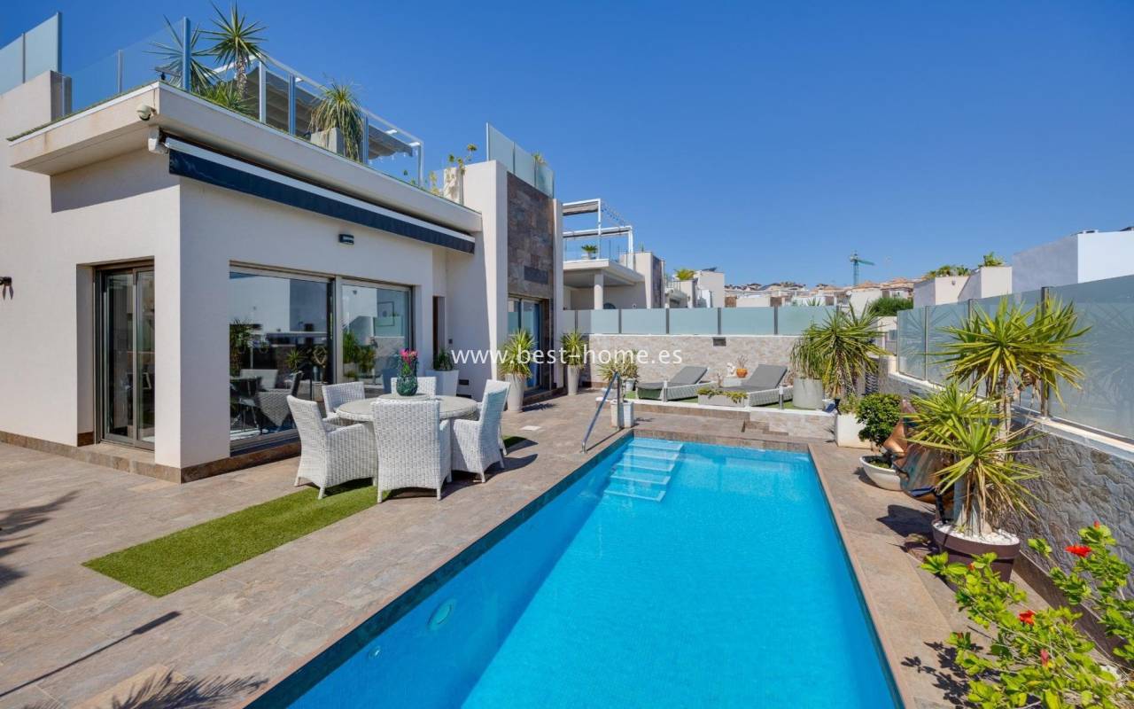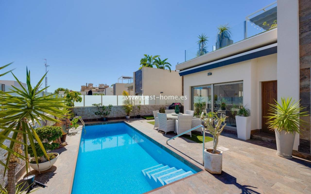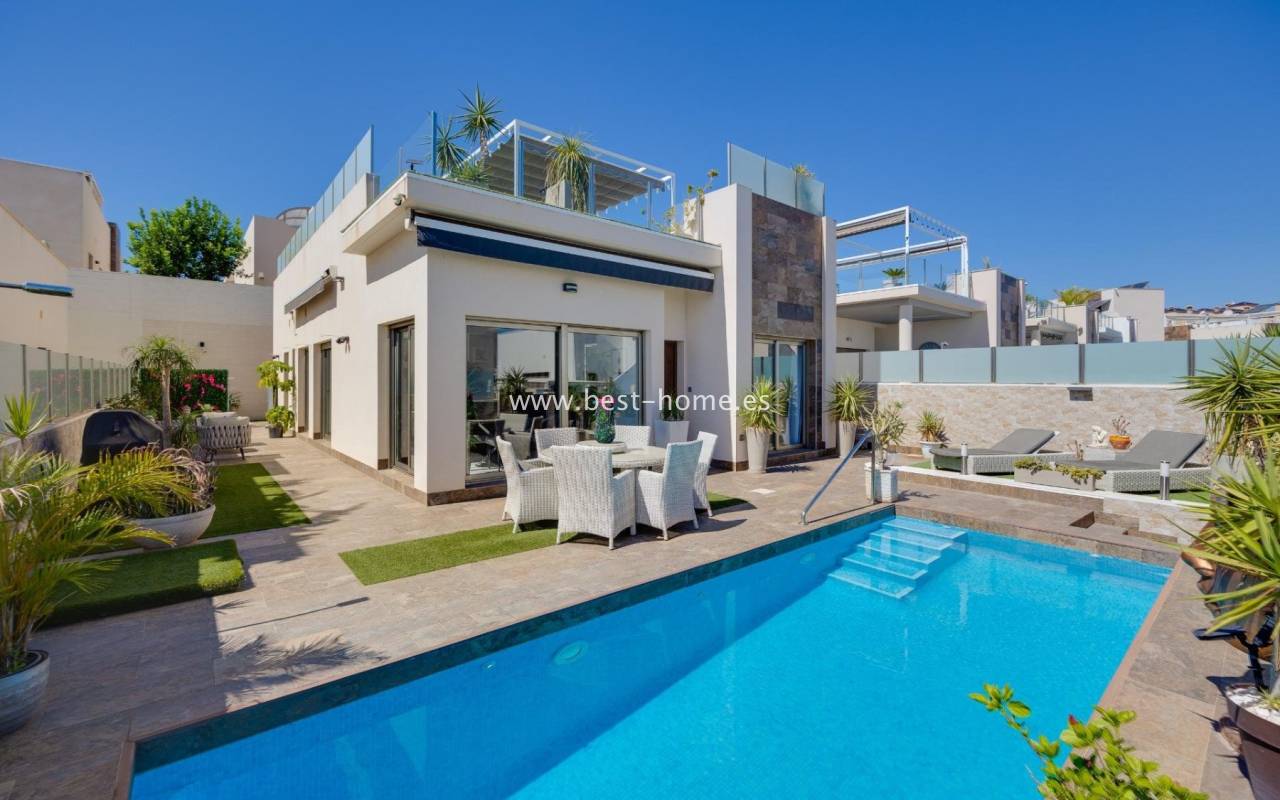 We present a unique single-level villa, built in 2017, meticulously maintained and in excellent condition. The property is situated on a 328 m² plot, with a built area of 124 m², featuring four spacious bedrooms and three modern bathrooms. The interior is filled with natural light, as the entire home faces outward. The villa includes a private swimming pool, electric awnings for comfort on sunny days, on-site parking, beautiful gardens, and a large solarium of approximately 100 m², perfect for entertaining friends and relaxing under the Spanish sun. The property is sold fully furnished and equipped. It is located in the Villamartin Hills area, close to various amenities – Zenia Boulevard is just a five-minute drive away, and Orihuela Costa beaches are around ten minutes by car.