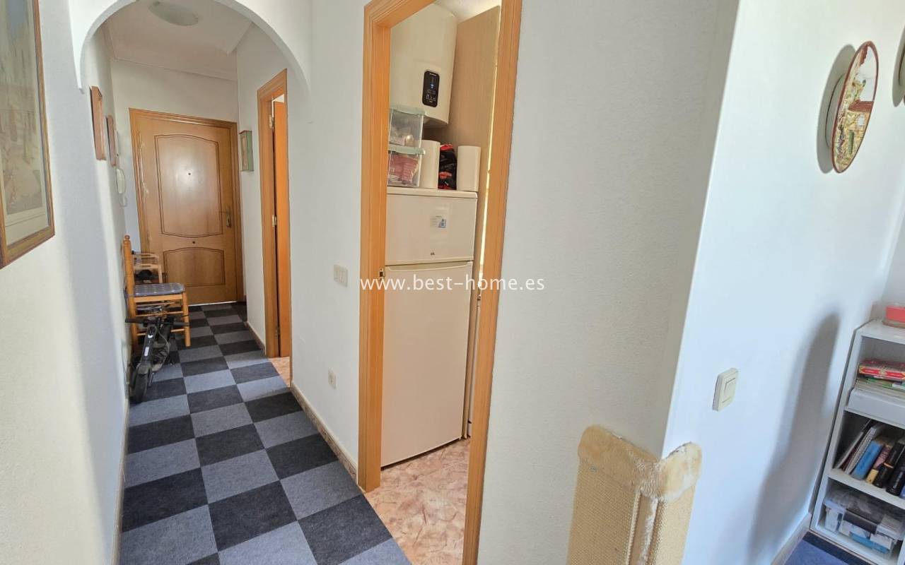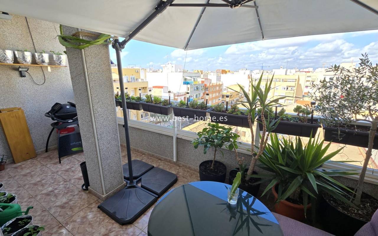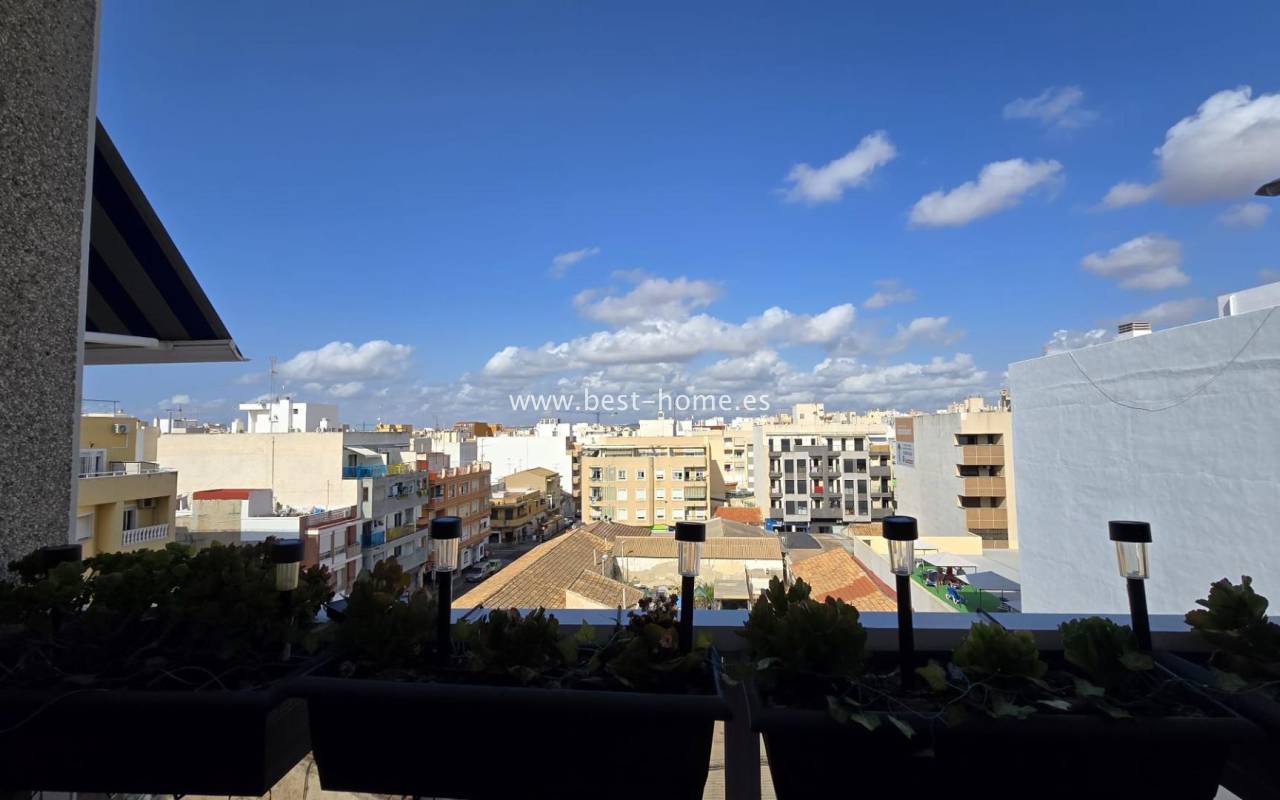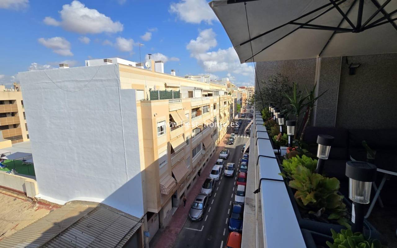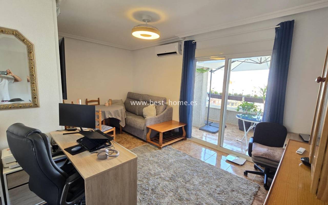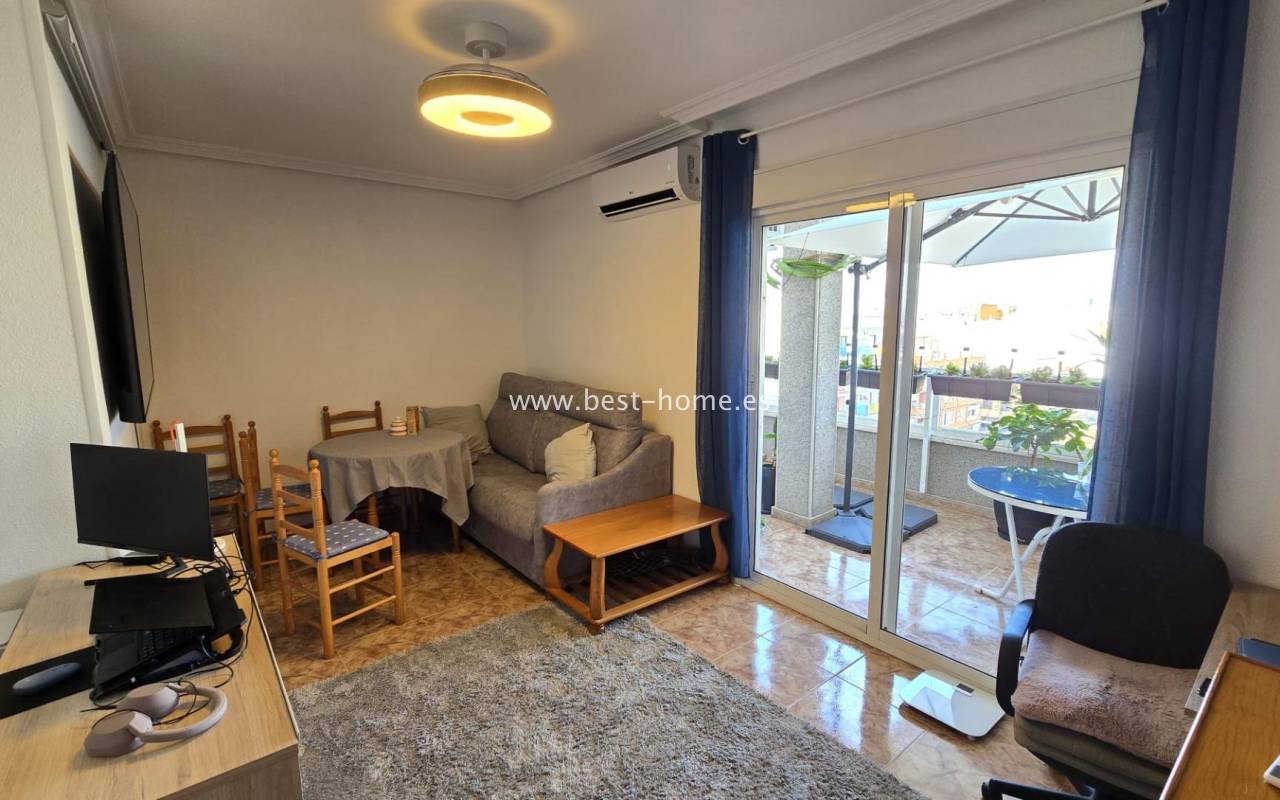 Penthouse in the center of Torrevieja. It features a living room with access to a terrace, one double bedroom with a built-in wardrobe, a kitchen equipped with appliances, and a bathroom. The apartment is located on the top 4th floor of a building with an elevator, is equipped with air conditioning, and is sold furnished. Nearby, you'll find a large selection of shops, bars, and restaurants. An optional parking space in the underground garage is available.
