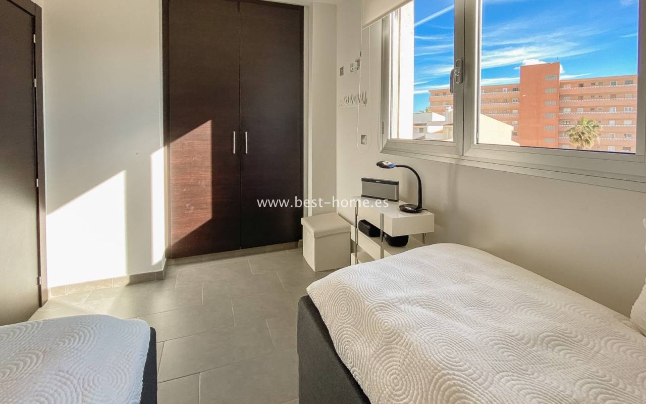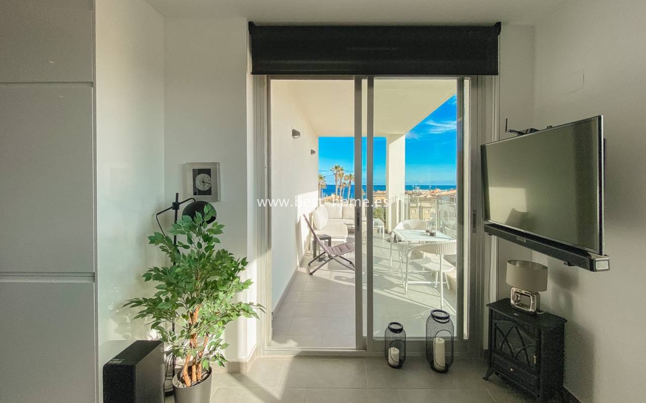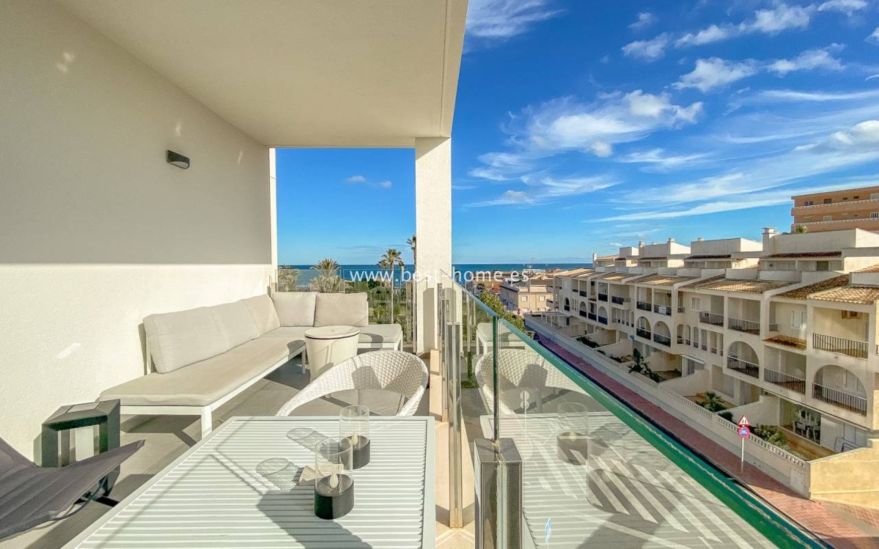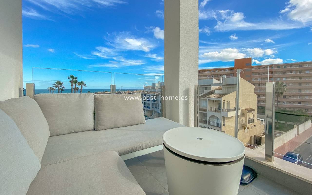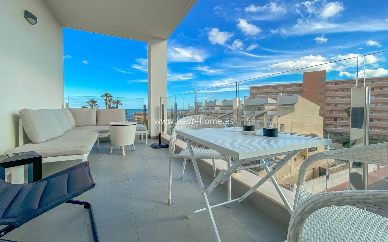 This fantastic apartment is situated in a prime location on La Mata Beach. The property is on the third floor and comprises two bedrooms with fitted wardrobes, two bathrooms, and a furnished kitchen with a dining area and living room. The living room opens onto a sunny terrace with stunning views of the sea, park, and surrounding area. Appliances, central air conditioning, and a parking space are included in the price. The development boasts a stunning swimming pool. A wide selection of restaurants, bars, and cafes are also nearby.