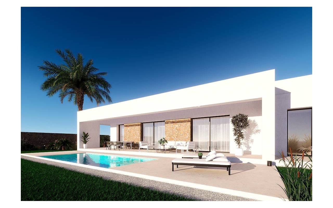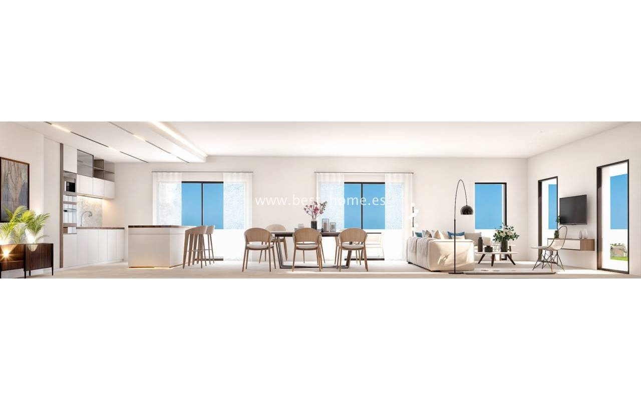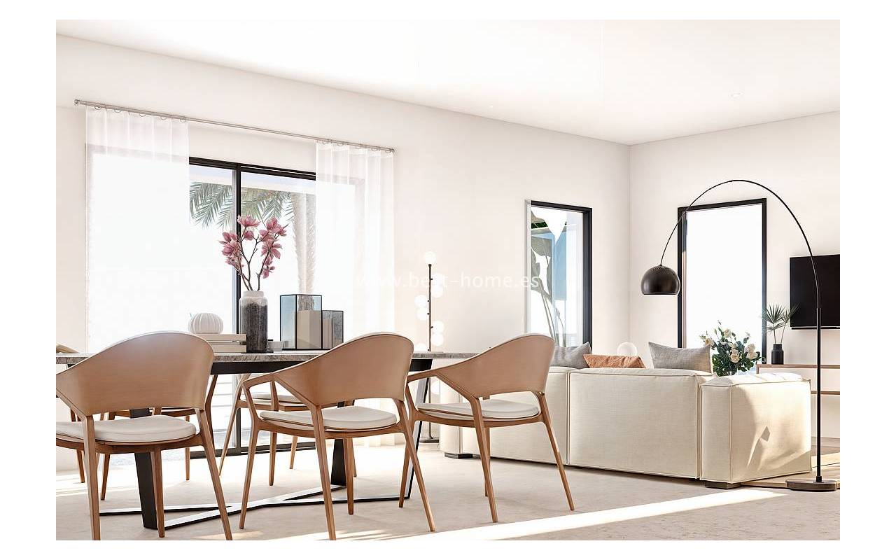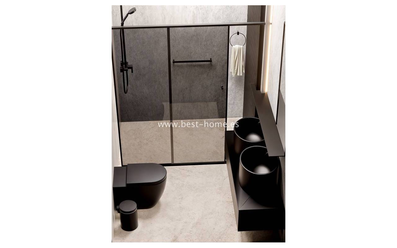 A new single-story villa is being built on the outskirts of Finestrat. The 144 m² house will consist of a spacious and bright living room with a dining area, a fitted kitchen with an island, a master bedroom with an en-suite bathroom, two further bedrooms with fitted wardrobes, a bathroom, and a toilet. The living room will have access to a terrace, garden, and a private swimming pool (36 m²). The developer is offering the option of a basement (108 m² - stairs from the living room) where a fourth bedroom, a bathroom, and an additional living room could be created. The price includes a fitted kitchen, pre-installation of central air conditioning, finished bathrooms, a private swimming pool, and electric blinds in the bedrooms. The terrace and garden will offer views of the sea and the towers of Benidorm.