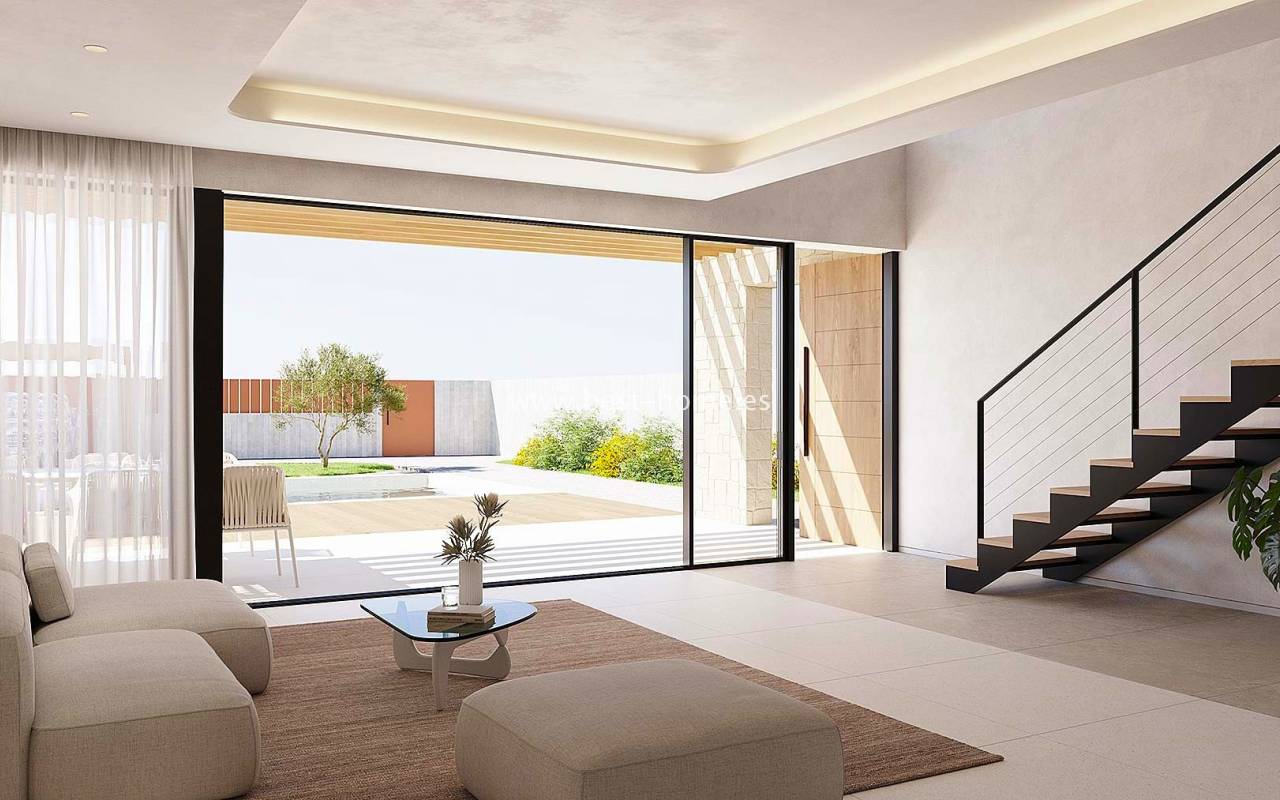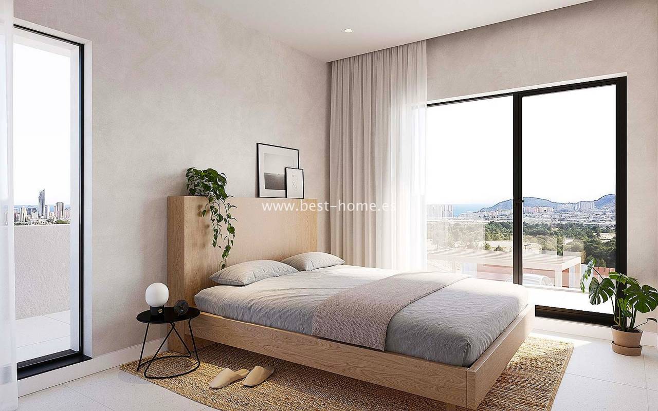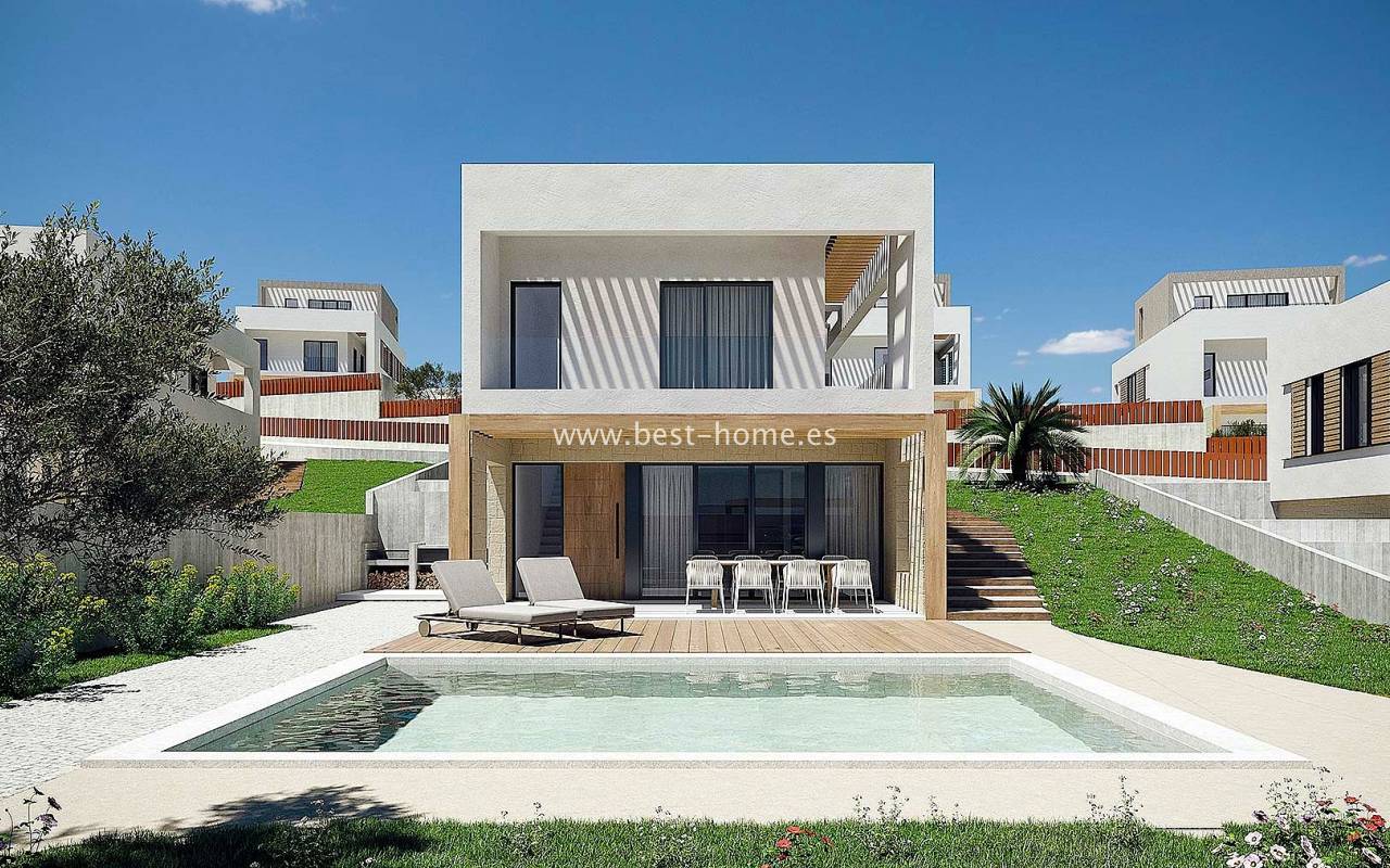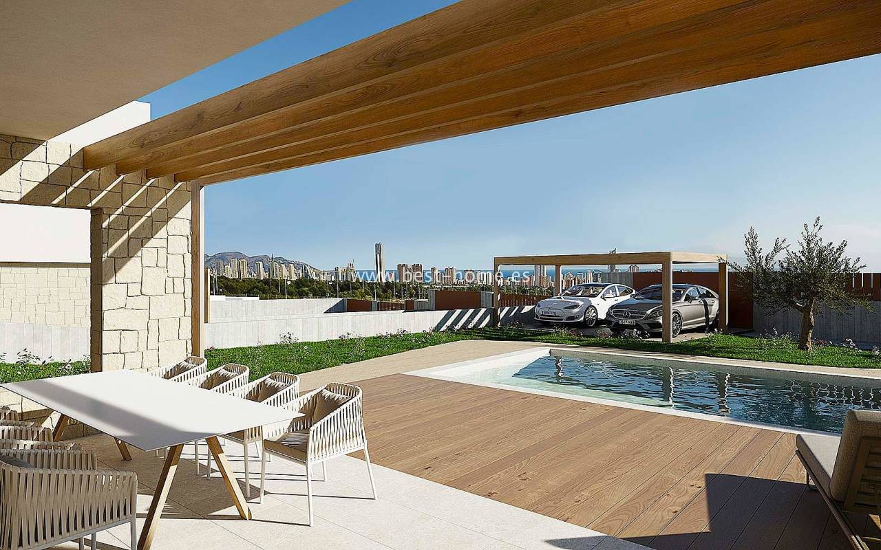 These new villas are being built in a prime location on the outskirts of Finestrat. The homes, measuring approximately 130 m², will be spread over two floors. The ground floor features a spacious and bright living room with a dining area and a fitted kitchen with an island, a 20 m² bedroom with patio access, a bathroom, and a utility room. The first floor features two bedrooms with en-suite bathrooms and a 32 m² terrace. The living room opens onto the terrace, garden, and private pool. The price includes a fitted kitchen, fully equipped bathrooms, electric blinds in the bedrooms, a finished garden, LED lighting, and a private pool. The properties will offer views of the sea and the towers of Benidorm. Plots range from 553 m² to 681 m². Two parking spaces are available. Prices start from €760,000.
