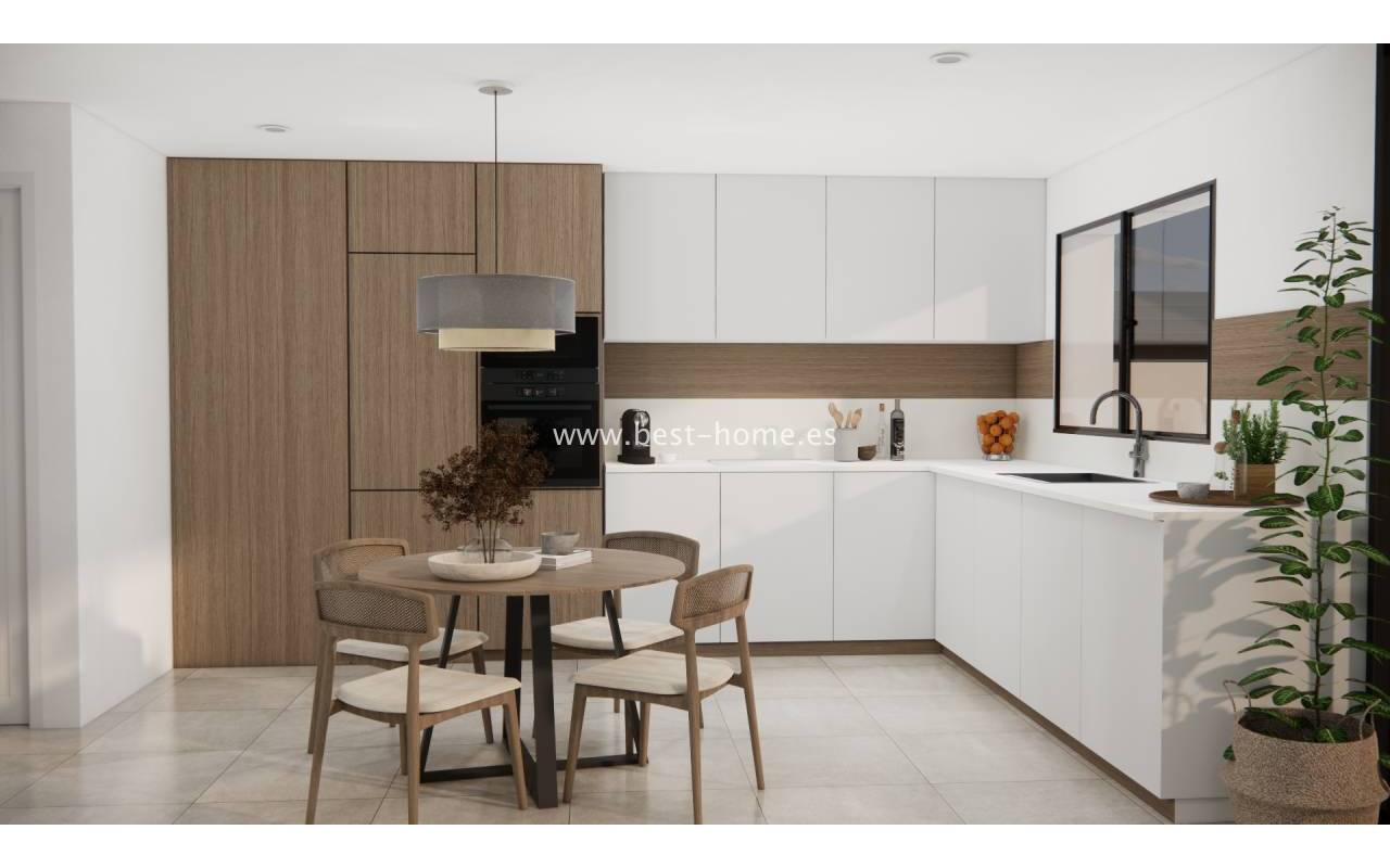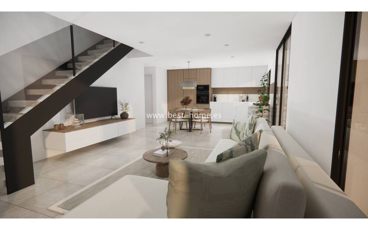 These new semi-detached houses are being built near the Vistabella Golf Course. The ground floor properties will feature a spacious living room with a dining area and a fitted kitchen, one bedroom, and a bathroom. The first floor will feature two bedrooms, a second bathroom, and an 11 m² terrace. The price includes appliances, complete bathrooms with underfloor heating, electric blinds, an electric gate, and a private swimming pool. Plot sizes range from 141 m² to 199 m². Prices range from €352,900 to €399,900.