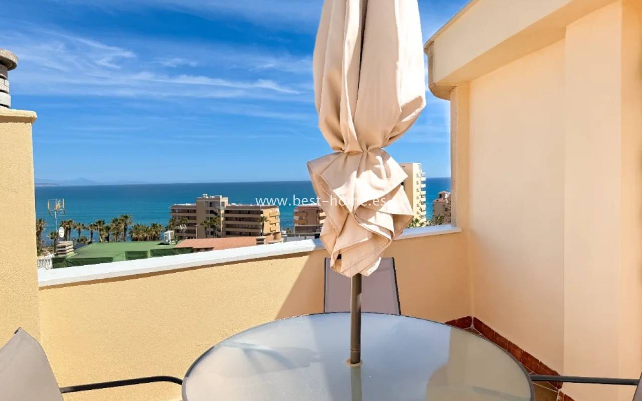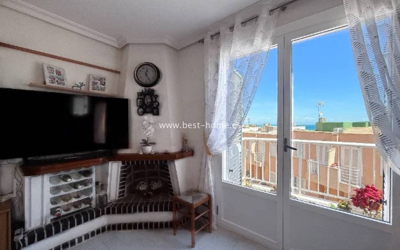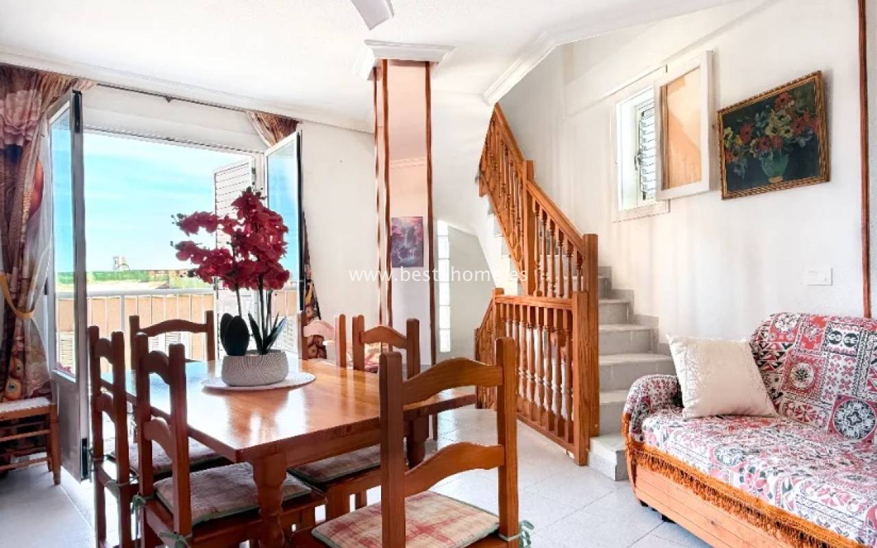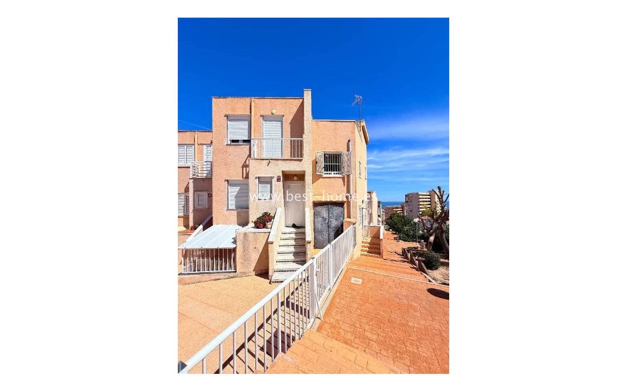 On the ground floor are two bright bedrooms and a bathroom. On the first floor, there's a living room with access to a balcony with sea views, a kitchen, and a guest toilet. On the top floor, there's a private solarium with sea views.