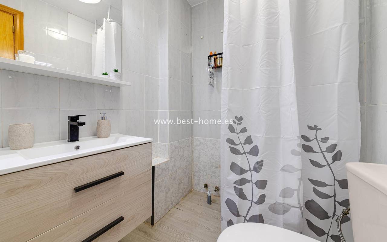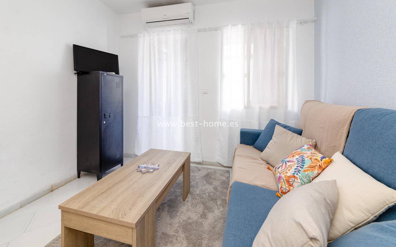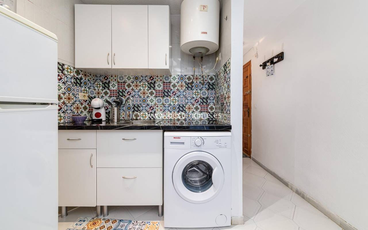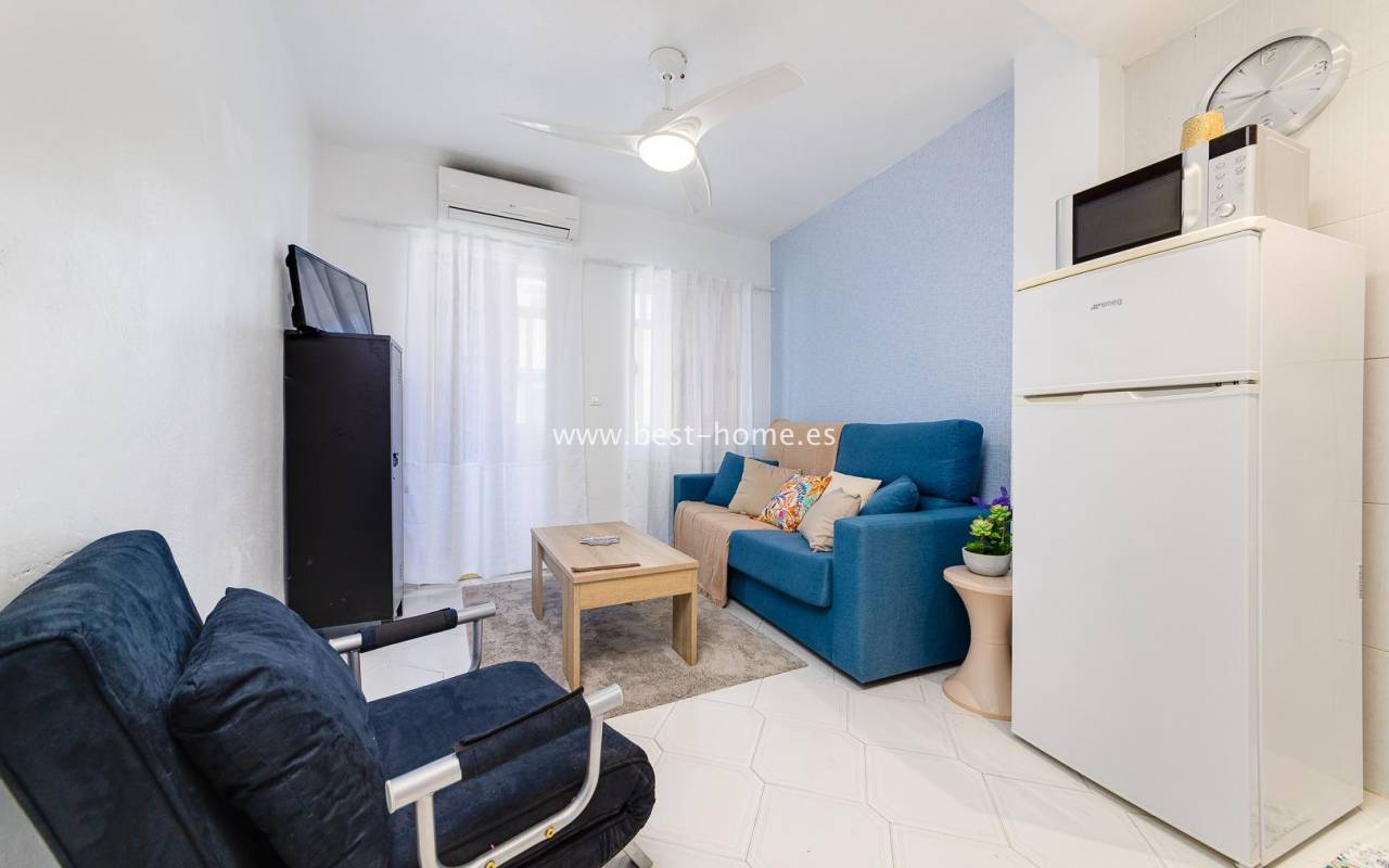 Renovated studio with a terrace on the 4th floor, close to the center of Torrevieja. It features a living room with access to a covered terrace, an open-plan kitchen with appliances, and a bathroom. The apartment is equipped with air conditioning and is sold furnished. Ideal for holiday rentals, there are numerous bars, pubs, cafes, and restaurants nearby.