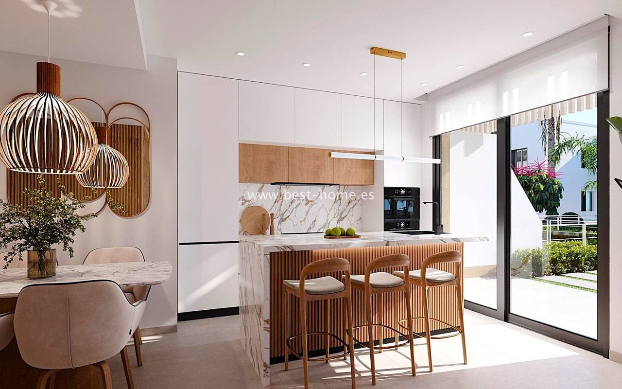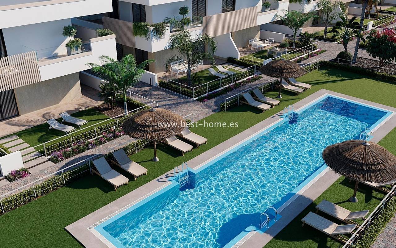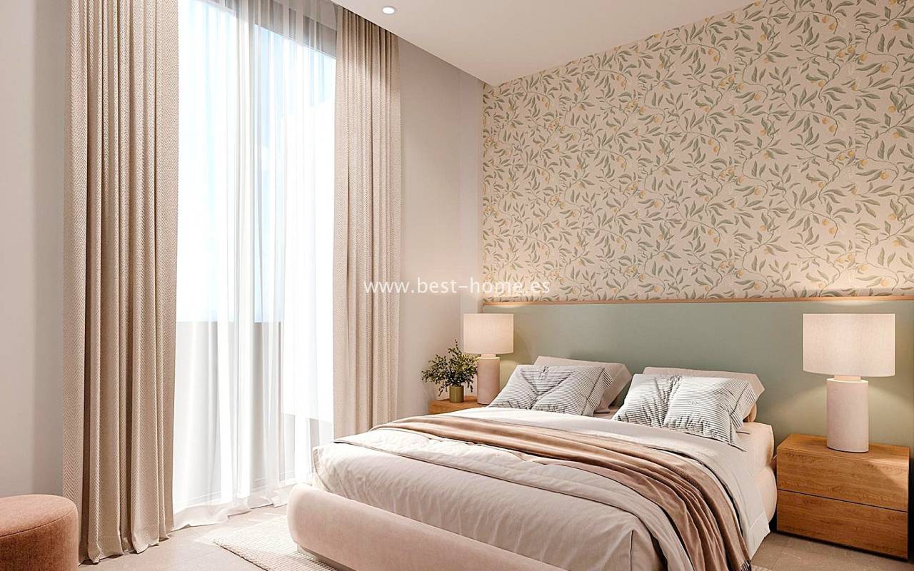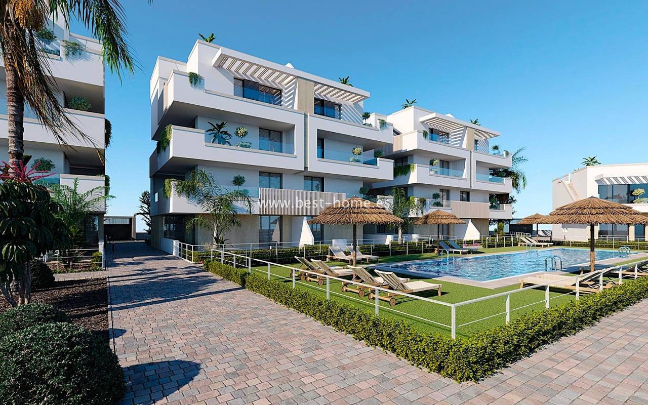 New apartments are being built in this magnificent complex, featuring two bedrooms, two bathrooms, a furnished kitchen with an island, and a living room with a dining area. The living room will have access to a terrace (ranging in size from 23 m² to 27 m²). The price includes a fitted kitchen with appliances, pre-installation of central air conditioning, electric roller shutters, LED lighting, a parking space, and a storage unit. The gated community will feature communal gardens and two swimming pools. Two-bedroom apartments are available on the first and second floors. Prices start from €309,900.