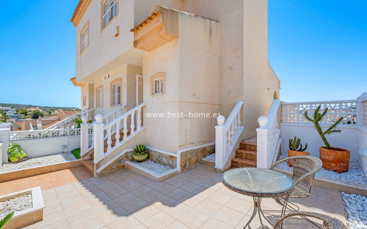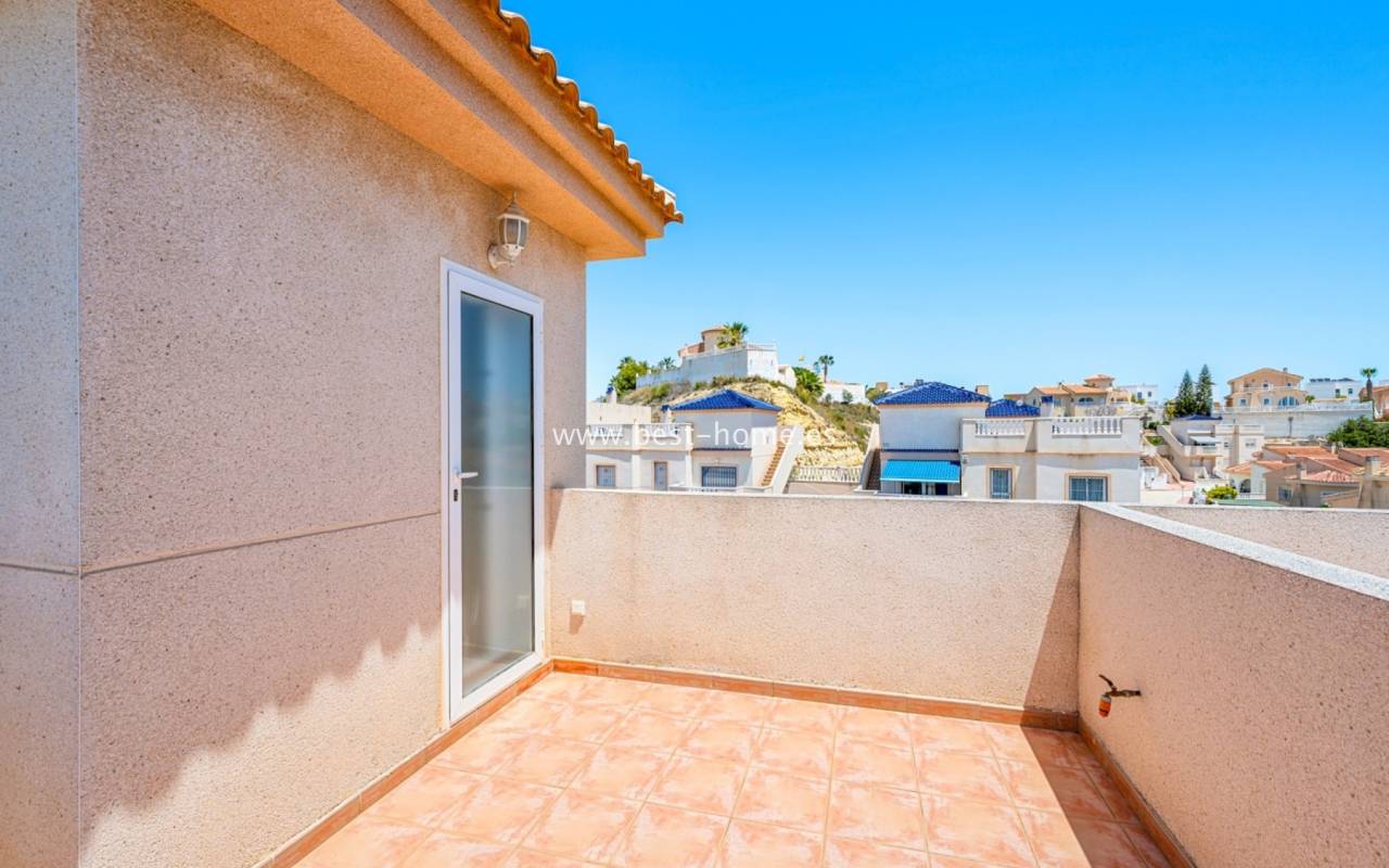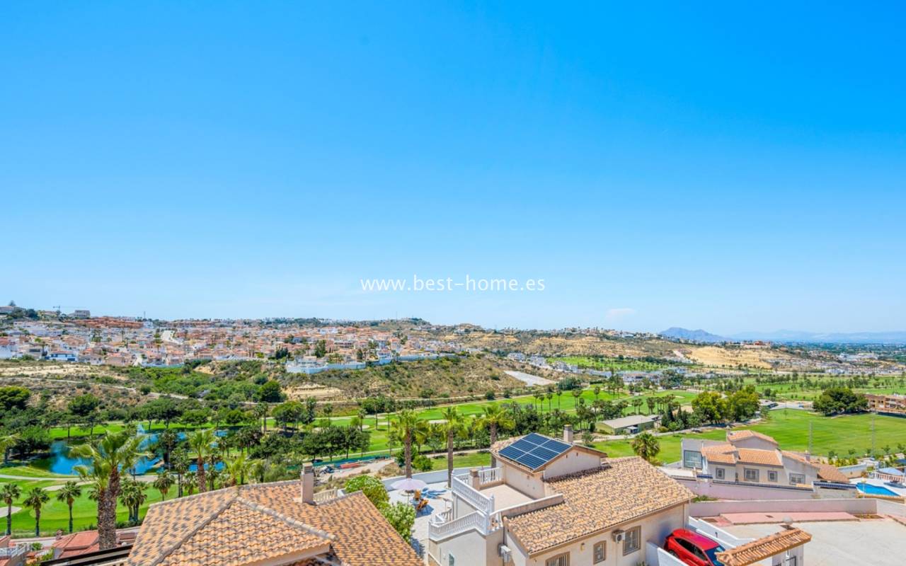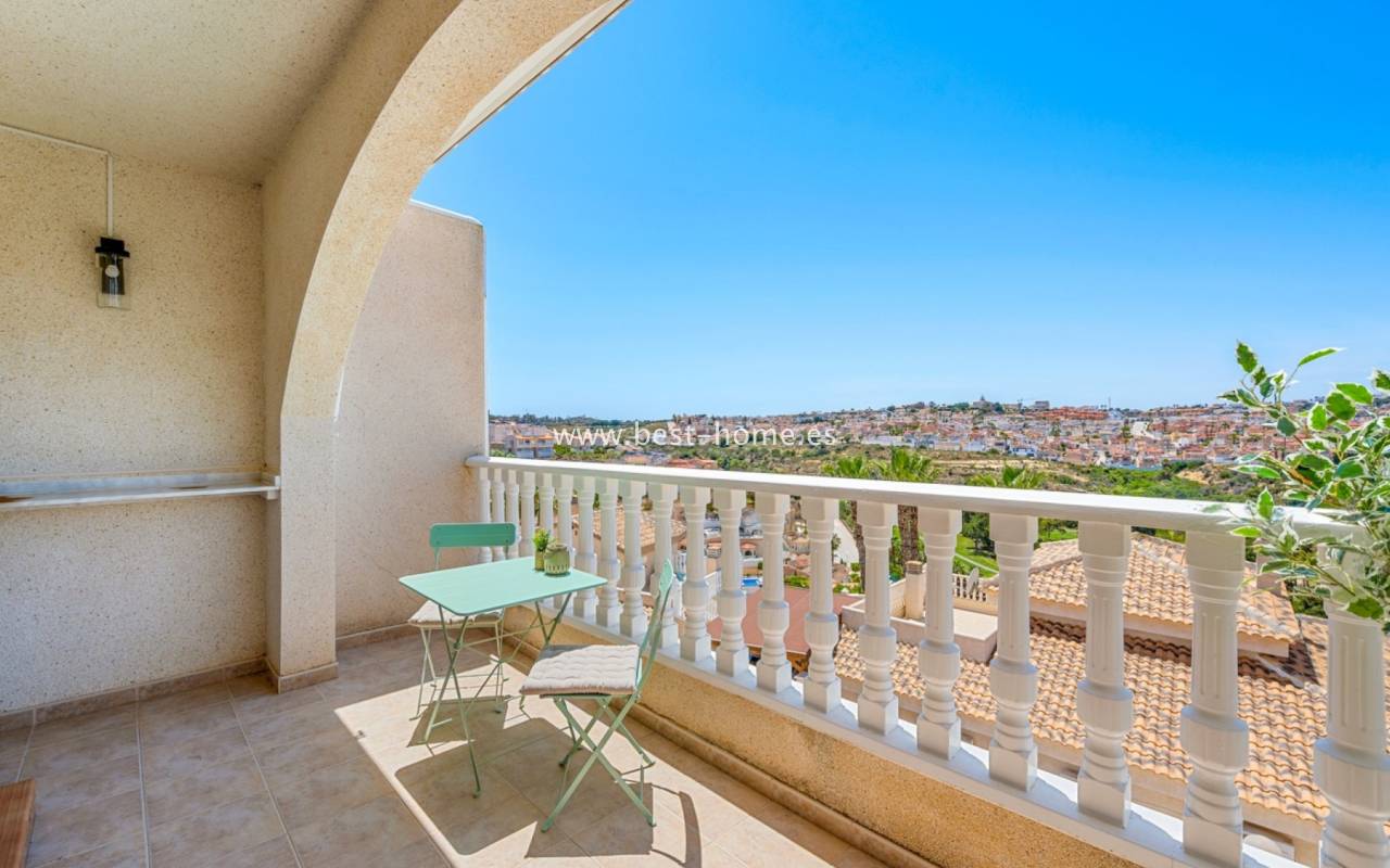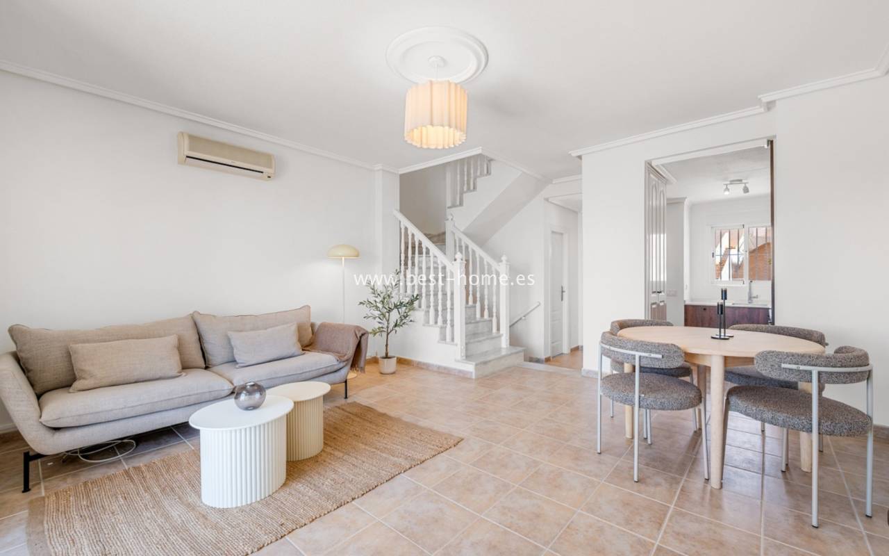 This fantastic terraced house boasts a private garden and picturesque views of the La Marquesa golf course. Situated on a 137 m² plot, it has three levels. On the ground floor, you'll find a bright, spacious, boho-style living room with an open-plan dining area, followed by a separate kitchen equipped with appliances. On the first floor, you'll find two double bedrooms with built-in wardrobes, a guest toilet, and a charming, large southwest-facing terrace overlooking the La Marquesa golf course, the mountains, and the surrounding green spaces, perfect for al fresco dining, relaxing in the sun, or entertaining guests. On the second floor, you'll find a third bedroom with two single beds and a living room with a TV. Upstairs, you'll find a beautiful solarium with fantastic, colorful views of the entire development. The property is equipped with air conditioning and is being sold furnished. Thanks to its southwest exposure and access to the well-maintained communal swimming pool, the apartment enjoys excellent sunlight throughout the day. Its location, just minutes from La Marquesa Golf Course, makes it an ideal choice for golf enthusiasts or those seeking a peaceful, green setting close to all amenities.
