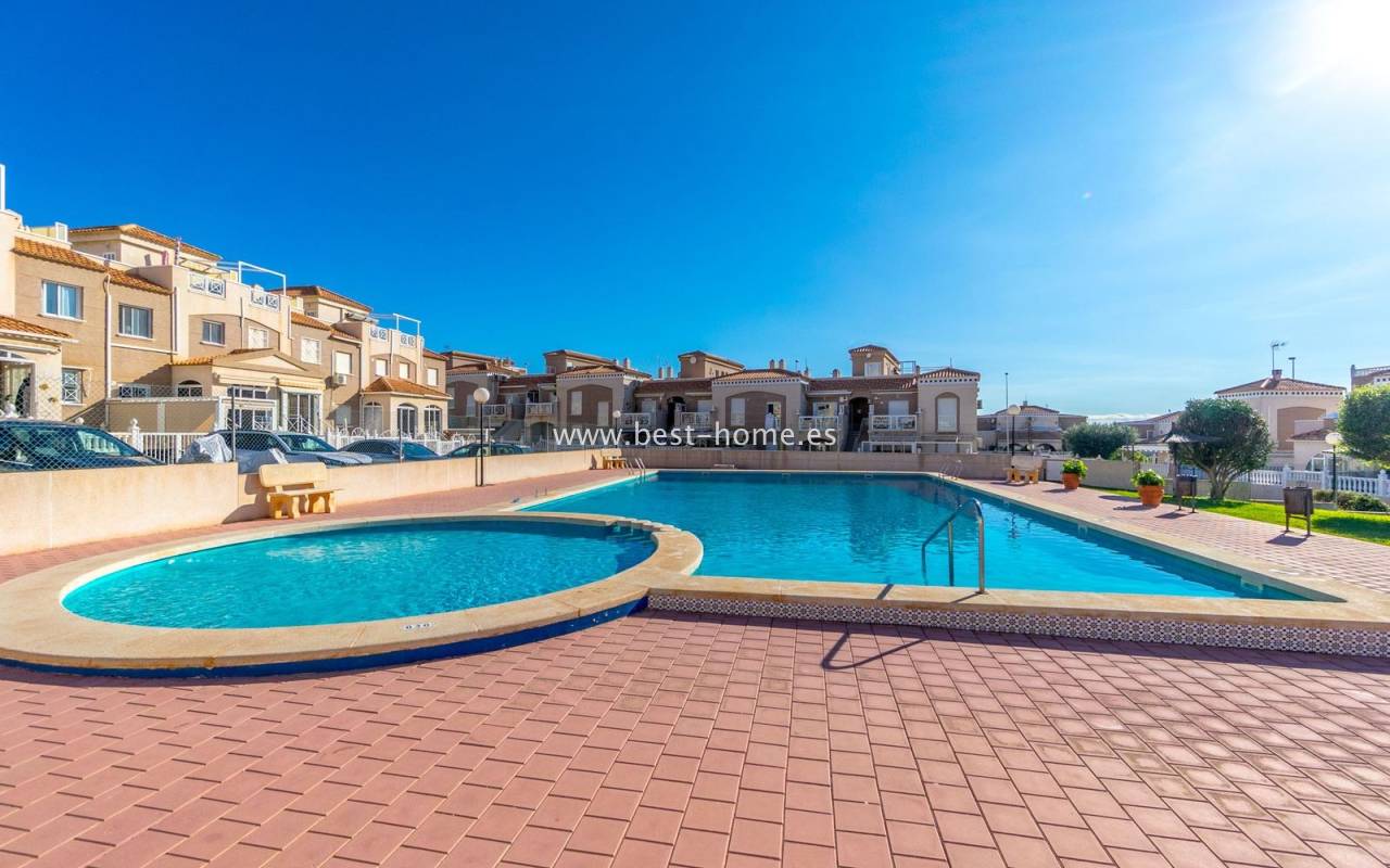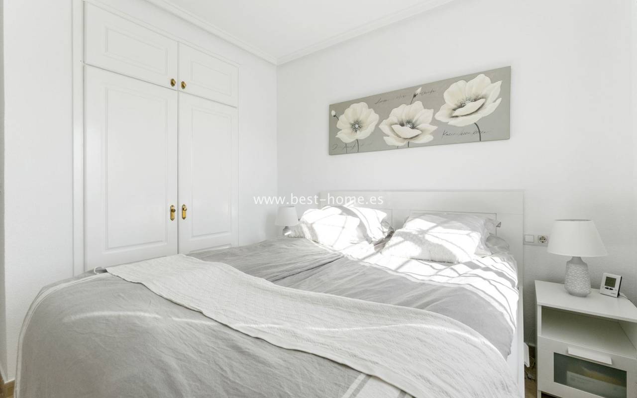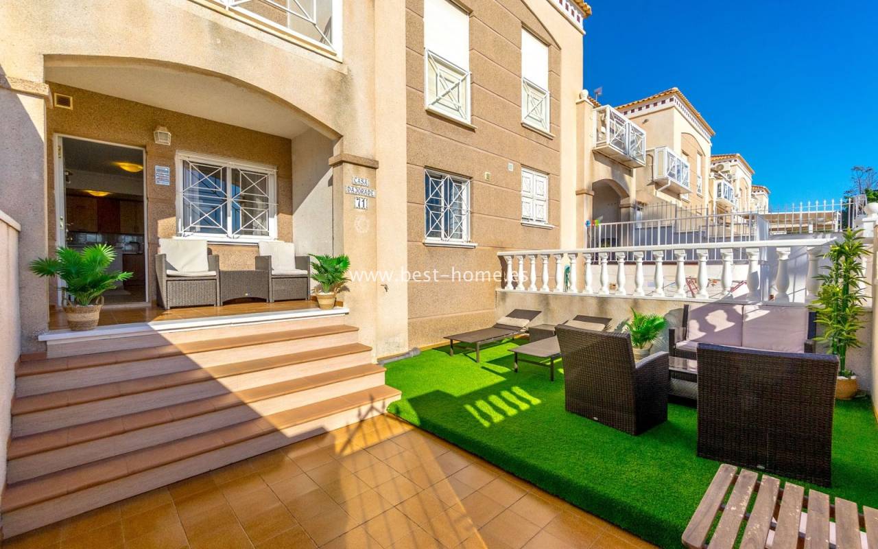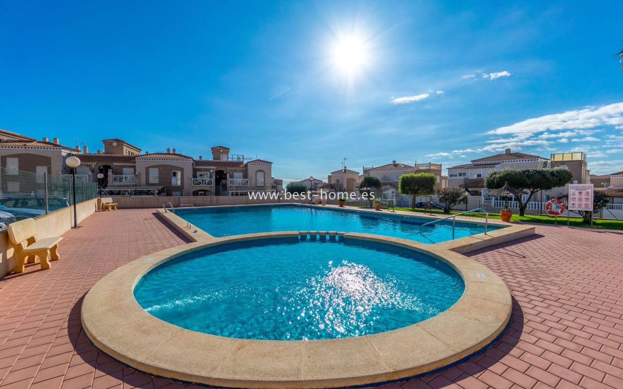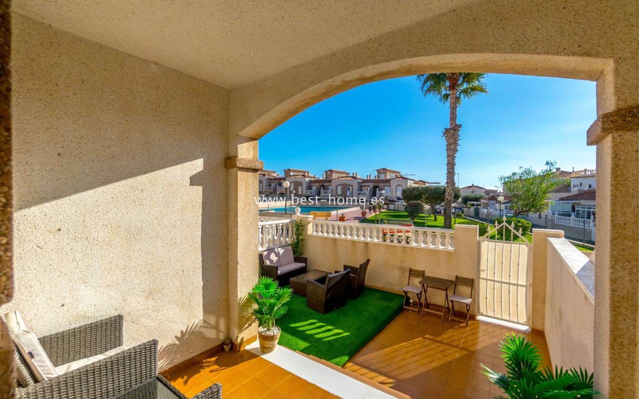 This ground-floor apartment with a private garden is situated in a prime location in the prestigious Altos de la Bahía development in Torrevieja. The property offers two cozy bedrooms and two elegant bathrooms, providing the perfect setting for everyday living. The spacious living room with an open-plan kitchen creates a welcoming and functional space for socializing, while the sunny terrace and charming garden are perfect for relaxing and enjoying the surroundings. The patio offers the perfect place to unwind, offering stunning views of the pool. The apartment is sold fully furnished and equipped, with air conditioning installed, making it ready for immediate occupancy. The development also includes a swimming pool for residents. All necessary amenities, such as restaurants, supermarkets, shopping centers, and the weekly municipal market, are within walking distance. La Mata and Los Locos beaches, known for their clean sand and crystal-clear waters, are within walking distance, while the area is renowned for its beautiful green spaces. Several bus stops are nearby, providing quick access to the city center.