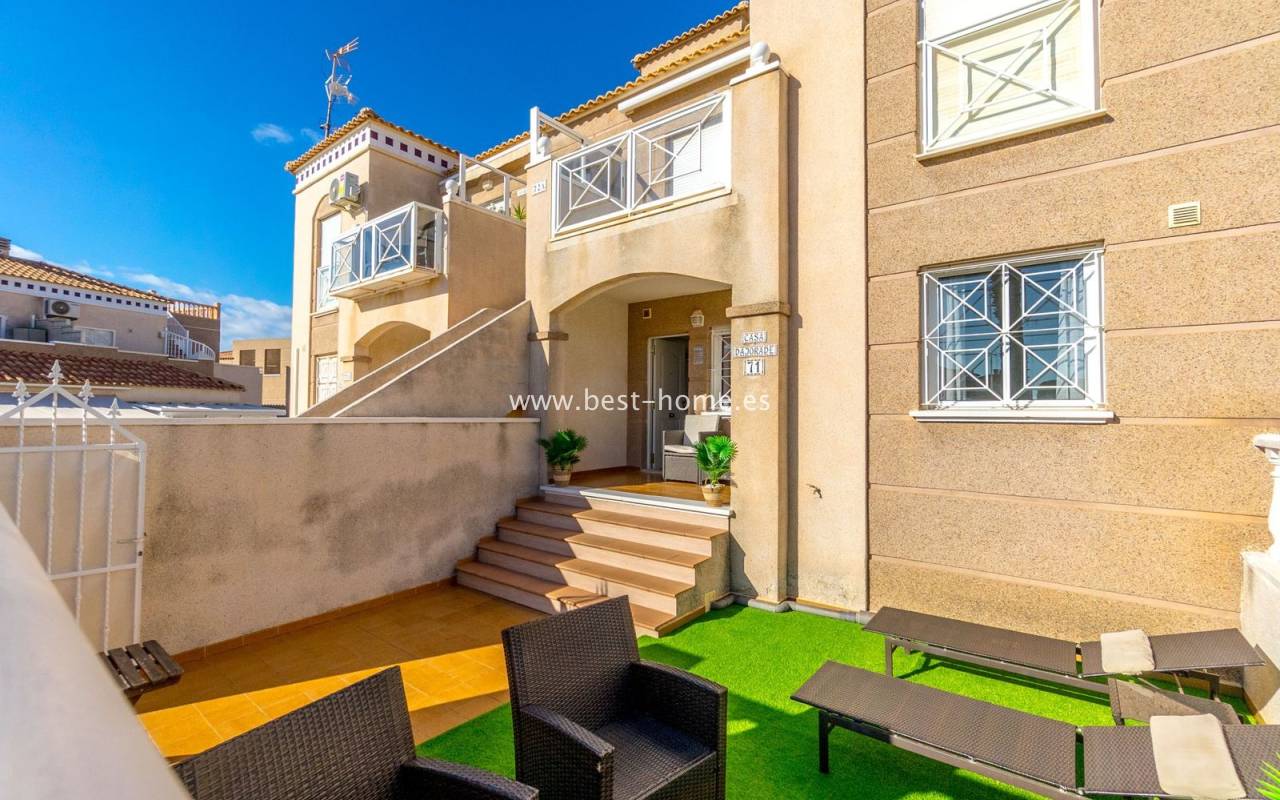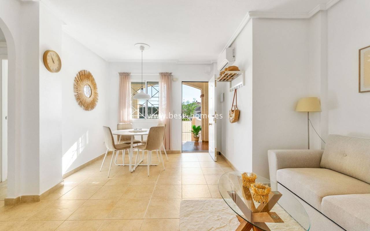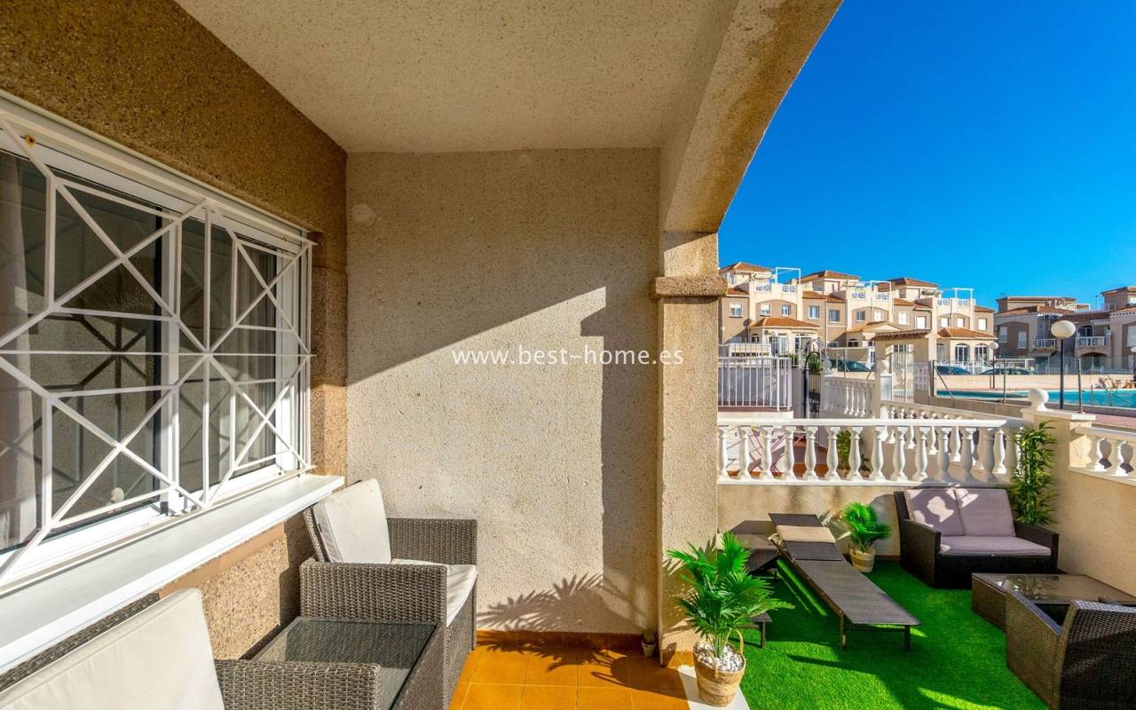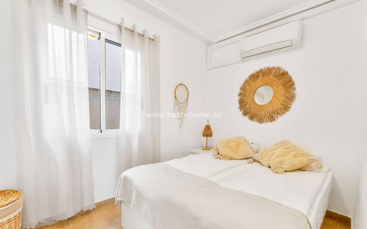 This ground-floor apartment with a private garden is situated in a prime location in the prestigious Altos de la Bahía development in Torrevieja. The property offers two cozy bedrooms and two elegant bathrooms, providing the perfect setting for everyday living. The spacious living room with an open-plan kitchen creates a welcoming and functional space for socializing, while the sunny terrace and charming garden are perfect for relaxing and enjoying the surroundings. The patio offers the perfect place to unwind, offering stunning views of the pool. The apartment is sold fully furnished and equipped, with air conditioning installed, making it ready for immediate occupancy. The development also includes a swimming pool for residents. All necessary amenities, such as restaurants, supermarkets, shopping centers, and the weekly municipal market, are within walking distance. La Mata and Los Locos beaches, known for their clean sand and crystal-clear waters, are within walking distance, while the area is renowned for its beautiful green spaces. Several bus stops are nearby, providing quick access to the city center.