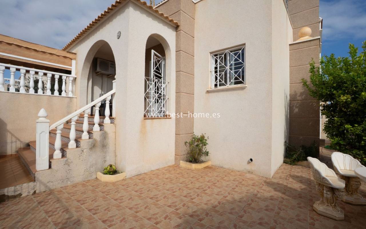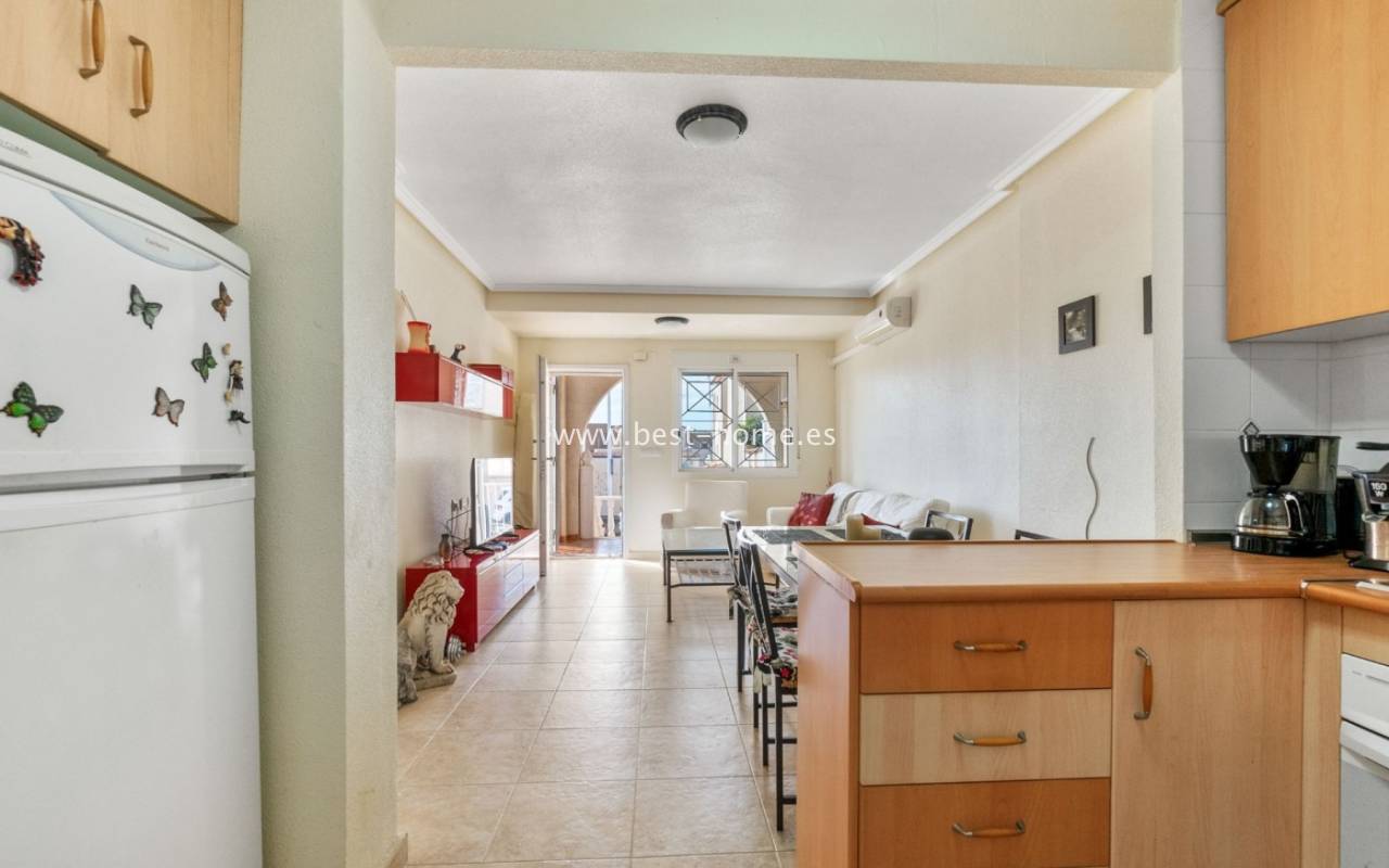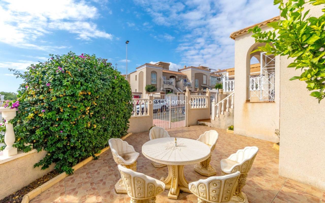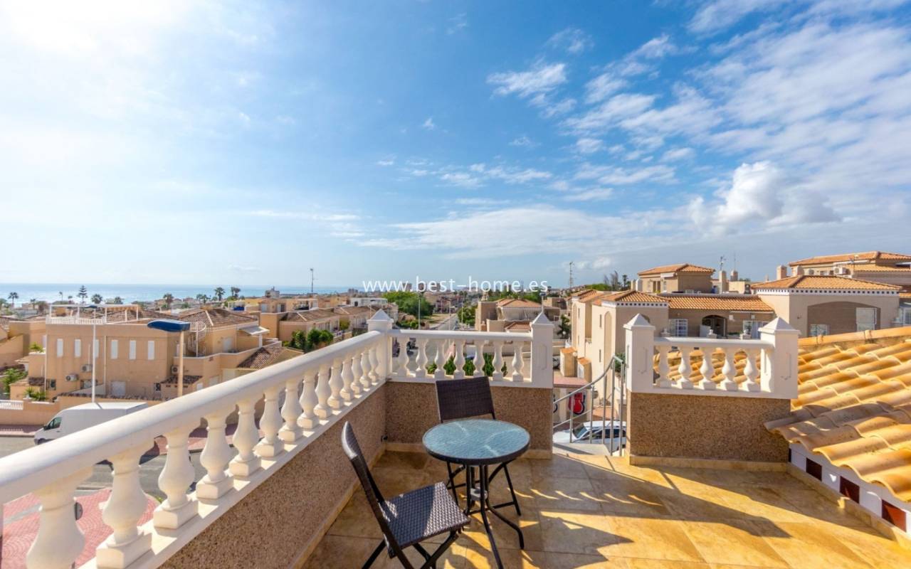 This house (quarter) is located in a very quiet area of Aguas Nuevas. The property consists of four bedrooms, two bathrooms, a furnished kitchen, and a living/dining room. There is also a corner terrace/garden with a parking space and a solarium/rooftop terrace with views of the sea and surrounding area. The price includes furniture, appliances, and air conditioning.