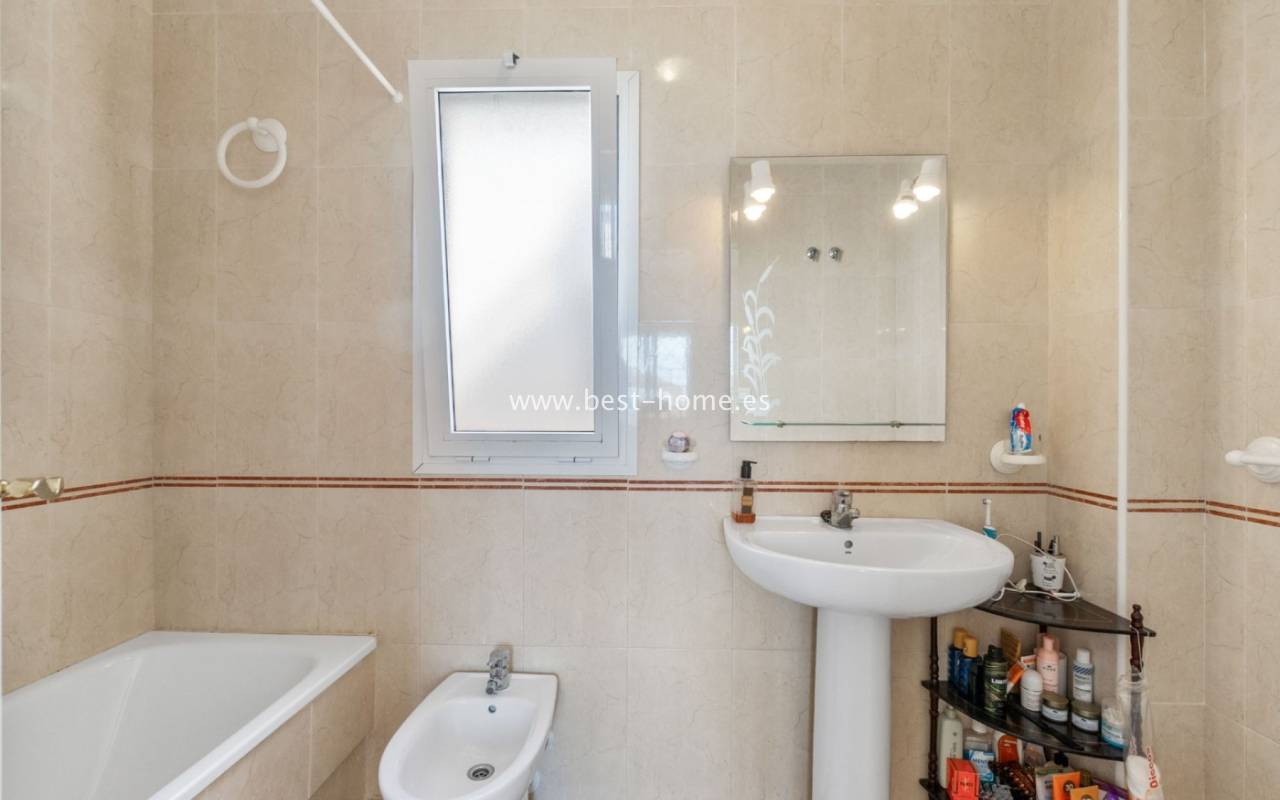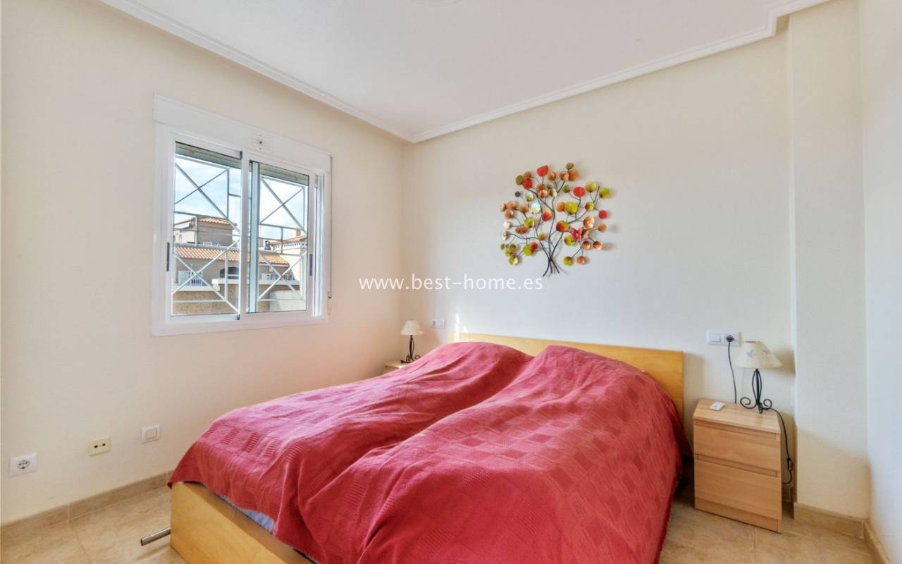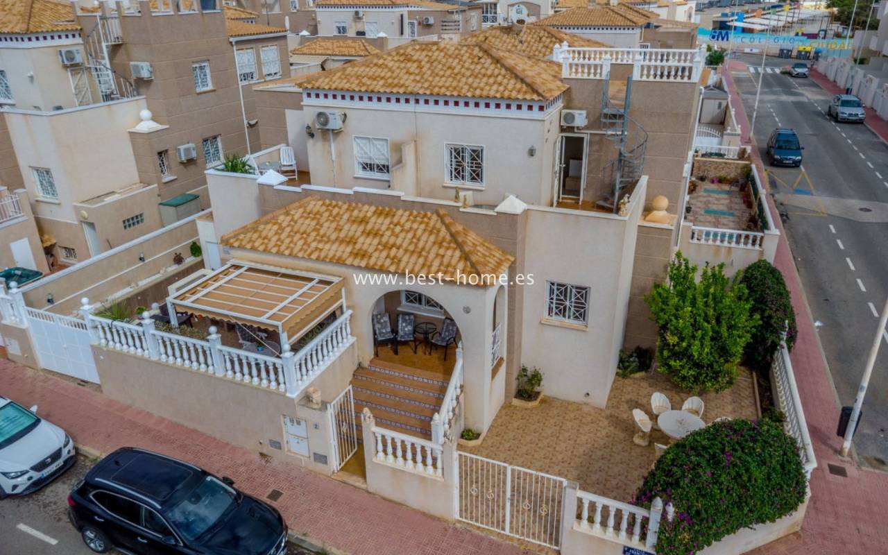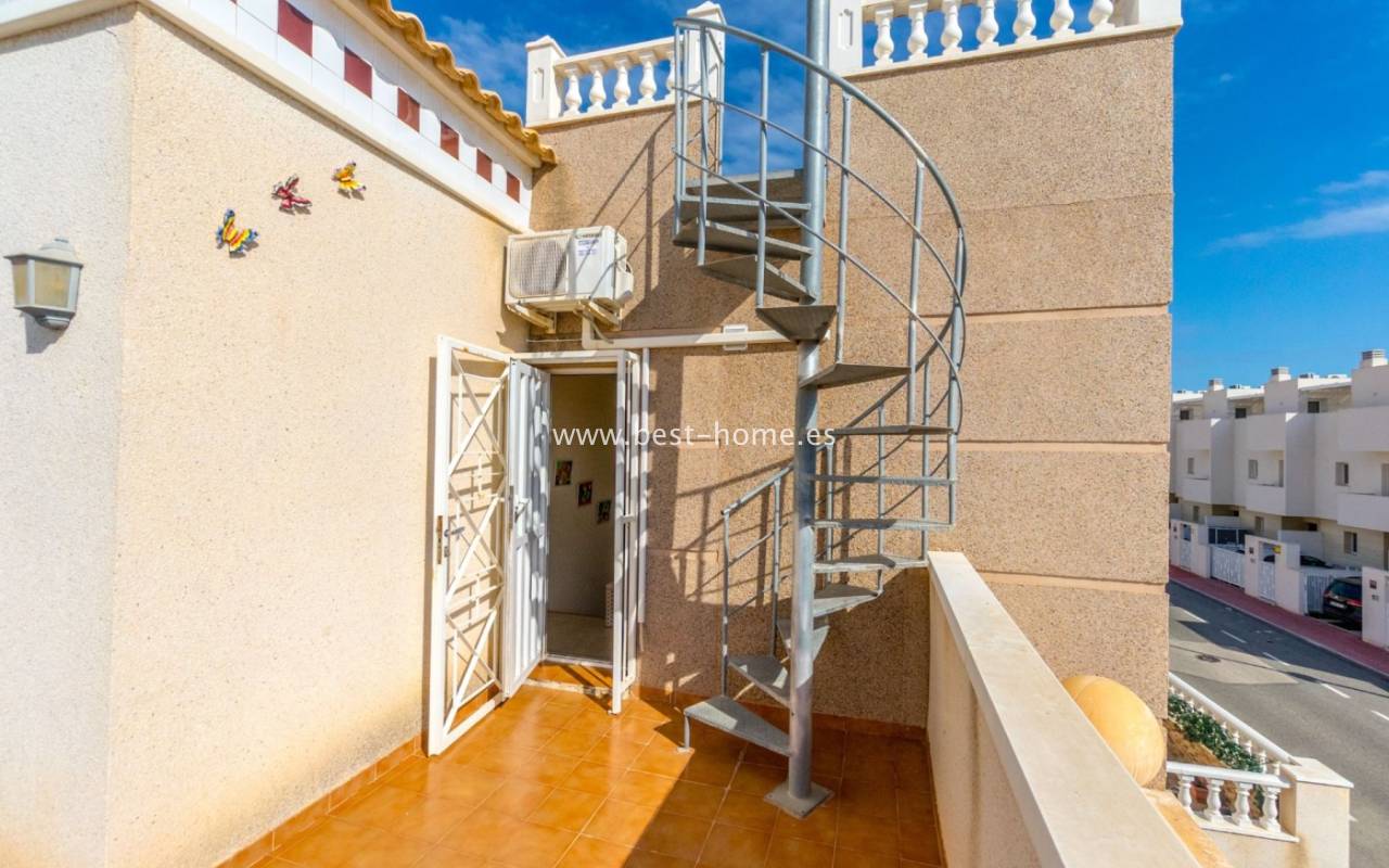 This house (quarter) is located in a very quiet area of Aguas Nuevas. The property consists of four bedrooms, two bathrooms, a furnished kitchen, and a living/dining room. There is also a corner terrace/garden with a parking space and a solarium/rooftop terrace with views of the sea and surrounding area. The price includes furniture, appliances, and air conditioning.