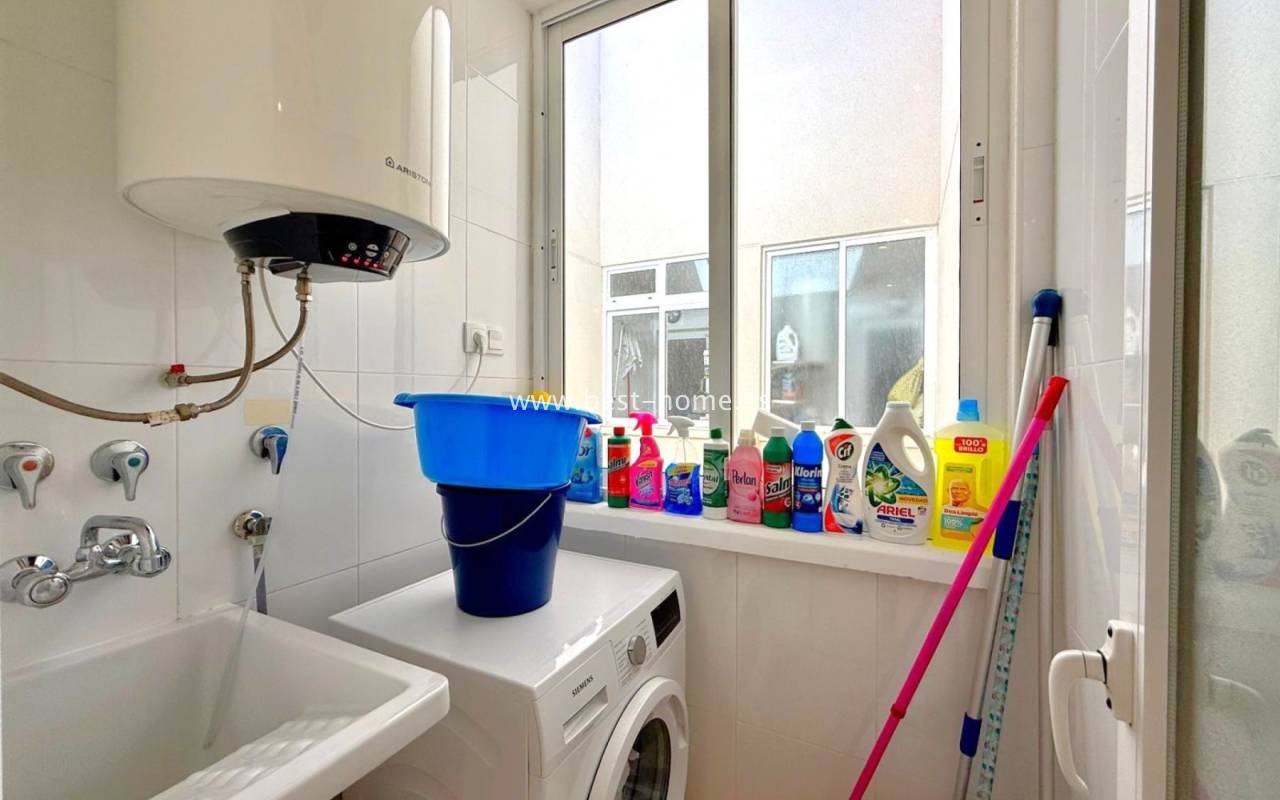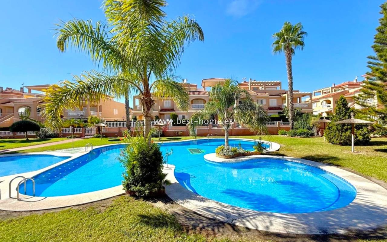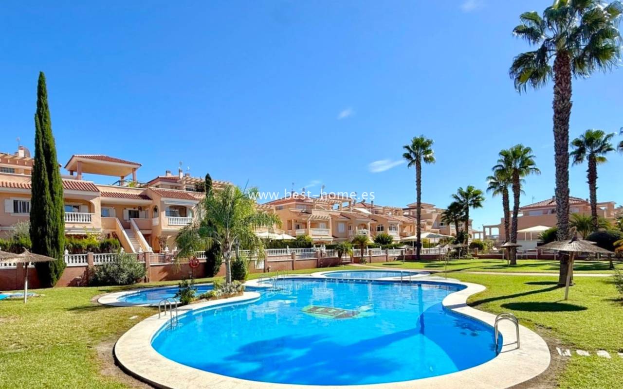 This penthouse is situated in a prime location in Playa Flamenca. The property is located on the first floor, with two bedrooms, a bathroom, a kitchen with a utility room, and a living room with a dining area. The living room opens onto a terrace with beautiful views of the communal areas and the pool. The first floor houses the third bedroom, a bathroom, and a large terrace. Furnishings, appliances, and air conditioning are included in the price. The charming development boasts a beautiful swimming pool surrounded by greenery and a gym.