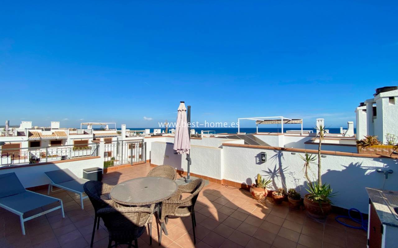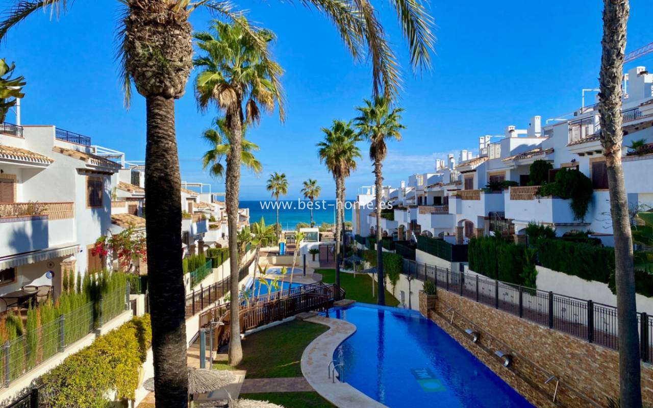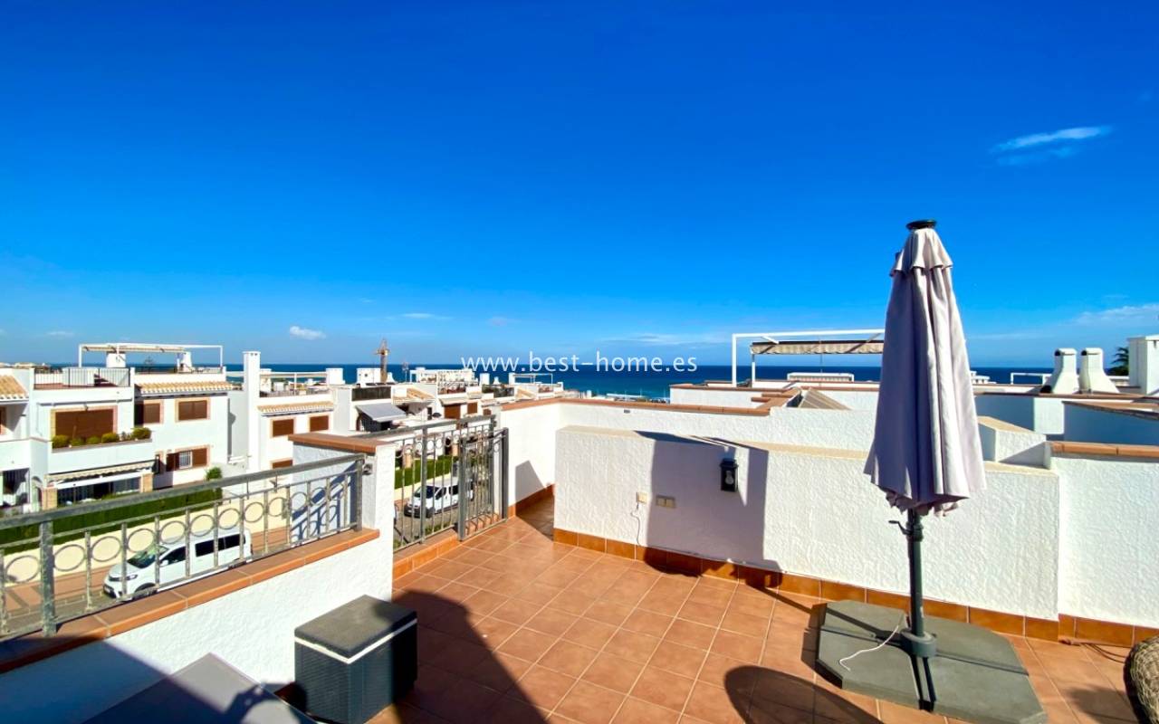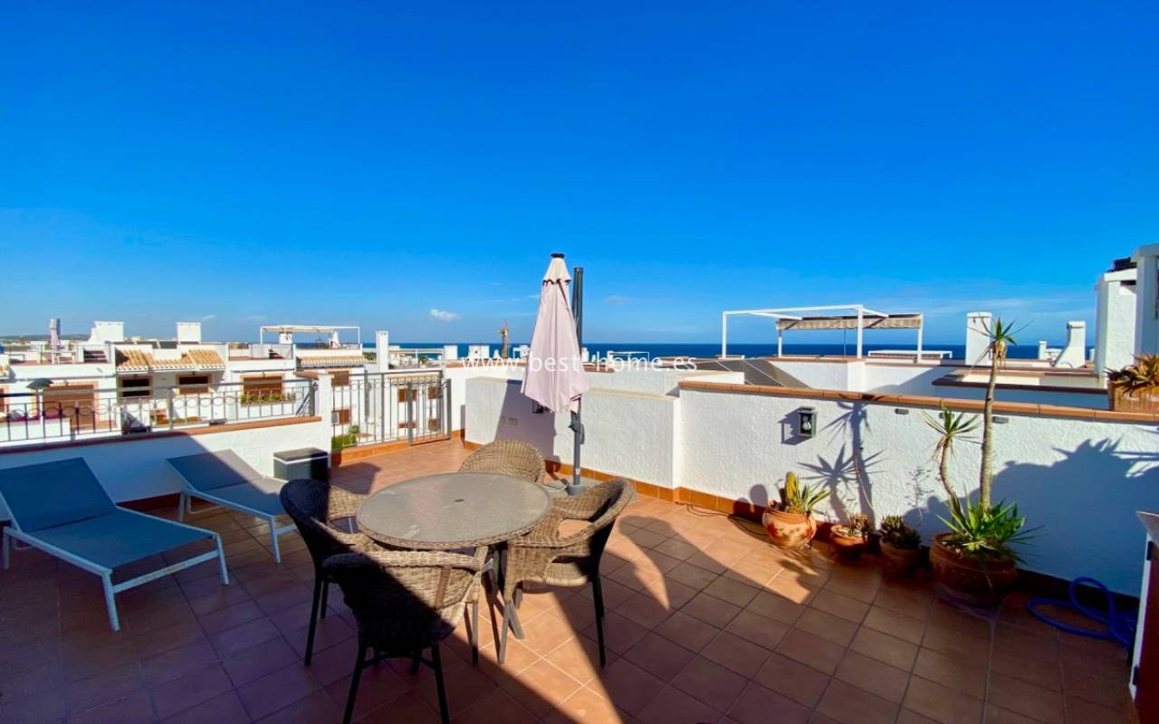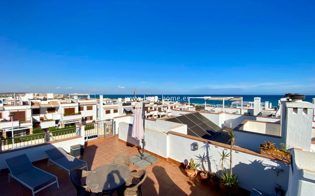 This penthouse is situated in a prime location on the sandy beach of La Mata. The property is on the first floor and comprises two bedrooms with fitted wardrobes, two bathrooms, a fitted kitchen with a utility room, a dining room with a living room, and access to a terrace with sea views. Internal stairs lead to the solarium/roof terrace, which features a summer kitchen and barbecue area. The solarium offers stunning views of the sea and surrounding area. The price includes partial furniture, appliances, central air conditioning, a parking space, and a storage unit. The beach is just 260 m² away.