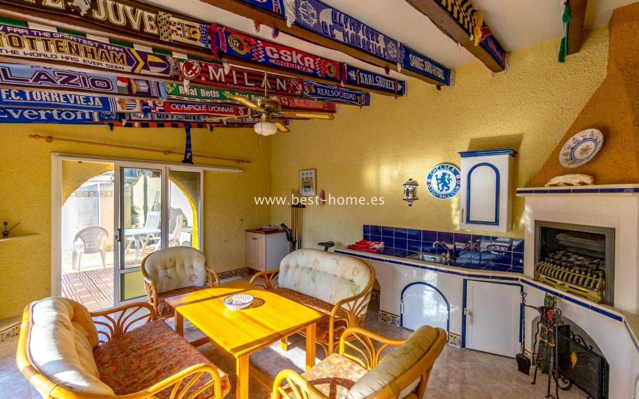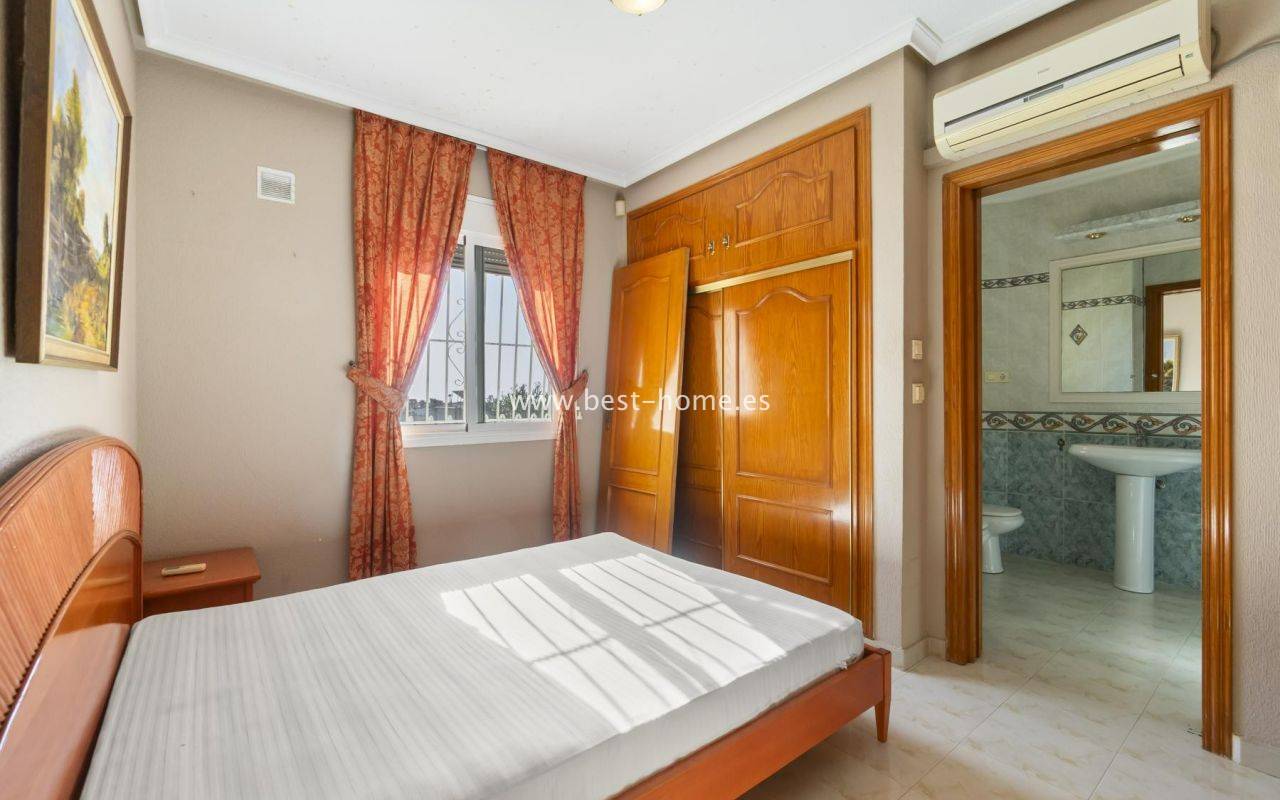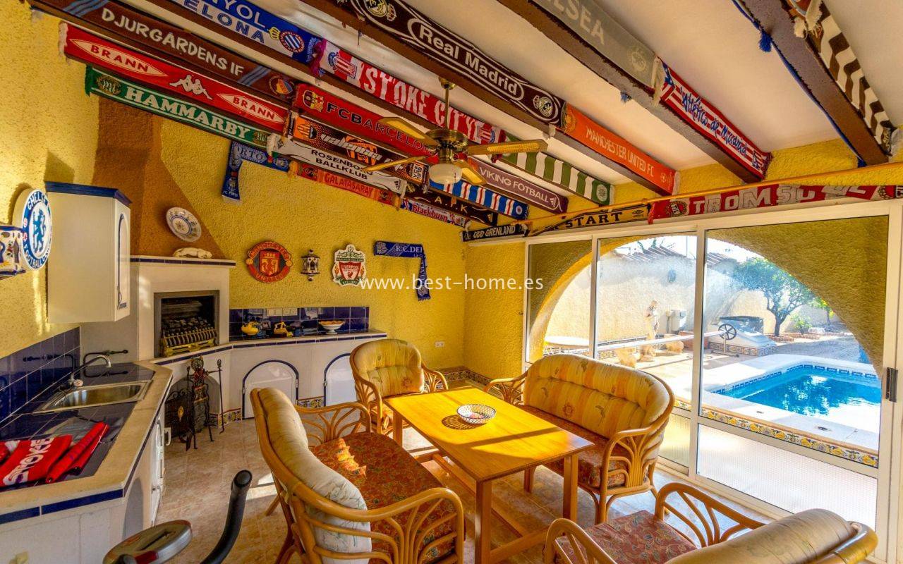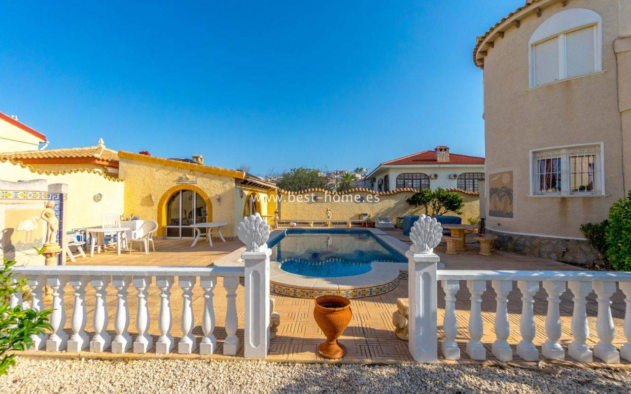 This charming detached house in central Ciudad Quesada offers bright, comfortable living throughout the year. Set on a generous 525 m² plot, it features a heated private pool, a well-kept garden with fruit trees and a cozy barbecue area. The home includes a spacious living room, a fully equipped kitchen, two bathrooms and three bedrooms, one of which is located next to the solarium with beautiful lagoon views – perfect for guests. The glazed terrace and enclosed porch provide additional year-round spaces for relaxation and social gatherings. Situated in a quiet and established neighborhood, the property is close to shops, restaurants, medical services and golf courses, and just a short drive from the stunning beaches of Guardamar del Segura.