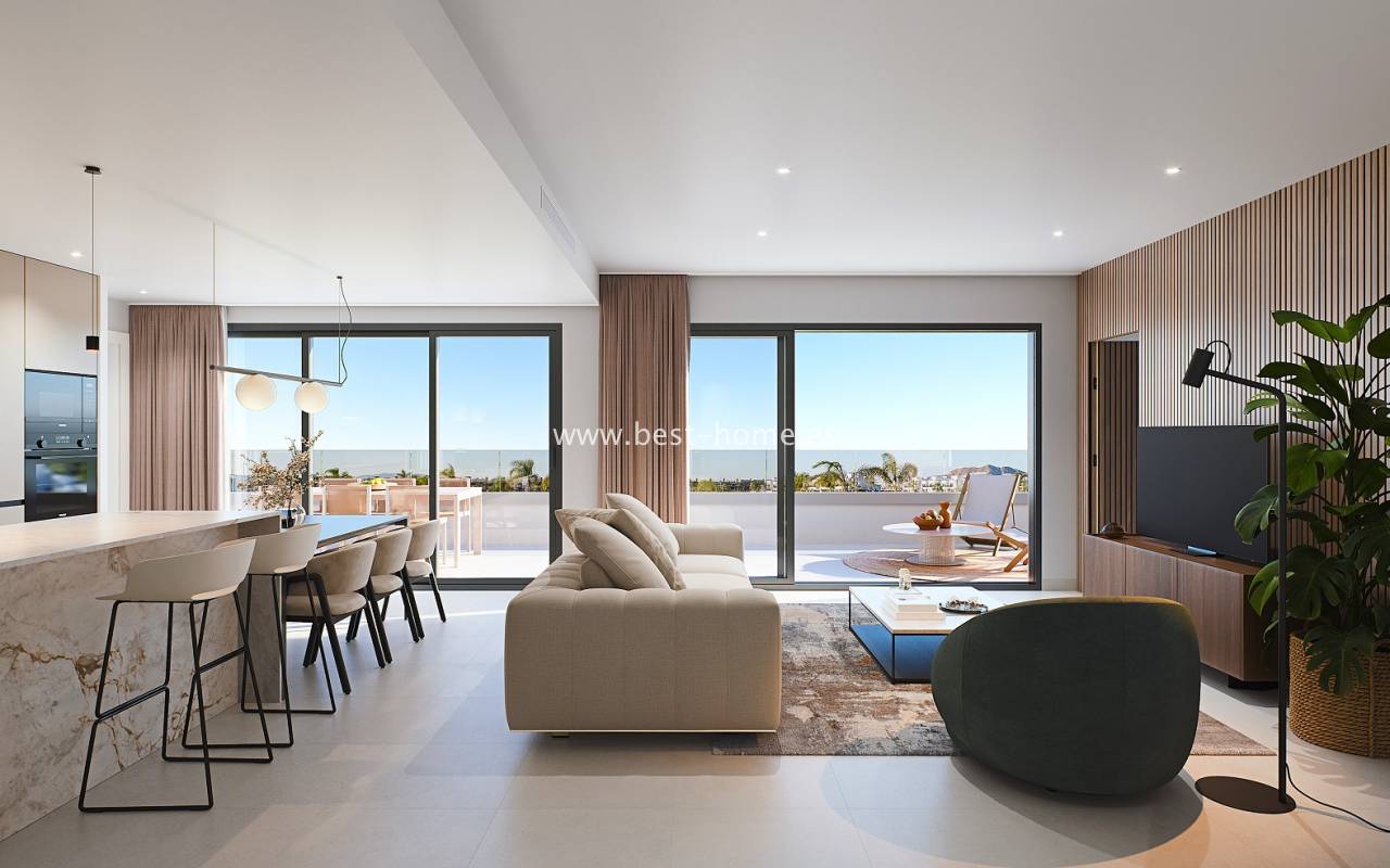This unique development will house an incredible gated community of 72 apartments. Spacious and bright penthouses with 3 bedrooms, 2 bathrooms, and a furnished kitchen with an island connected to a bright living and dining area are available. The living room and master bedroom open onto a 43 m² terrace overlooking the communal areas, swimming pool, lagoon, and mountains. From the terrace, stairs lead to a 75 m² solarium/rooftop terrace with a jacuzzi and a summer kitchen. The price includes a kitchen unit (hood, stovetop), central hot/cold air conditioning, electric exterior blinds, complete bathrooms, LED lighting, heated bathroom floors, a jacuzzi, a summer kitchen, a parking space, and a storage unit in the basement. The gated community will feature two swimming pools, one heated and one saltwater, a children's pool, a playground, a barbecue and picnic area, parking and a bicycle wash, and lush green areas.