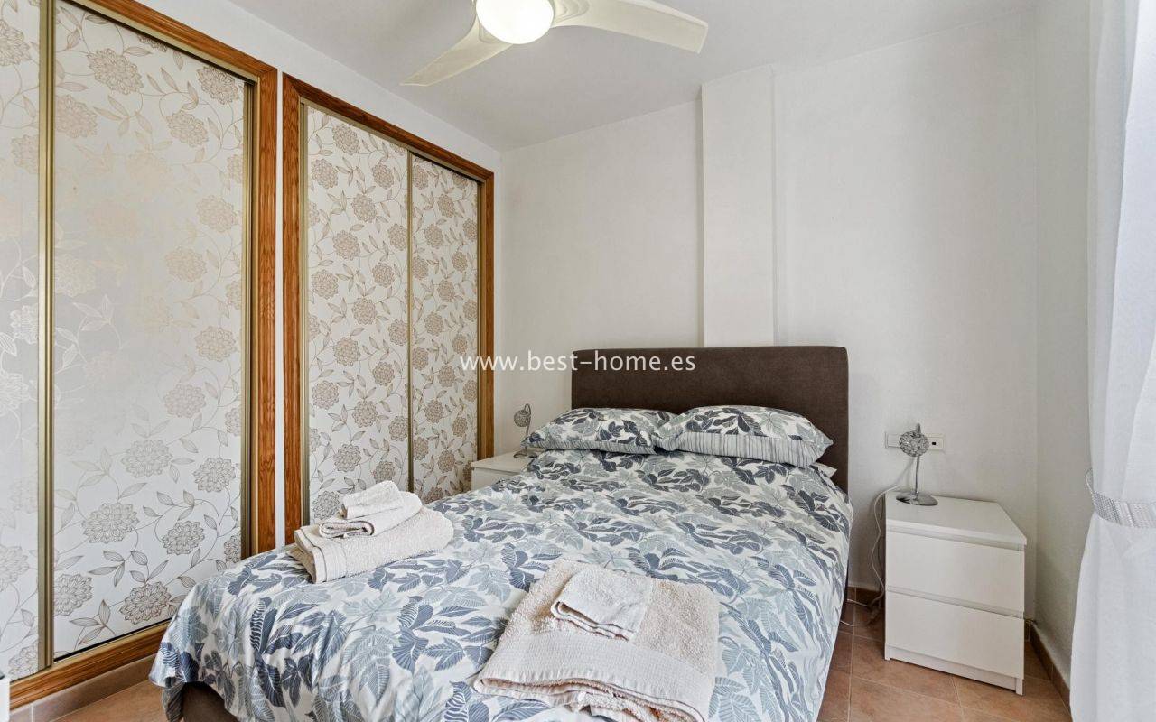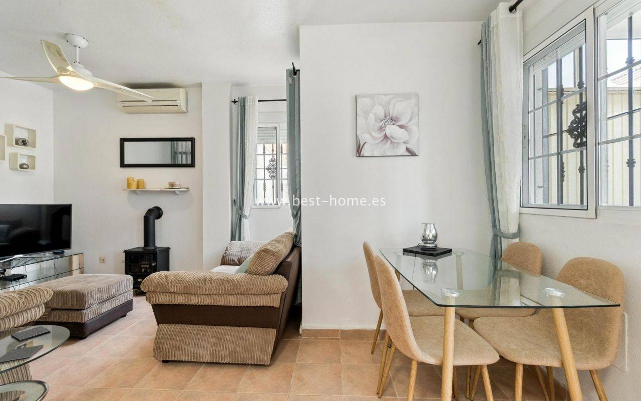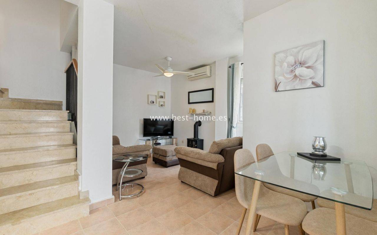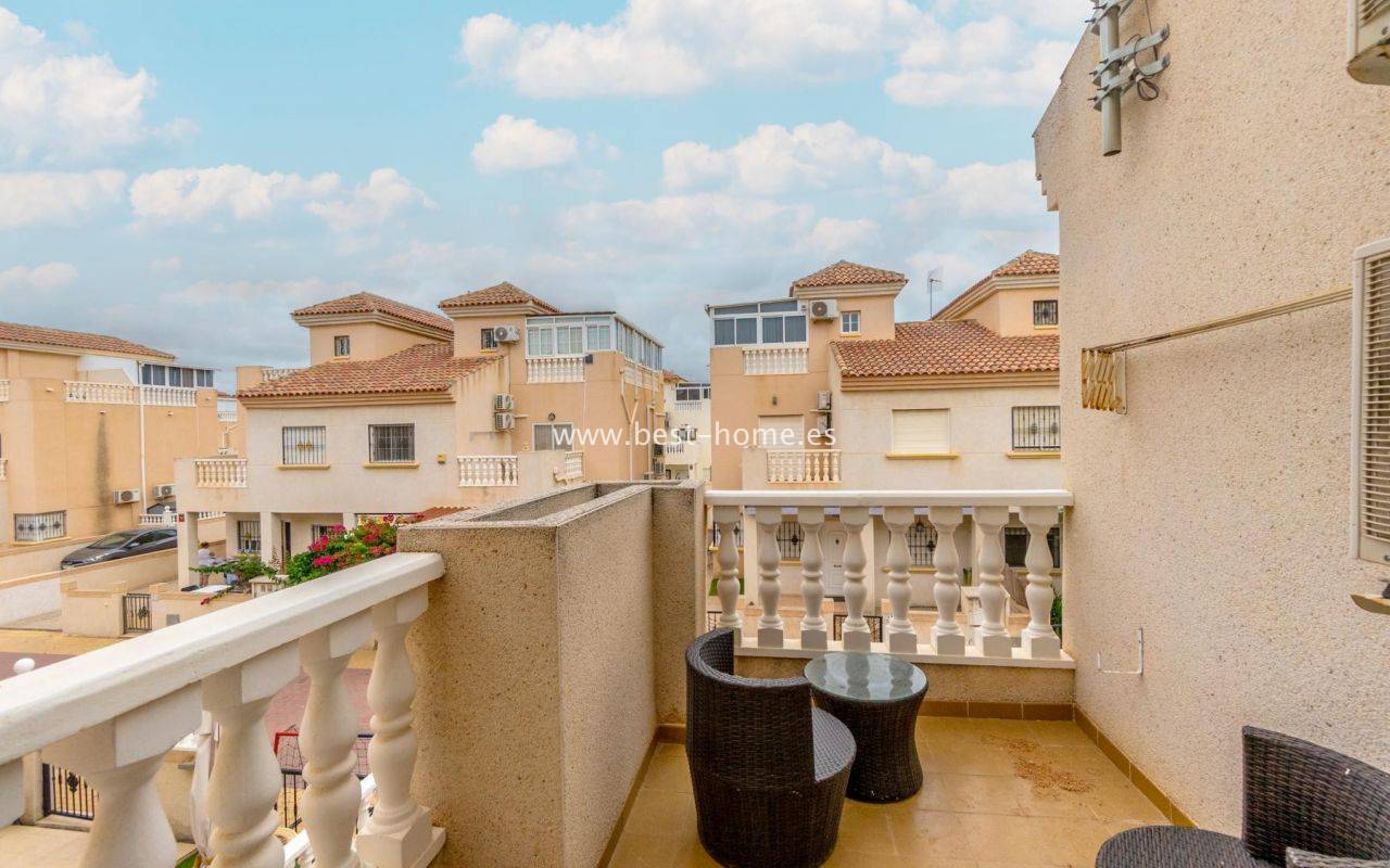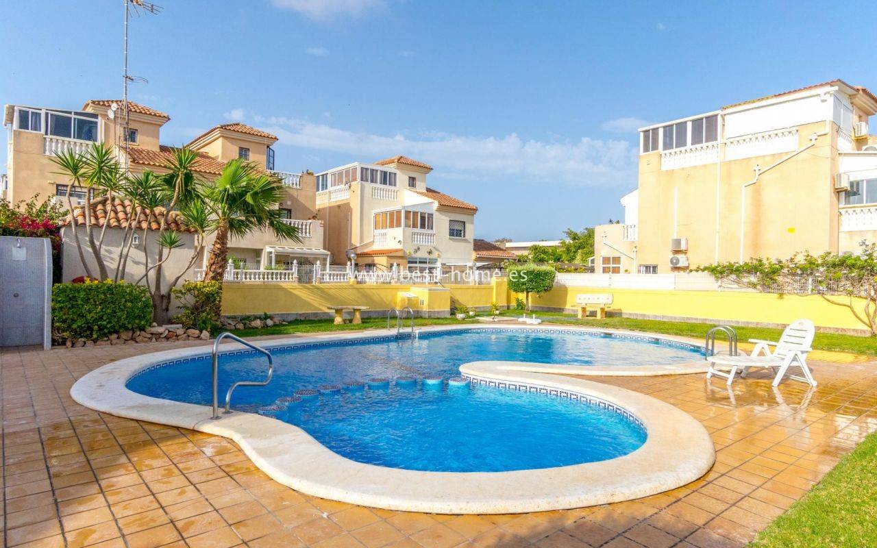Two-story duplex with a garden, parking space, solarium, and community pool in the El Coral II development in Torrevieja.On the ground floor, there's a cozy, covered terrace, perfect for enjoying breakfast in the sun, a bright living/dining room, a fully equipped, independent kitchen, a built-in utility room/laundry room, and a guest toilet. On the first floor, there are two bedrooms, one with a private terrace, and a renovated bathroom with a shower. The solarium has been covered and converted into a third bedroom or multi-purpose space. The entire property is connected by a beautiful marble staircase and is sold furnished and ready to move in. The development has a communal swimming pool and is located in a quiet area, close to all amenities: supermarkets, schools, a pharmacy, restaurants, sports facilities, cinemas, and La Siesta Park, one of the largest parks in the city.
