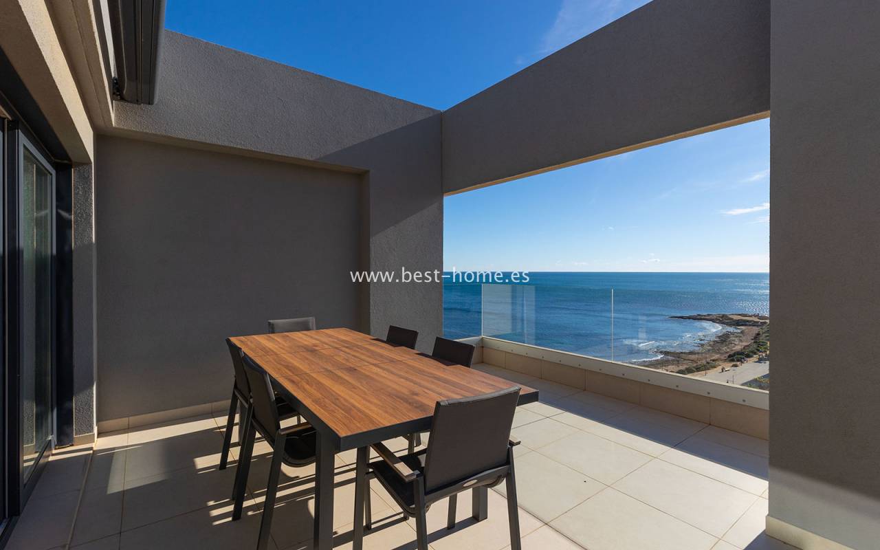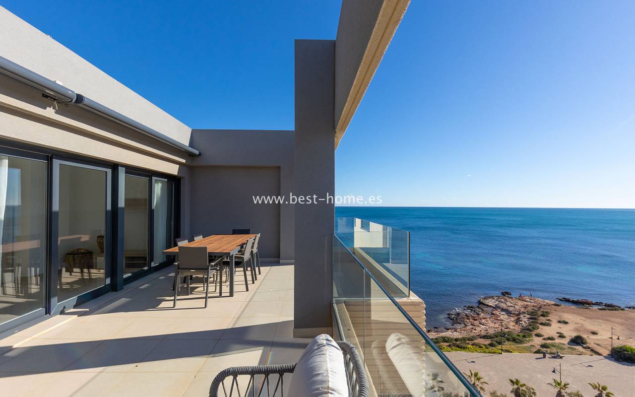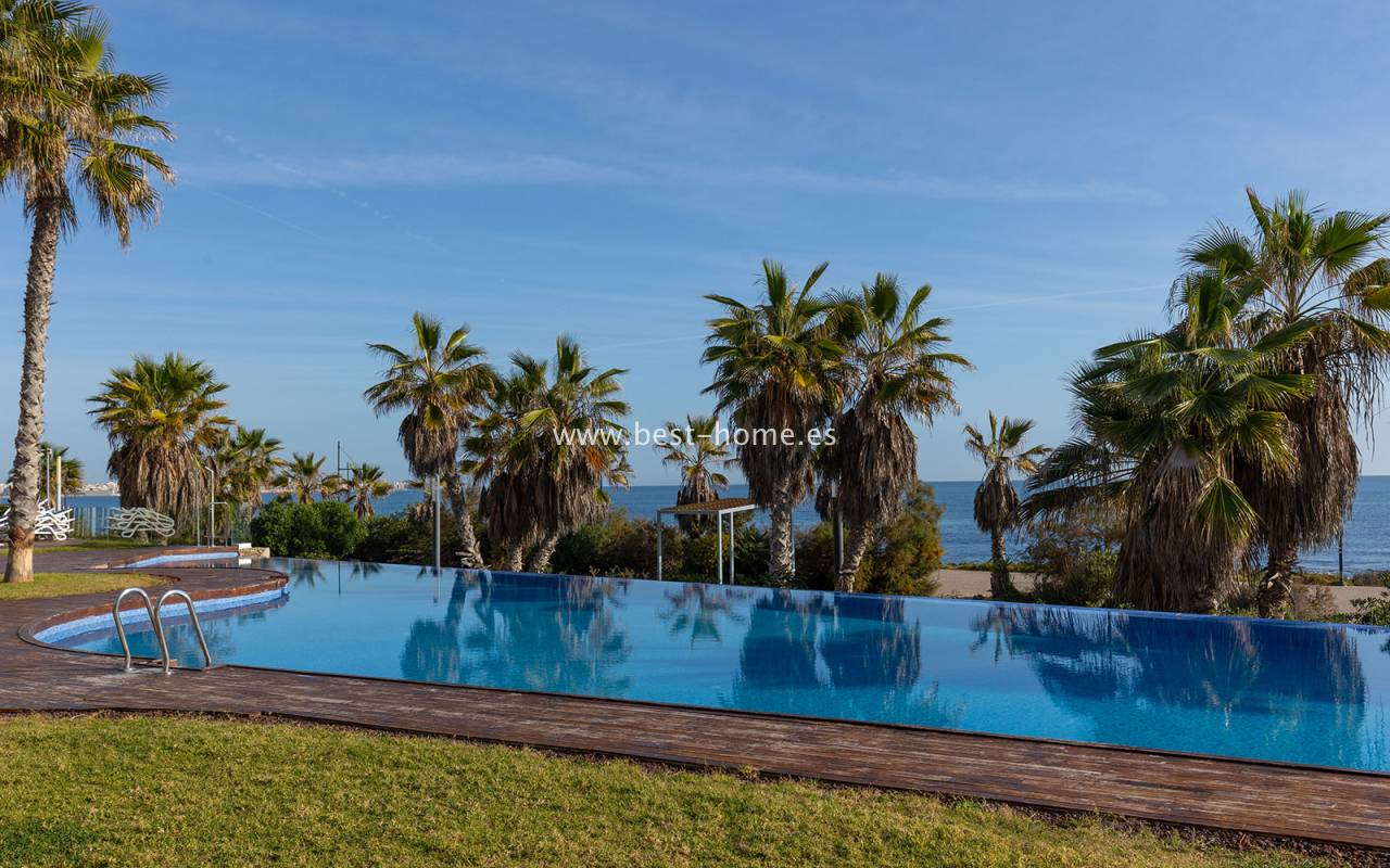 This penthouse is located in a gated, secure community on the first line of the coast. The property is on the 9th floor and comprises three bedrooms, two bathrooms, a furnished kitchen with a dining area and access to the rear terrace/laundry room, and a sunny and bright living room. The living room and one bedroom open onto a large terrace with stunning views of the sea and communal areas. The price includes furniture, appliances, central hot/cold air conditioning, a parking space, and a storage unit in the basement. The development boasts several swimming pools, including a heated one.