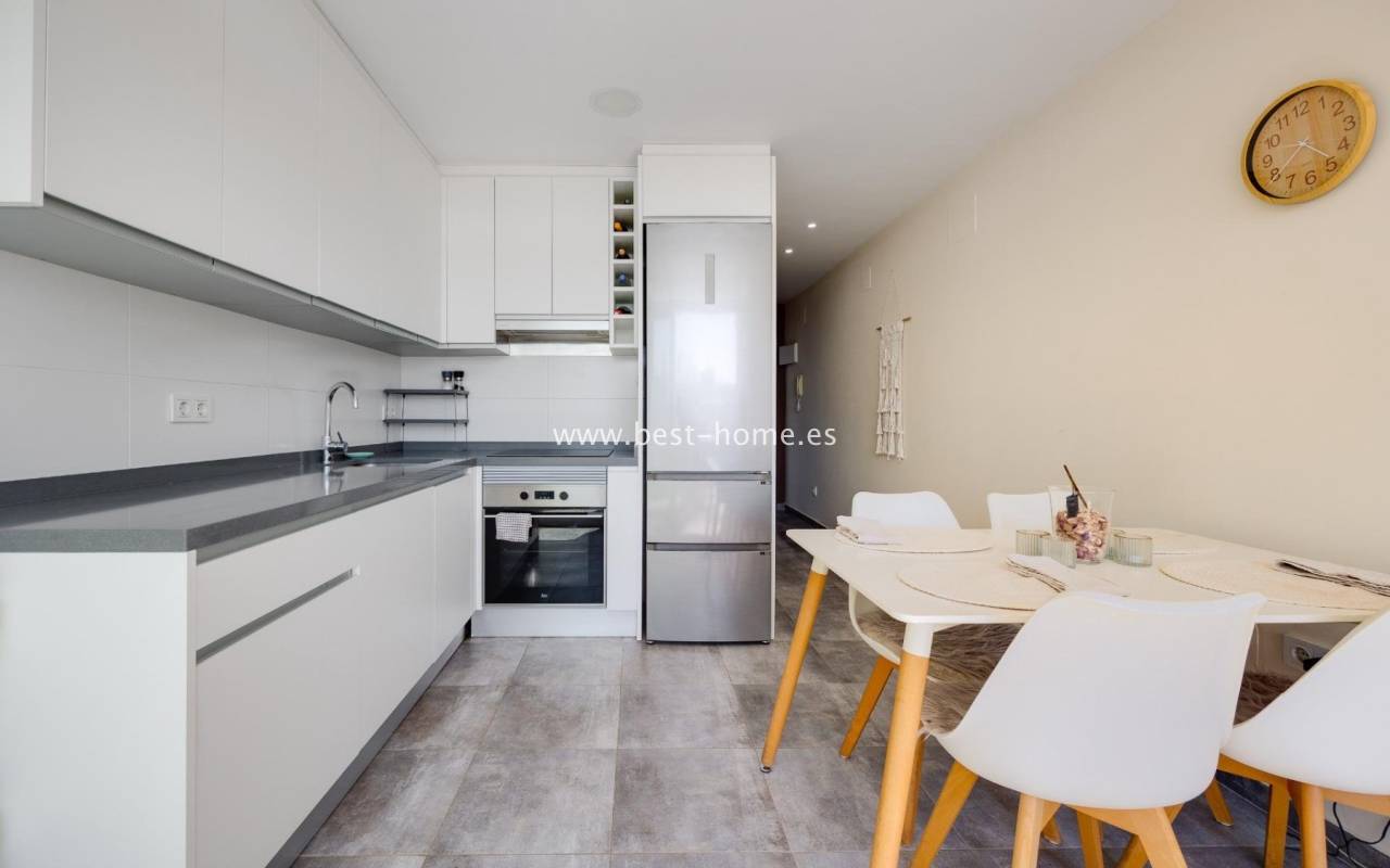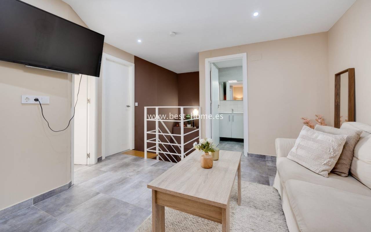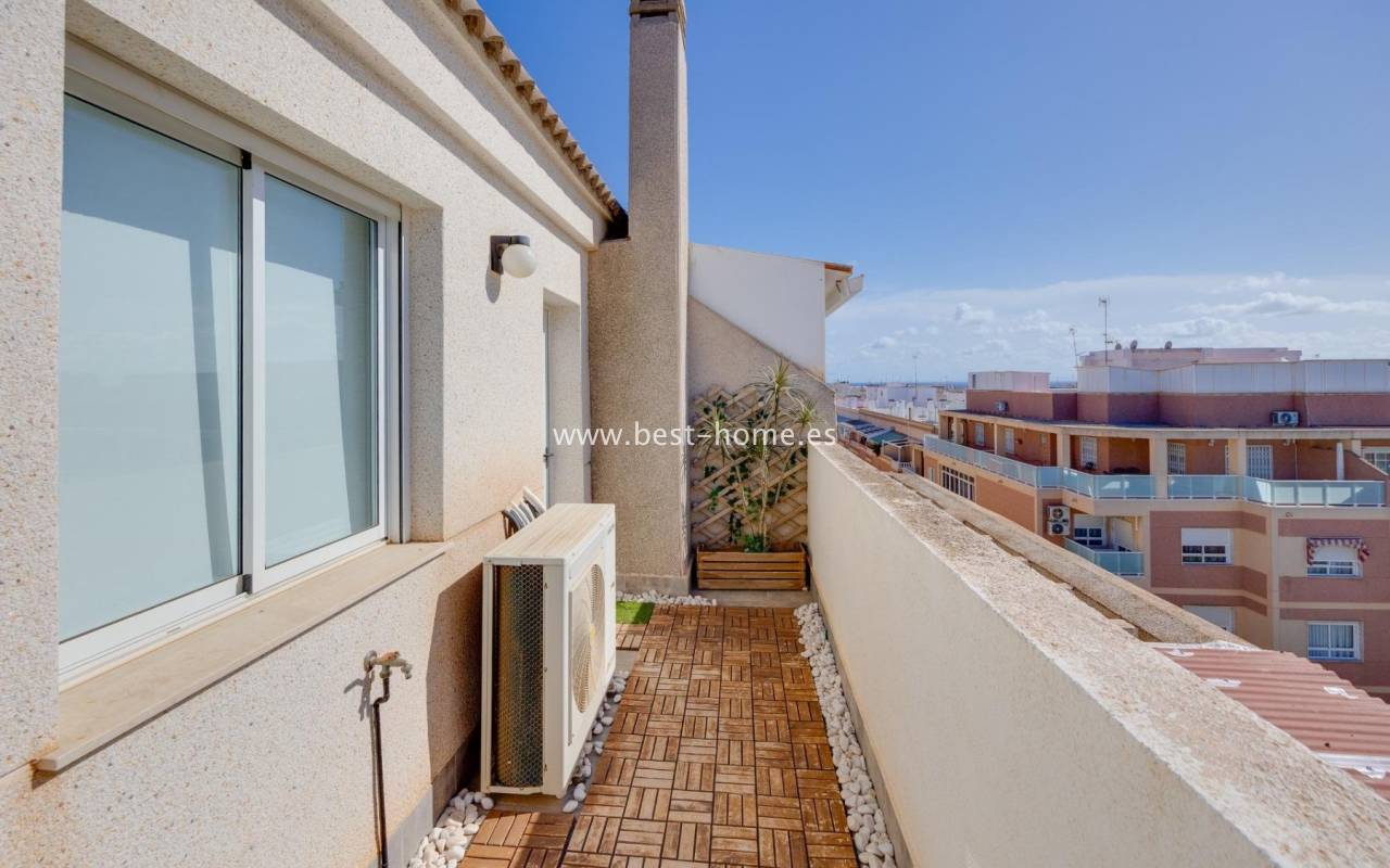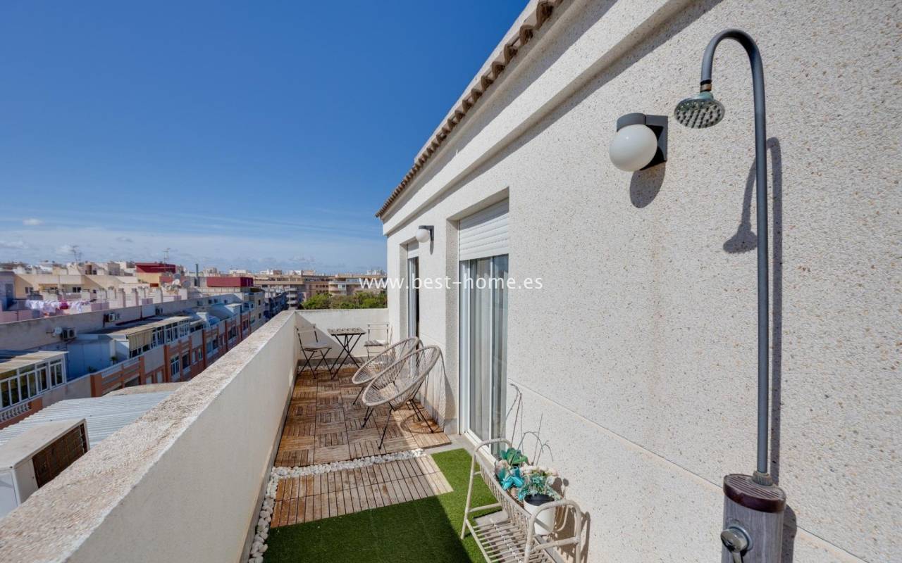 This two-level penthouse is located in the heart of Torrevieja, just a 10-minute walk from the beautiful Playa del Cura. The property stands out for its functional layout and modern design. The lower level features a bathroom, a fully equipped open kitchen with dining area, and a terrace perfect for relaxing during the day. The upper level includes three spacious bedrooms, a second bathroom, and a living room leading to another sunny terrace where you can enjoy natural light all day long. Additionally, there is a laundry area on the terrace with independent access to storage. Thanks to its central location, all amenities are within walking distance, making this property ideal for both year-round living and summer vacations.