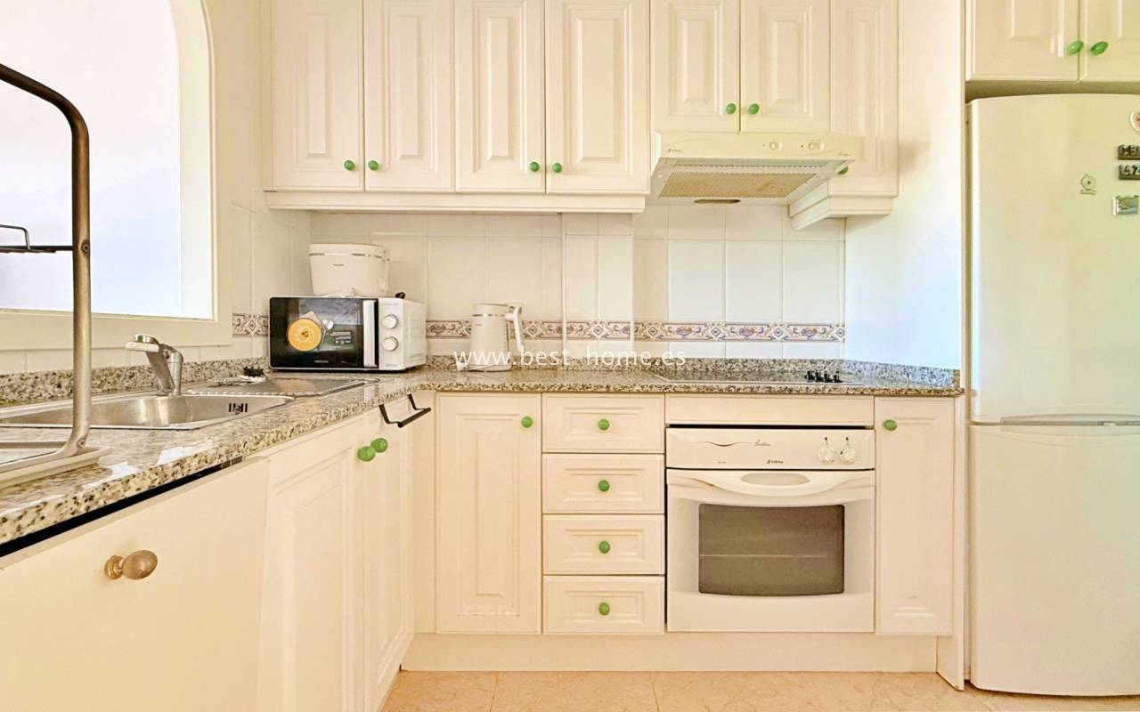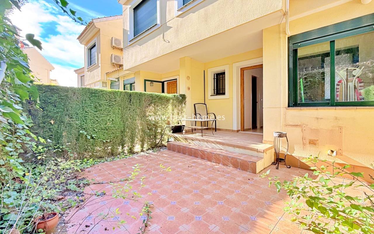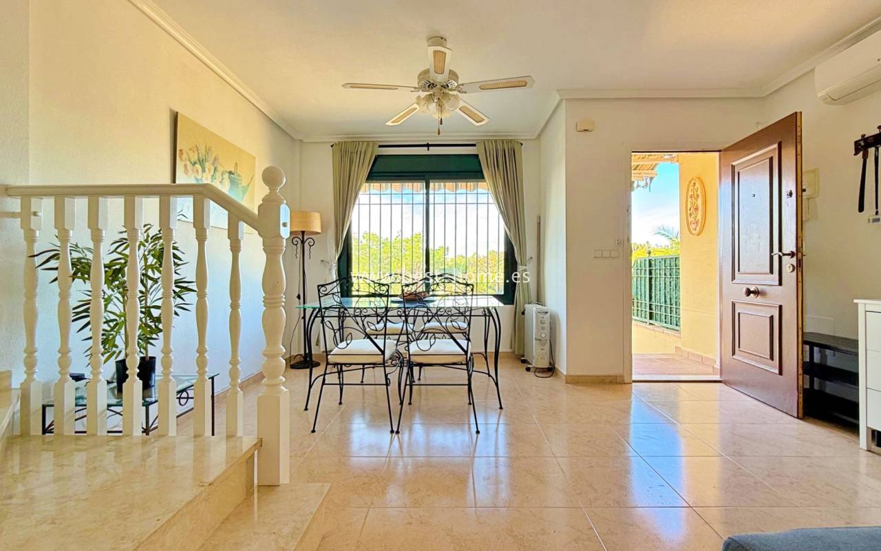 This attractive terraced house is situated in a prime location by the golf course. The property boasts a sunny front entrance, a living/dining room, a fitted kitchen with a utility room, a bathroom, and access to the rear terrace. On the first floor, you'll find two bedrooms (the master with a terrace) and a second bathroom. One floor above is an additional terrace. The property is furnished and equipped, and boasts beautiful communal areas and a swimming pool.