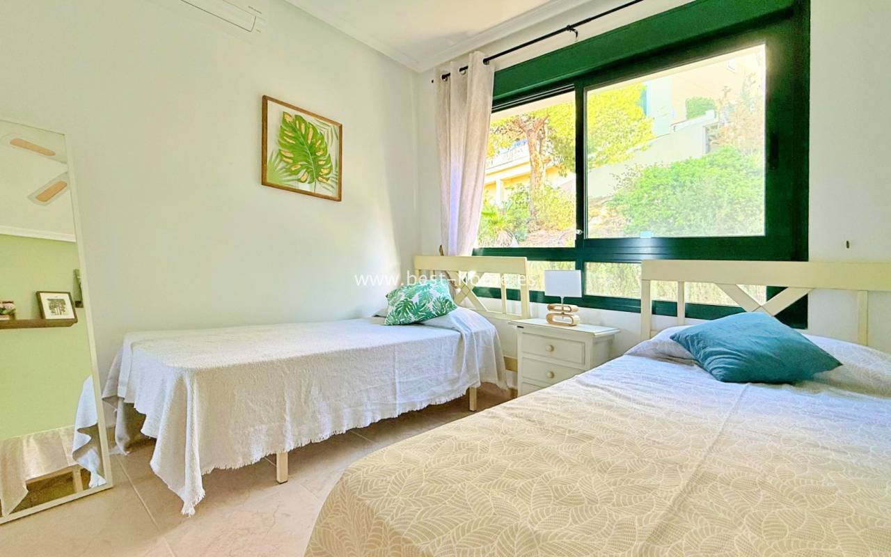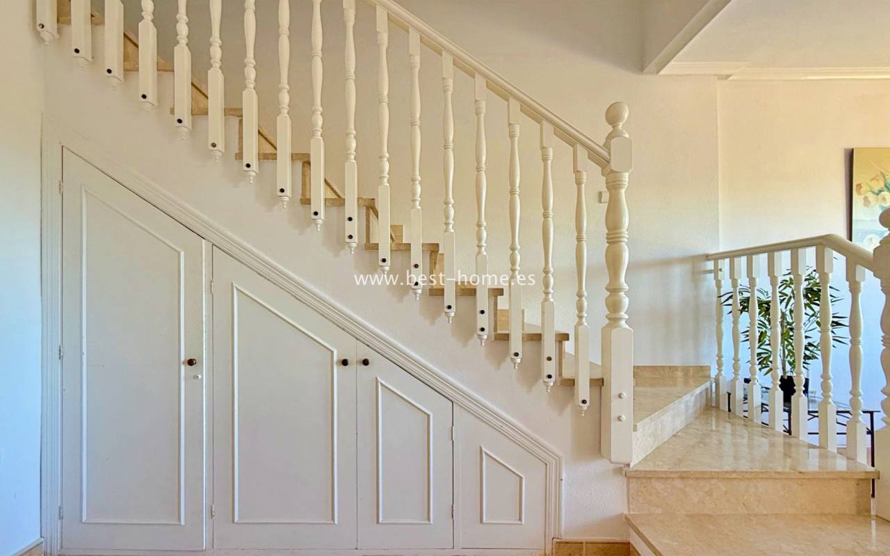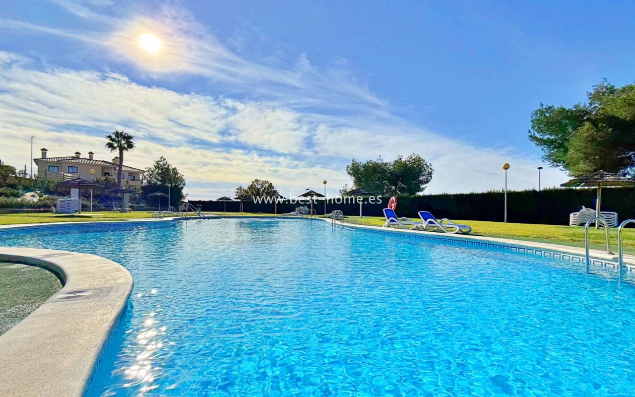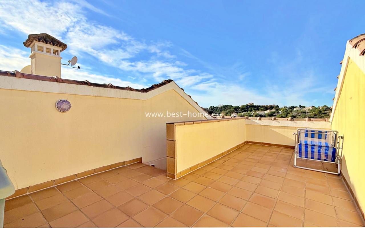 This attractive terraced house is situated in a prime location by the golf course. The property boasts a sunny front entrance, a living/dining room, a fitted kitchen with a utility room, a bathroom, and access to the rear terrace. On the first floor, you'll find two bedrooms (the master with a terrace) and a second bathroom. One floor above is an additional terrace. The property is furnished and equipped, and boasts beautiful communal areas and a swimming pool.