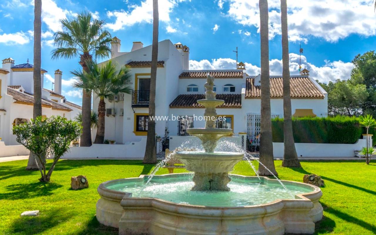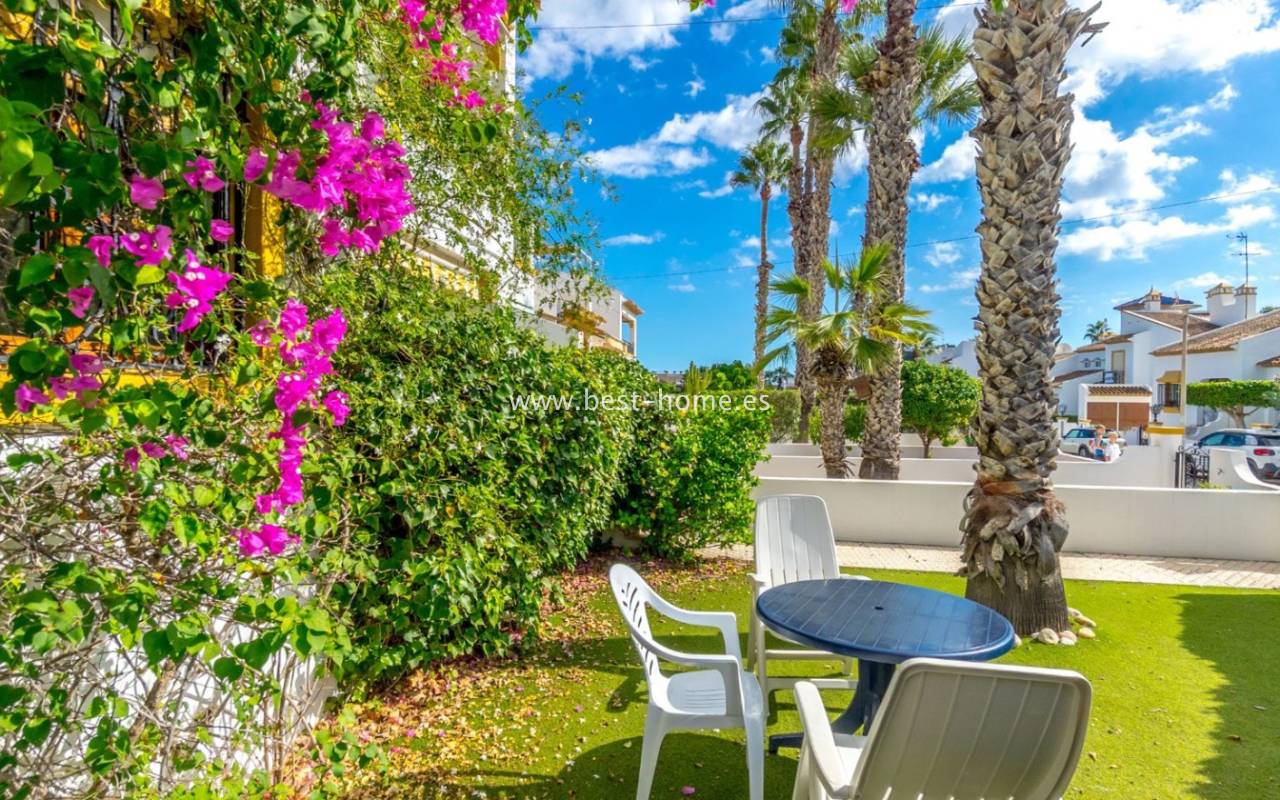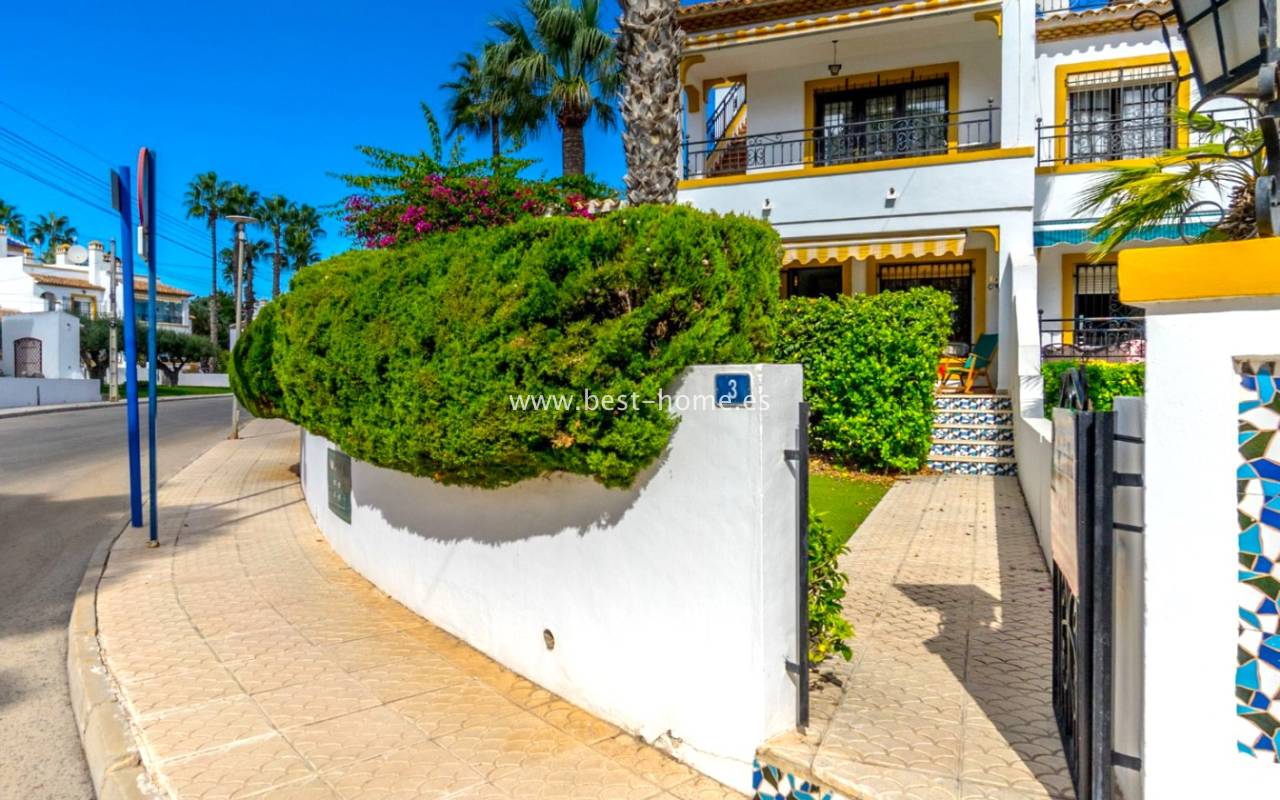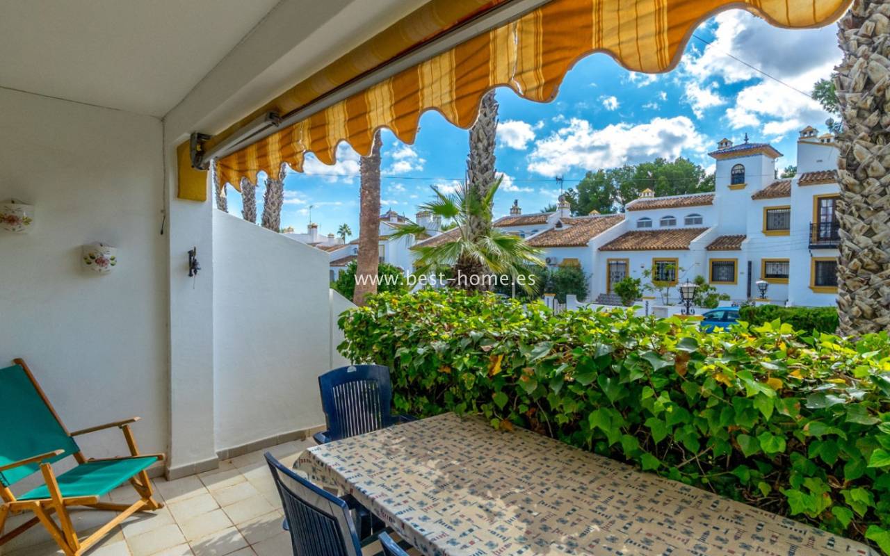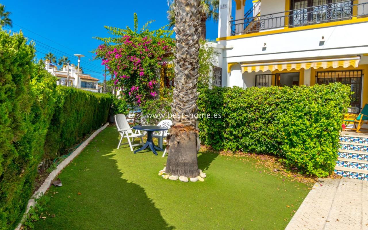This bungalow is located in the beautiful, leafy Valencia urbanization in Villamartin. The property features a corner garden, an entrance terrace, a living room with a dining area and fireplace, a furnished kitchen with a utility room, two bedrooms, and a bathroom. Three bedrooms are also accessible from the terrace. The urbanization boasts parks, swimming pools, a restaurant, and tennis courts. A small shopping center is also nearby.