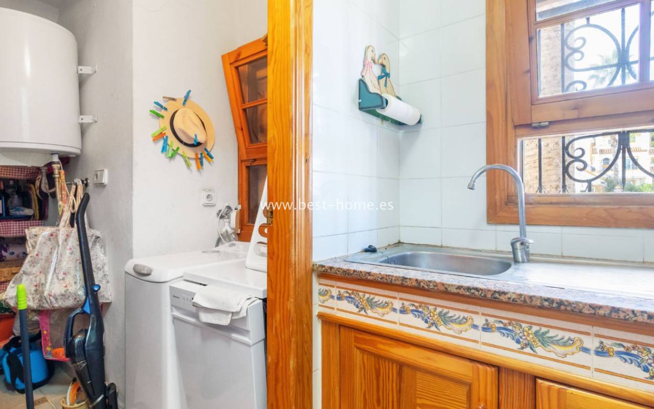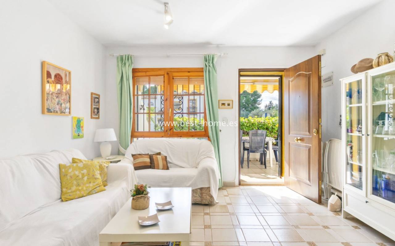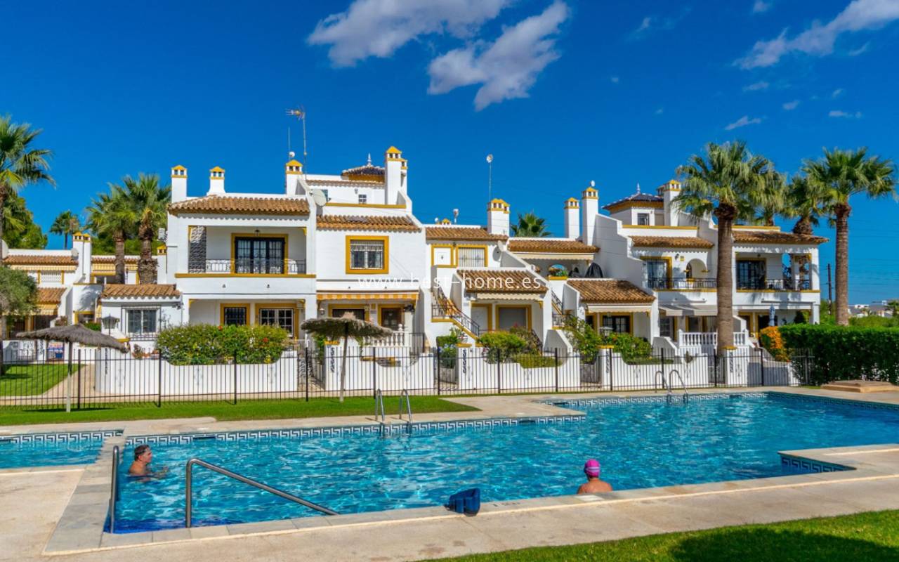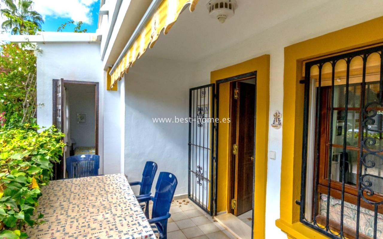 This bungalow is located in the beautiful, leafy Valencia urbanization in Villamartin. The property features a corner garden, an entrance terrace, a living room with a dining area and fireplace, a furnished kitchen with a utility room, two bedrooms, and a bathroom. Three bedrooms are also accessible from the terrace. The urbanization boasts parks, swimming pools, a restaurant, and tennis courts. A small shopping center is also nearby.