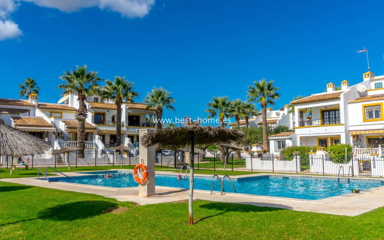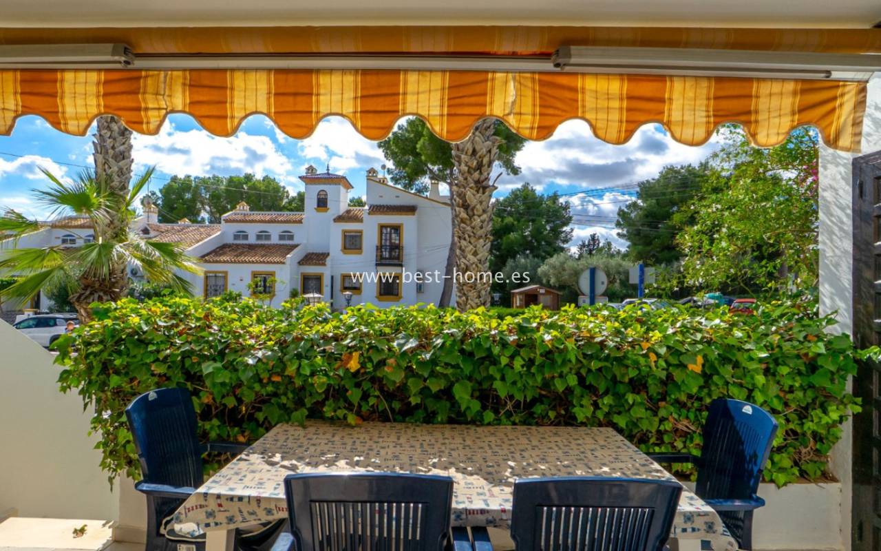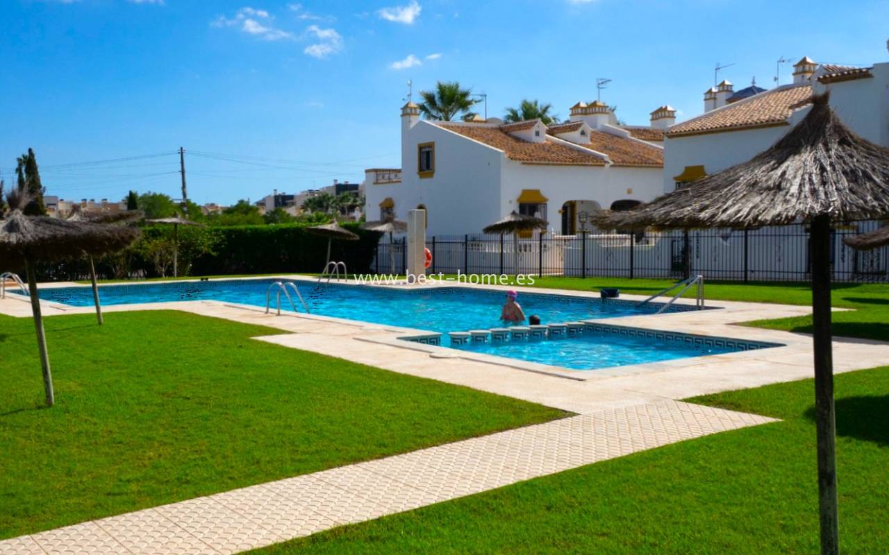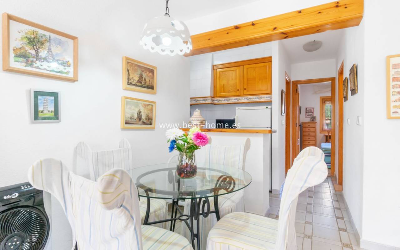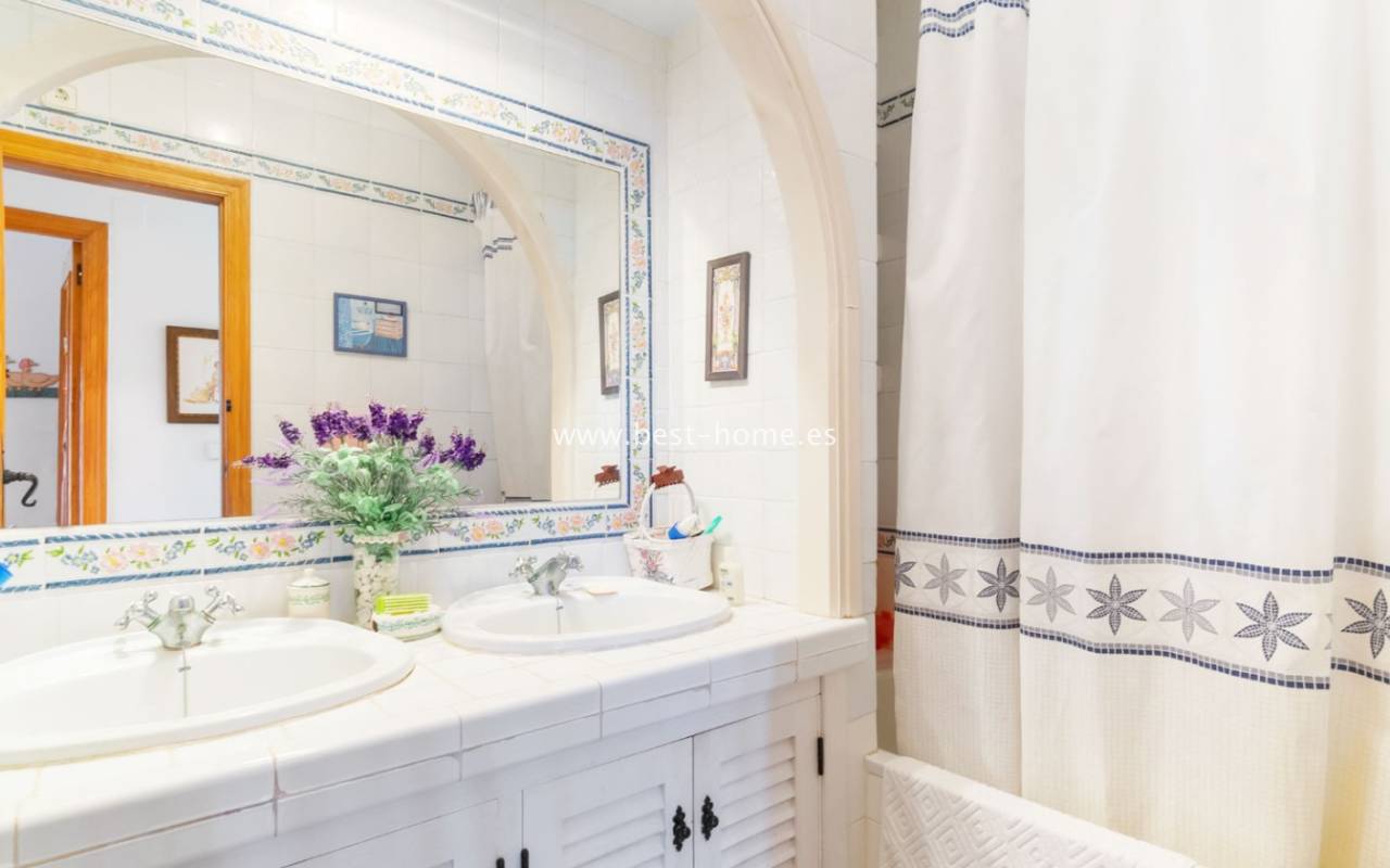 This bungalow is located in the beautiful, leafy Valencia urbanization in Villamartin. The property features a corner garden, an entrance terrace, a living room with a dining area and fireplace, a furnished kitchen with a utility room, two bedrooms, and a bathroom. Three bedrooms are also accessible from the terrace. The urbanization boasts parks, swimming pools, a restaurant, and tennis courts. A small shopping center is also nearby.