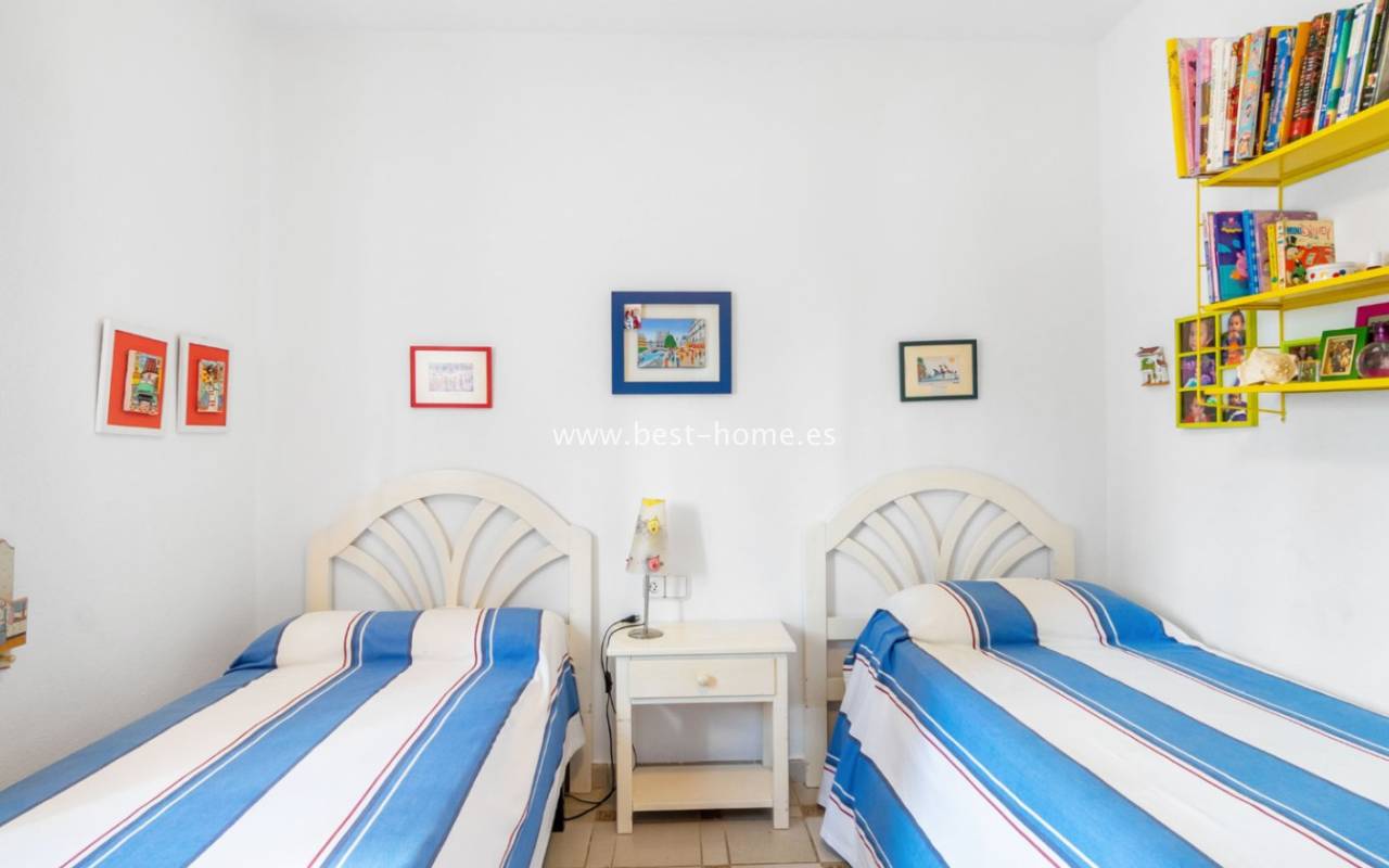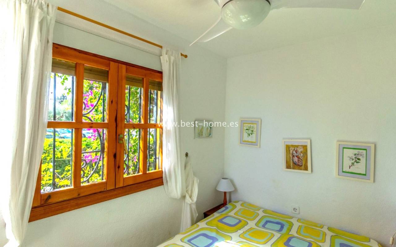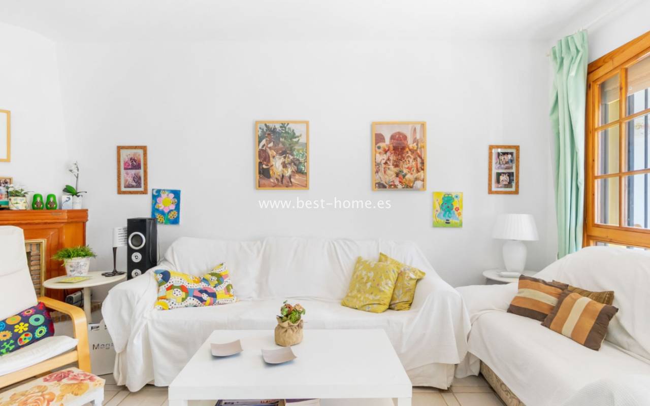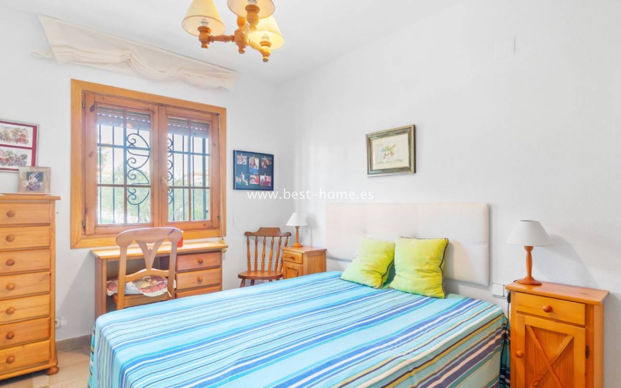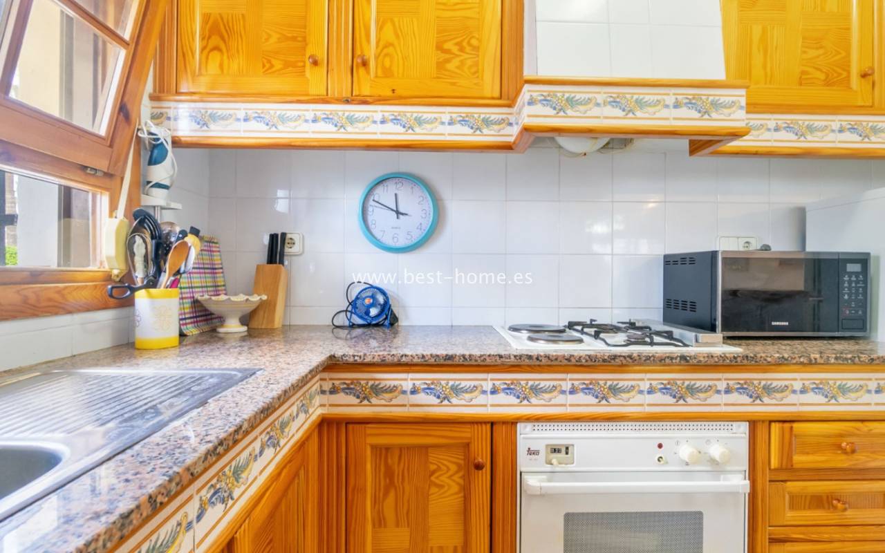 This bungalow is located in the beautiful, leafy Valencia urbanization in Villamartin. The property features a corner garden, an entrance terrace, a living room with a dining area and fireplace, a furnished kitchen with a utility room, two bedrooms, and a bathroom. Three bedrooms are also accessible from the terrace. The urbanization boasts parks, swimming pools, a restaurant, and tennis courts. A small shopping center is also nearby.