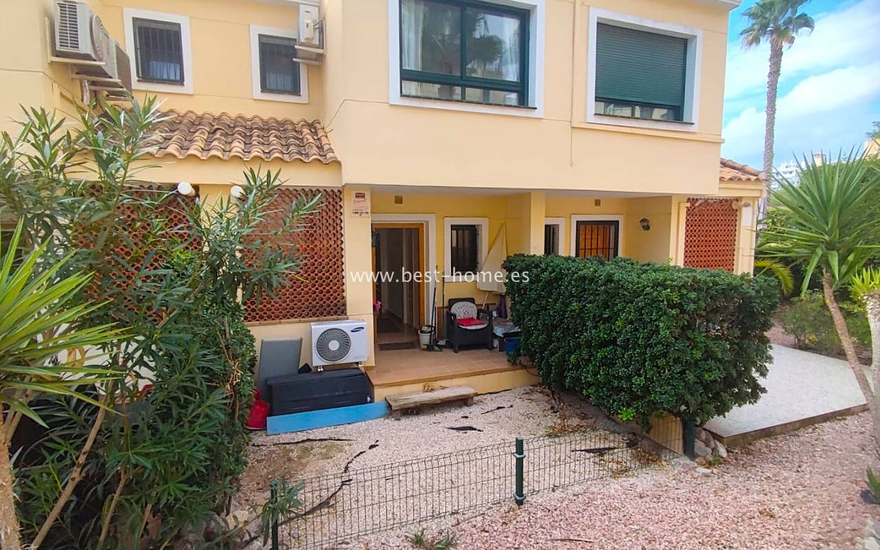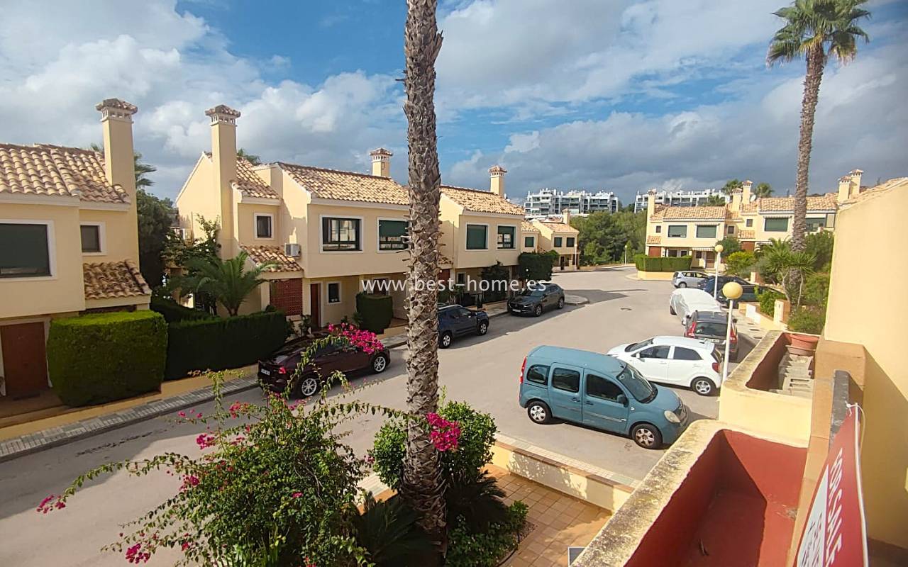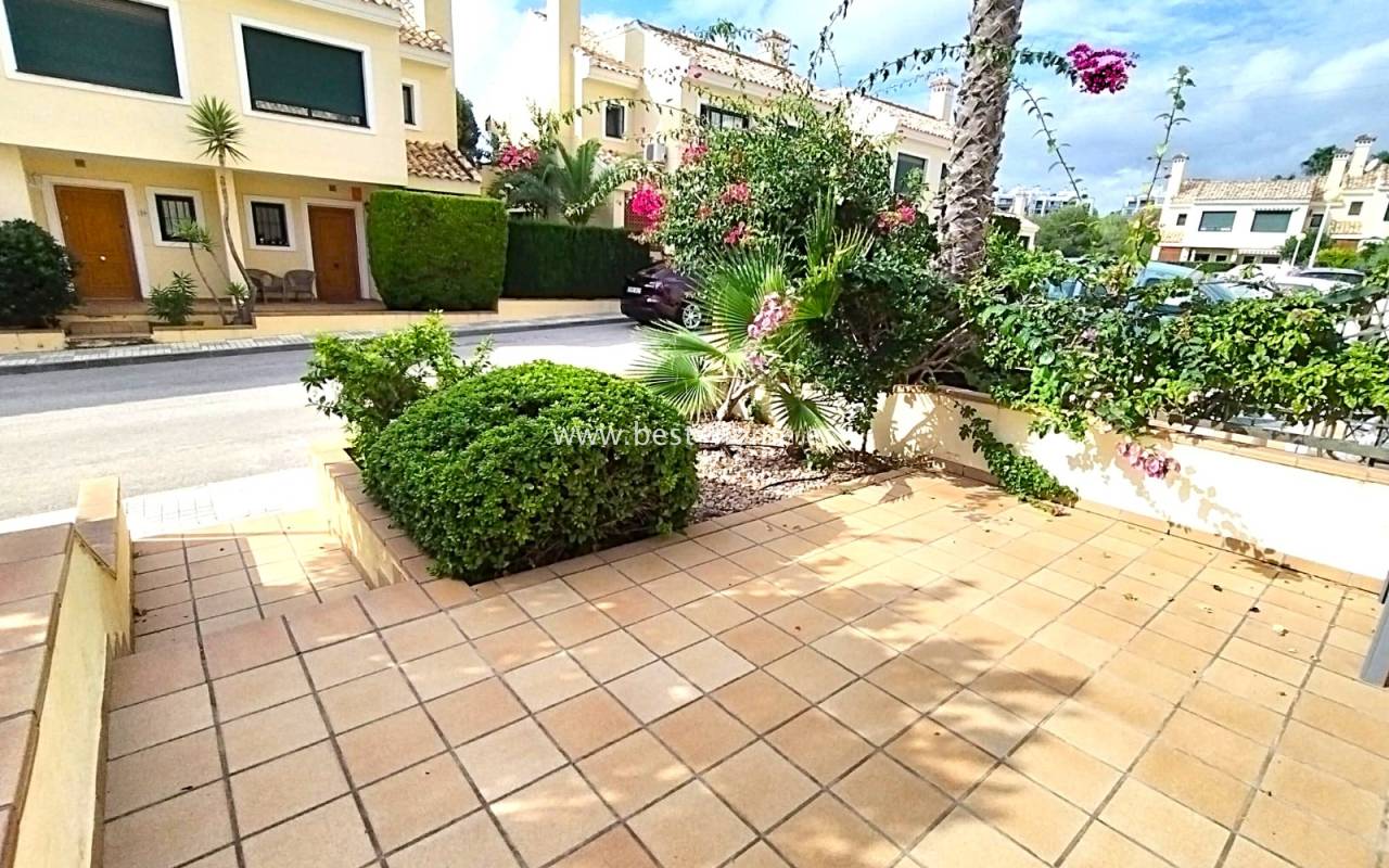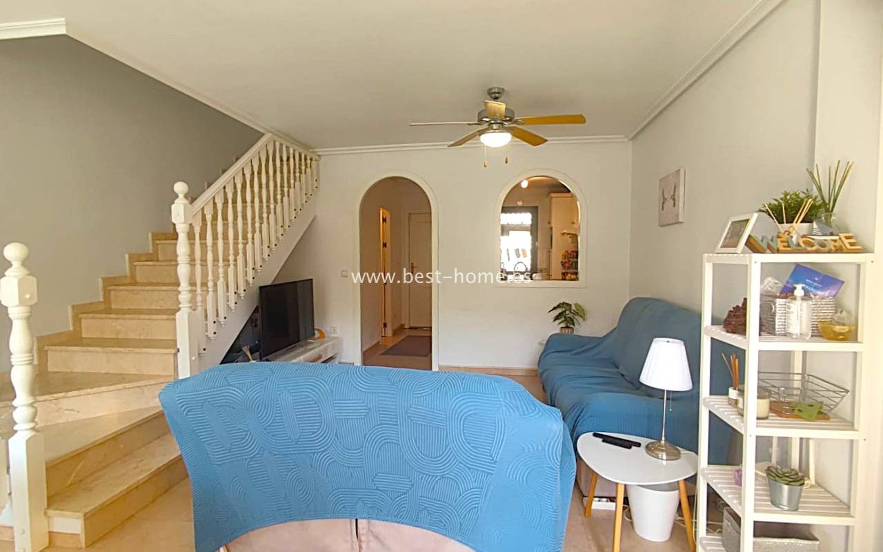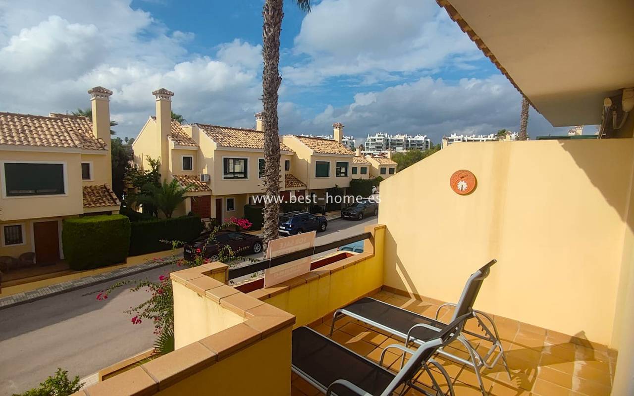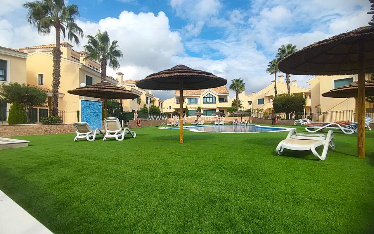 This beautifully presented south-facing townhouse is located in the prestigious Campoamor Golf Complex, just a short walk from La Fuente Commercial Centre and all local amenities. The property perfectly combines comfort, location, and lifestyle, making it ideal as a permanent residence, holiday home, or rental investment. It features two spacious double bedrooms, two bathrooms, two terraces – one facing south and one facing north – and a private solarium. The fully equipped kitchen includes a laundry room/pantry. Residents have access to six communal swimming pools and 24-hour security. Situated in a quiet and peaceful area, the townhouse is close to shops, restaurants, golf courses, and beaches, with excellent sun exposure providing bright living spaces throughout the day. The property is in excellent condition and ready to move into.