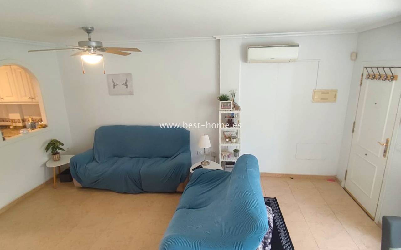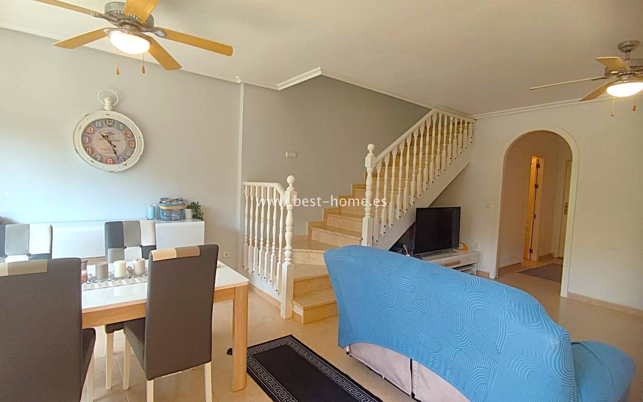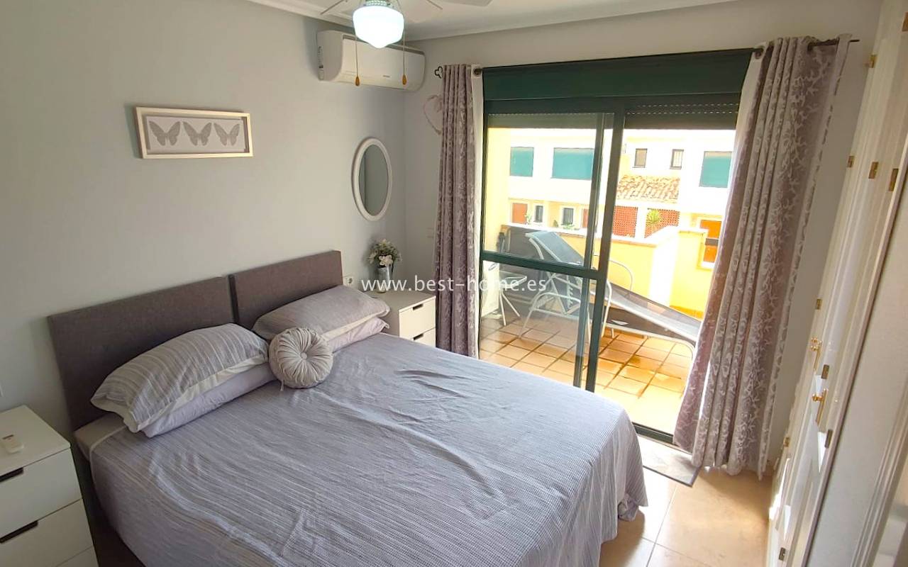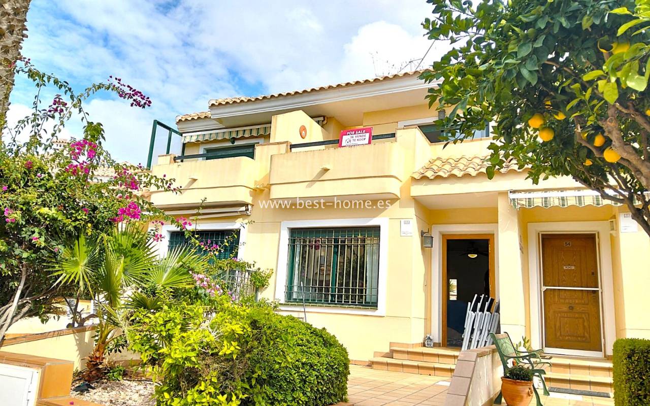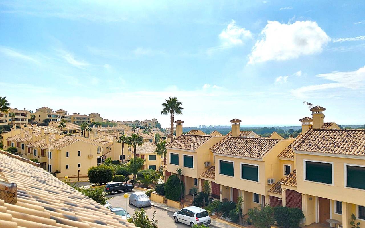 This beautifully presented south-facing townhouse is located in the prestigious Campoamor Golf Complex, just a short walk from La Fuente Commercial Centre and all local amenities. The property perfectly combines comfort, location, and lifestyle, making it ideal as a permanent residence, holiday home, or rental investment. It features two spacious double bedrooms, two bathrooms, two terraces – one facing south and one facing north – and a private solarium. The fully equipped kitchen includes a laundry room/pantry. Residents have access to six communal swimming pools and 24-hour security. Situated in a quiet and peaceful area, the townhouse is close to shops, restaurants, golf courses, and beaches, with excellent sun exposure providing bright living spaces throughout the day. The property is in excellent condition and ready to move into.