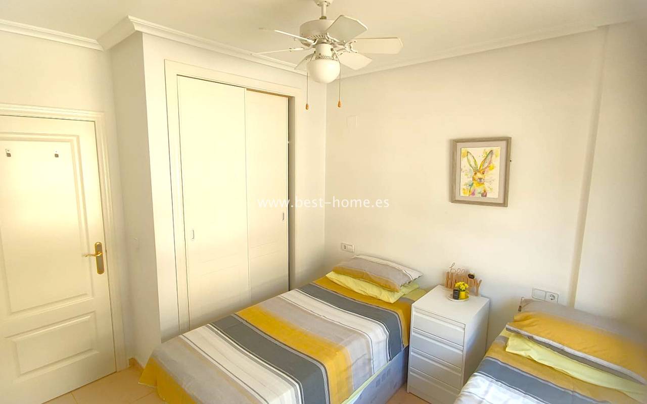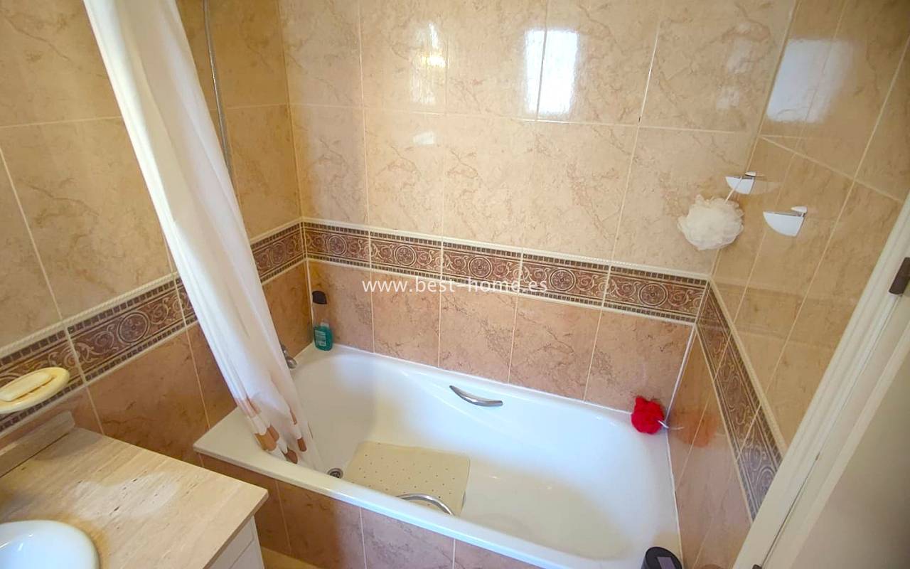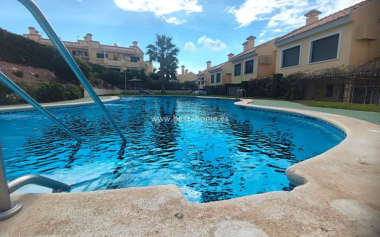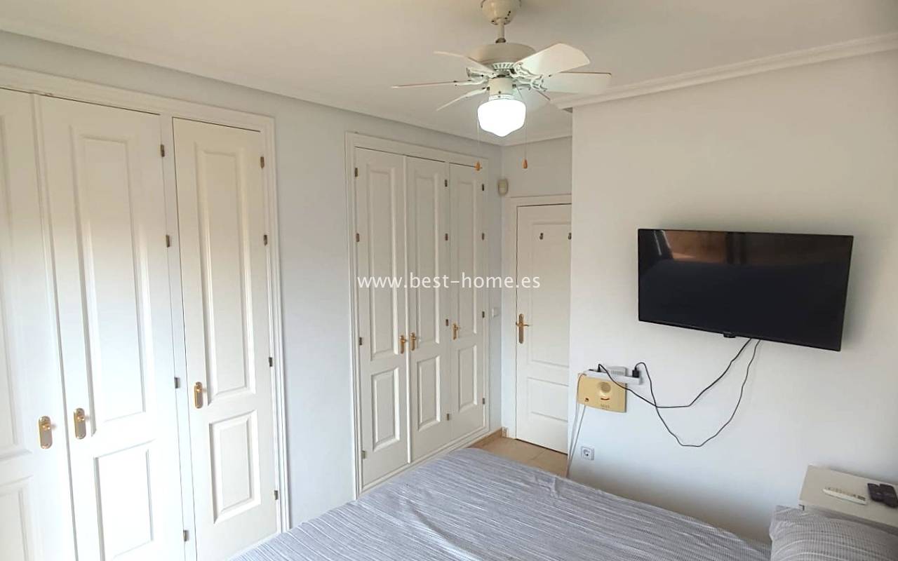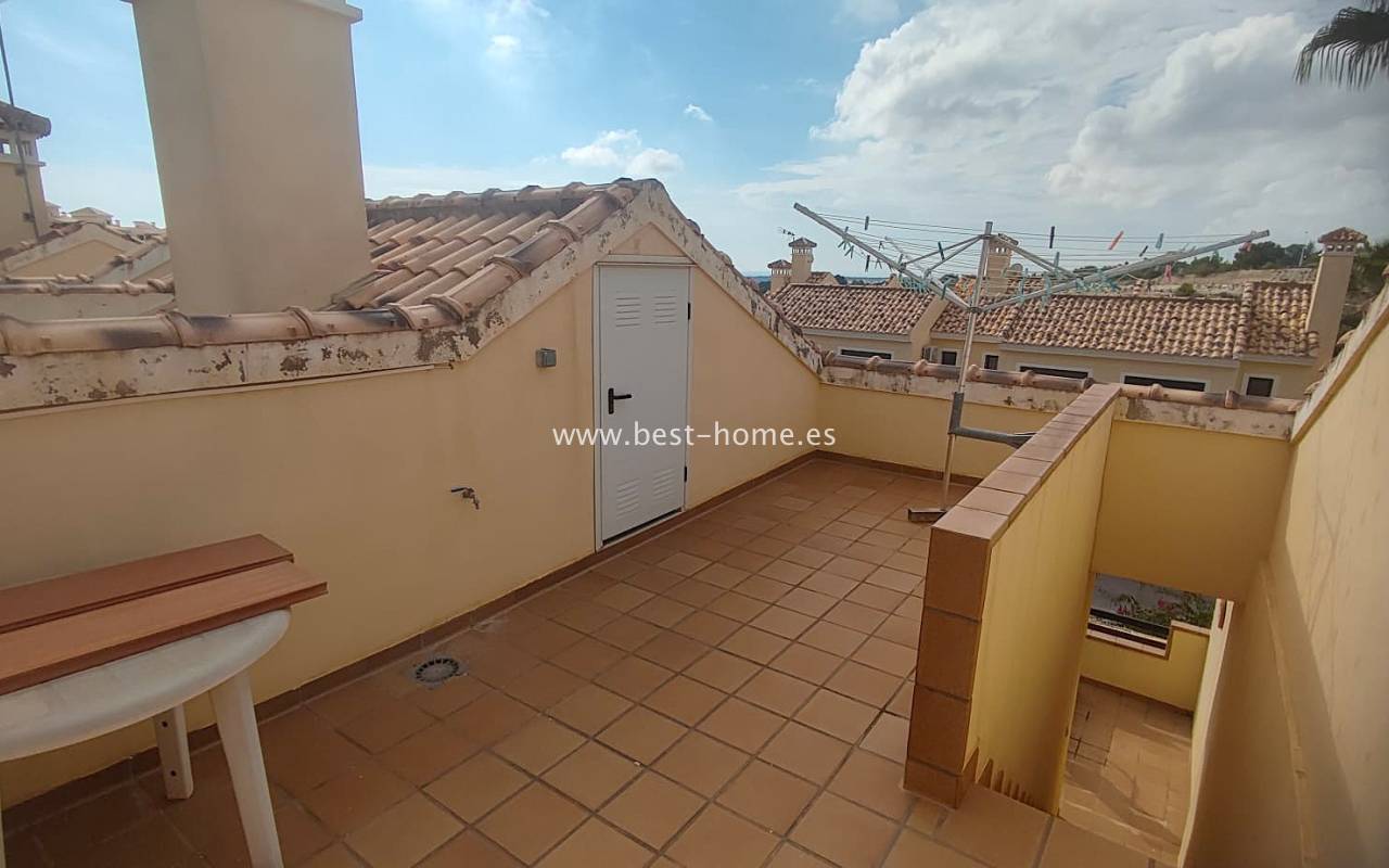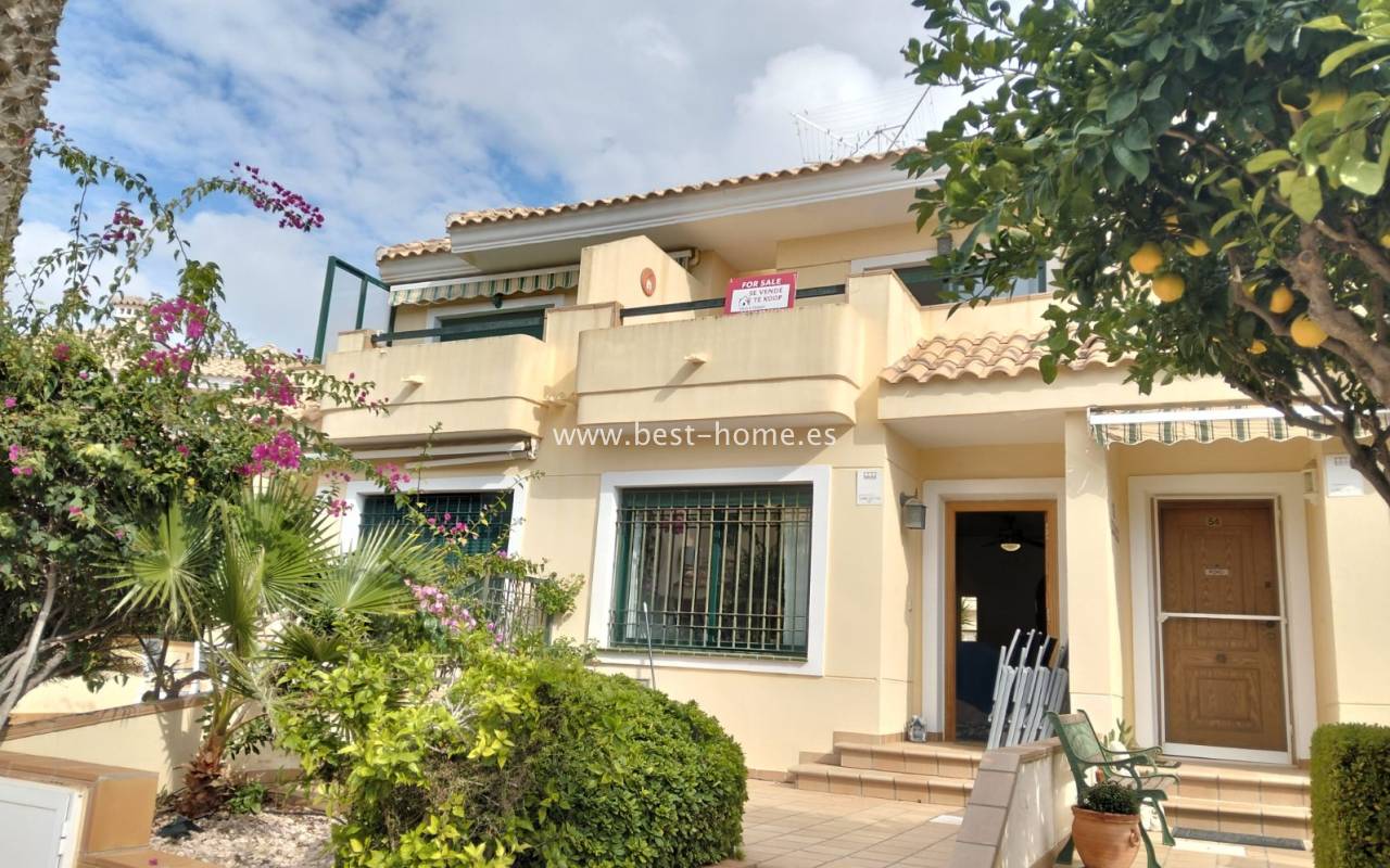 This beautifully presented south-facing townhouse is located in the prestigious Campoamor Golf Complex, just a short walk from La Fuente Commercial Centre and all local amenities. The property perfectly combines comfort, location, and lifestyle, making it ideal as a permanent residence, holiday home, or rental investment. It features two spacious double bedrooms, two bathrooms, two terraces – one facing south and one facing north – and a private solarium. The fully equipped kitchen includes a laundry room/pantry. Residents have access to six communal swimming pools and 24-hour security. Situated in a quiet and peaceful area, the townhouse is close to shops, restaurants, golf courses, and beaches, with excellent sun exposure providing bright living spaces throughout the day. The property is in excellent condition and ready to move into.