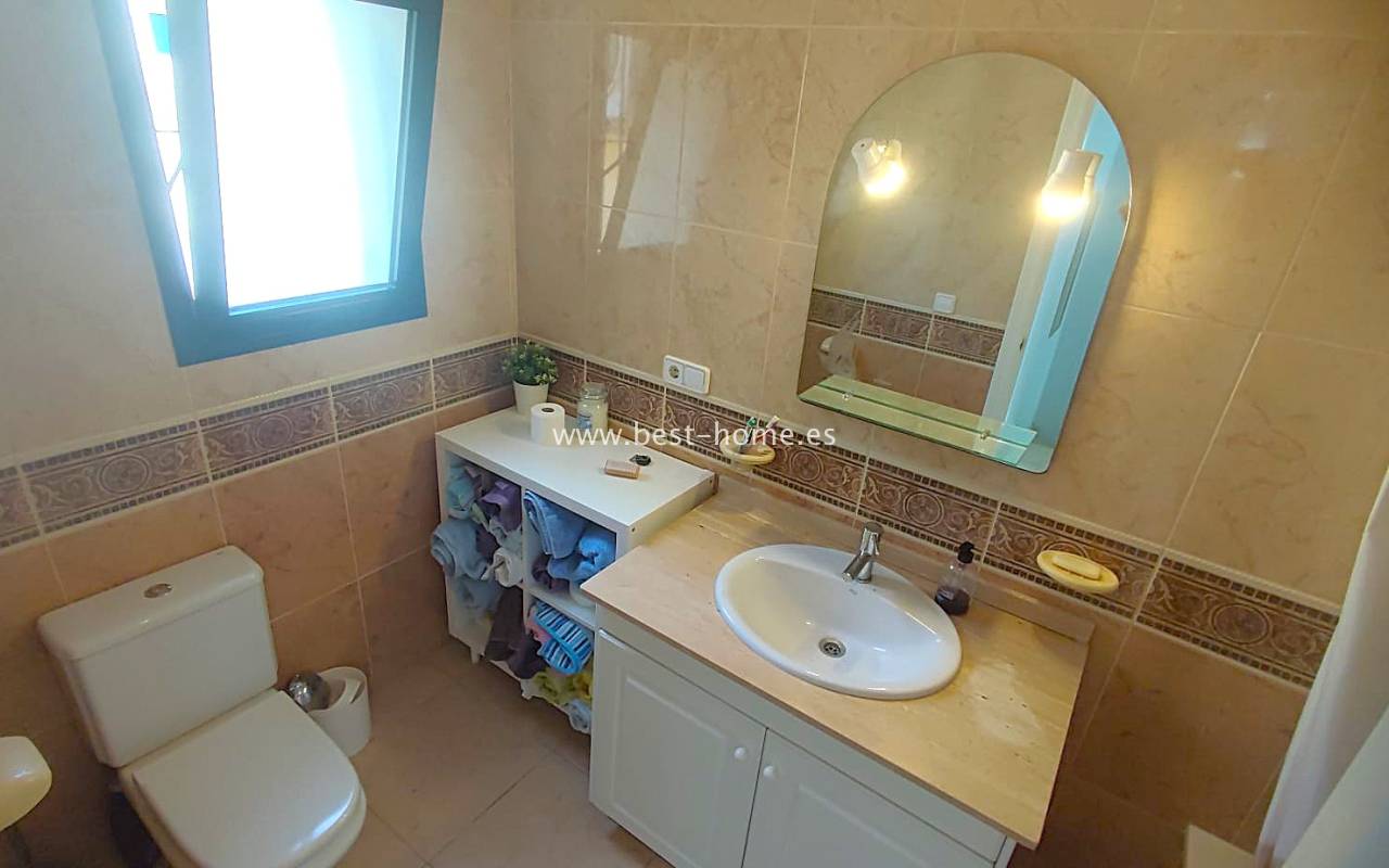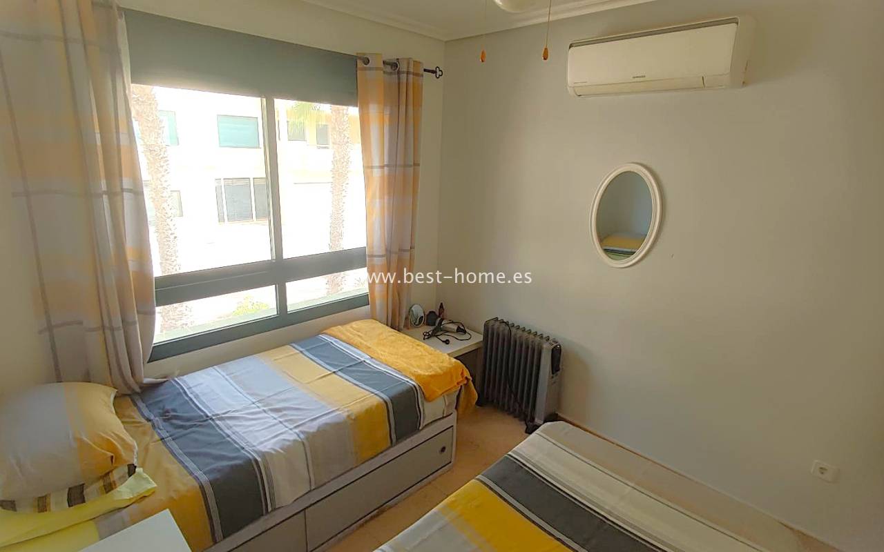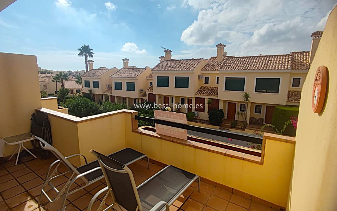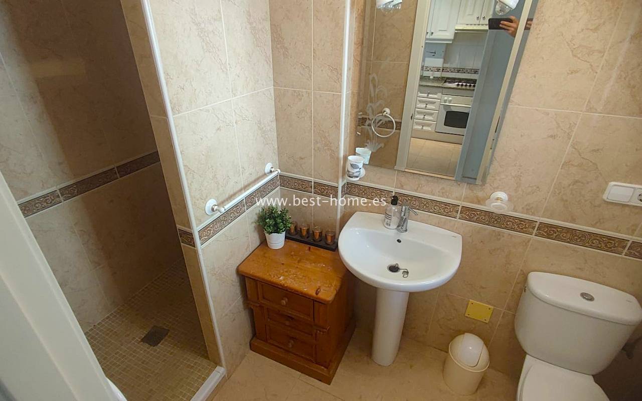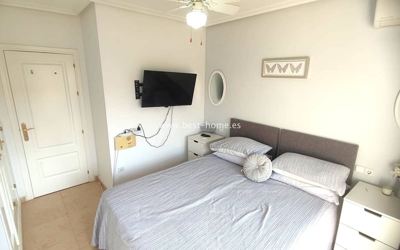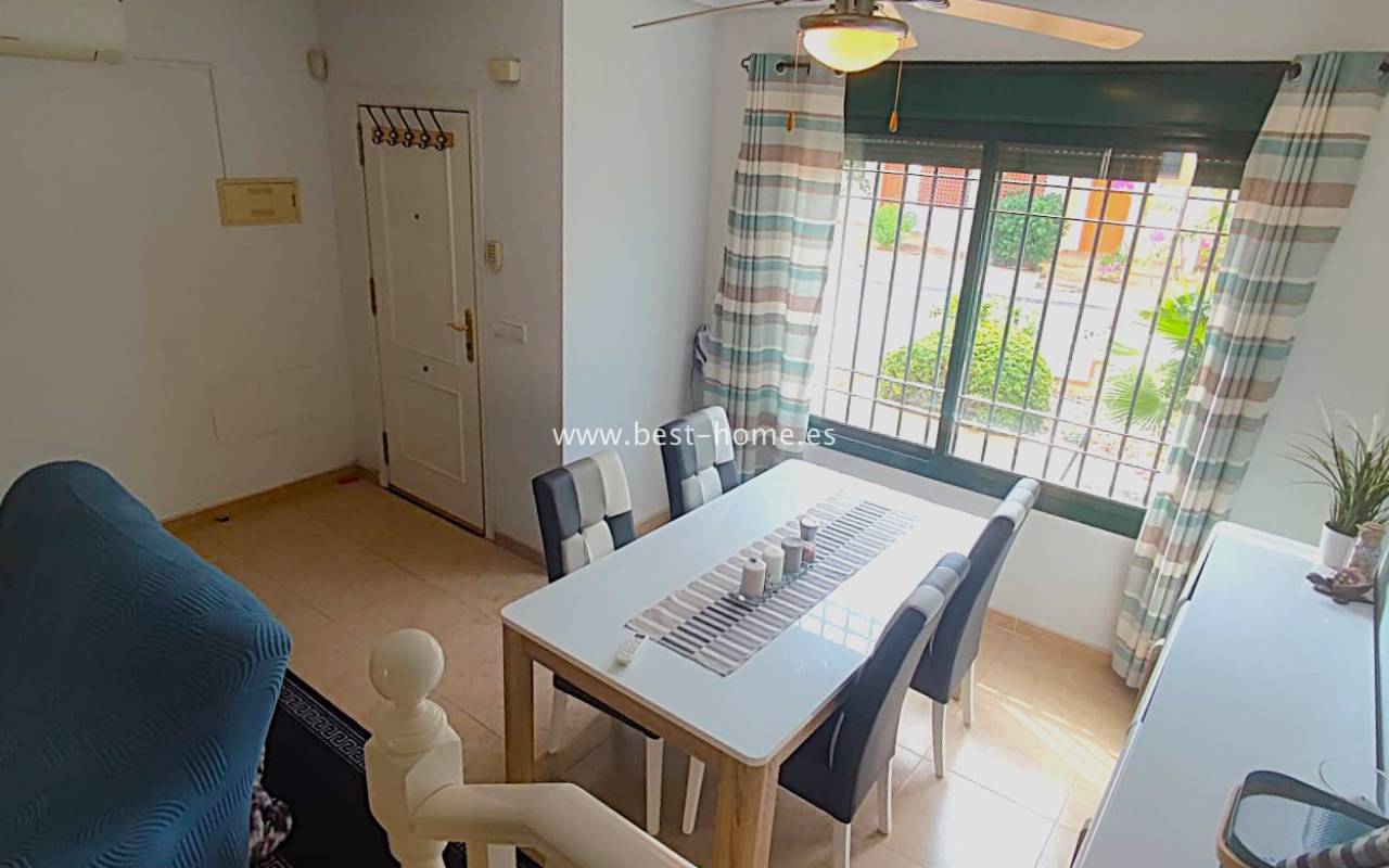 This beautifully presented south-facing townhouse is located in the prestigious Campoamor Golf Complex, just a short walk from La Fuente Commercial Centre and all local amenities. The property perfectly combines comfort, location, and lifestyle, making it ideal as a permanent residence, holiday home, or rental investment. It features two spacious double bedrooms, two bathrooms, two terraces – one facing south and one facing north – and a private solarium. The fully equipped kitchen includes a laundry room/pantry. Residents have access to six communal swimming pools and 24-hour security. Situated in a quiet and peaceful area, the townhouse is close to shops, restaurants, golf courses, and beaches, with excellent sun exposure providing bright living spaces throughout the day. The property is in excellent condition and ready to move into.