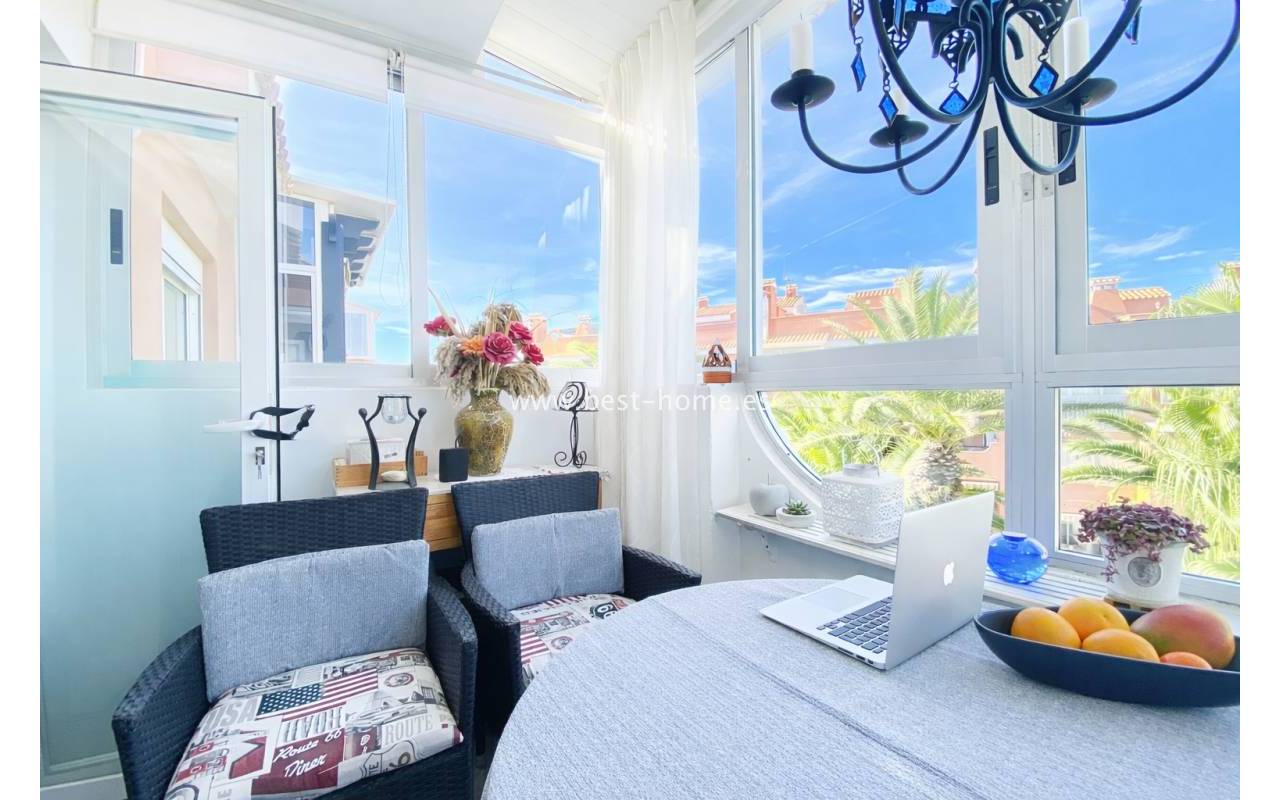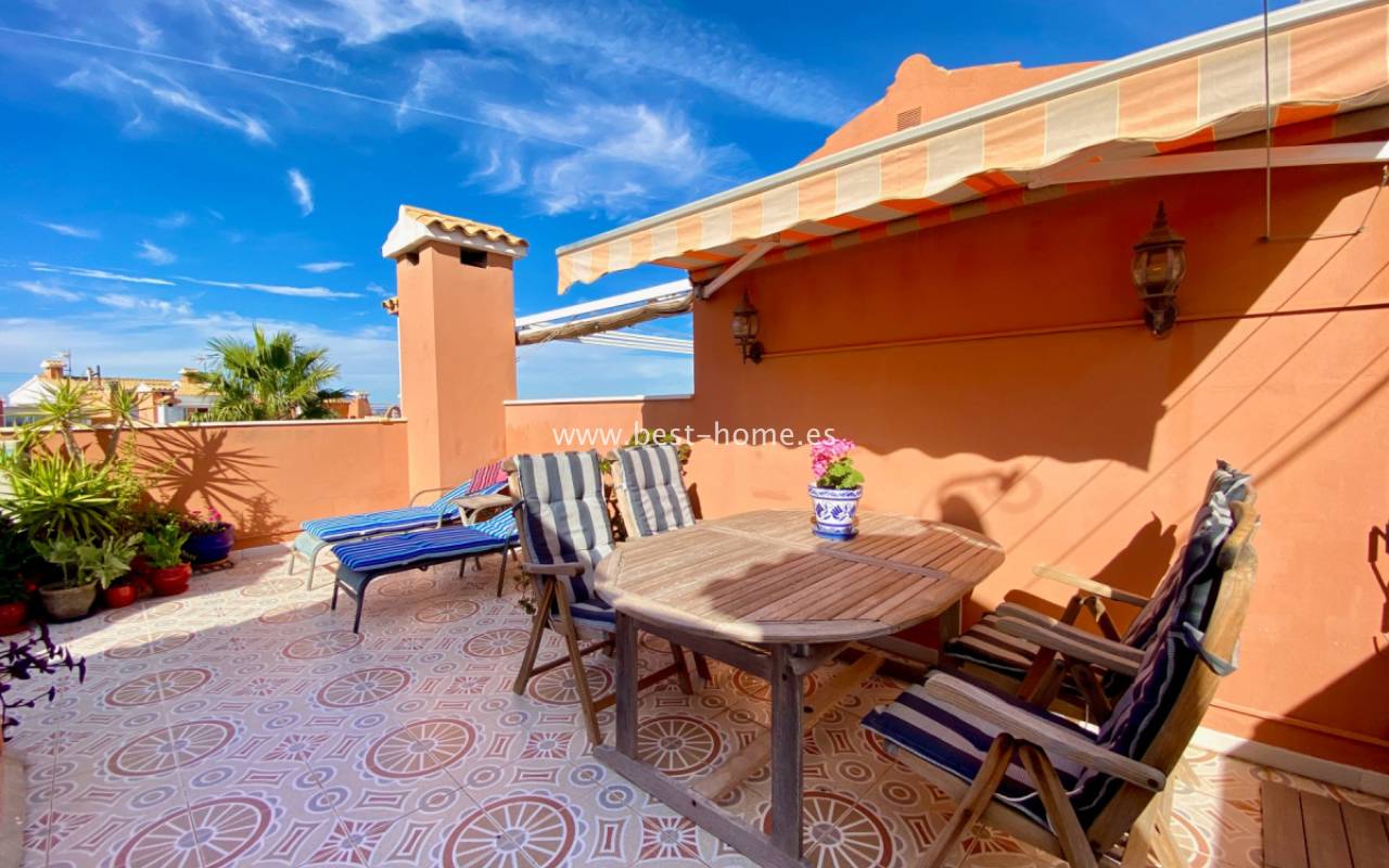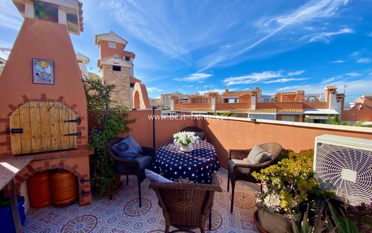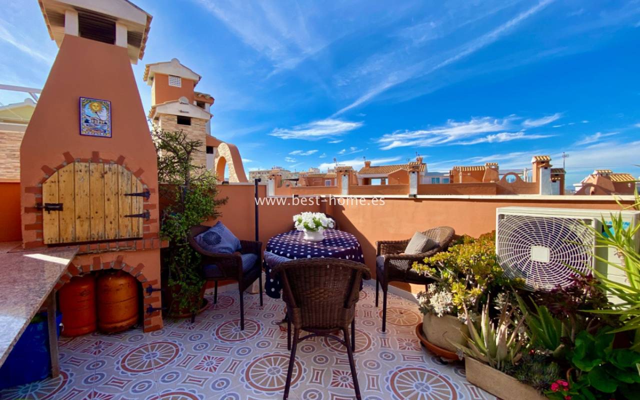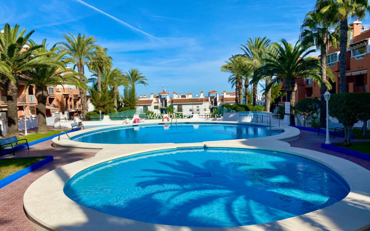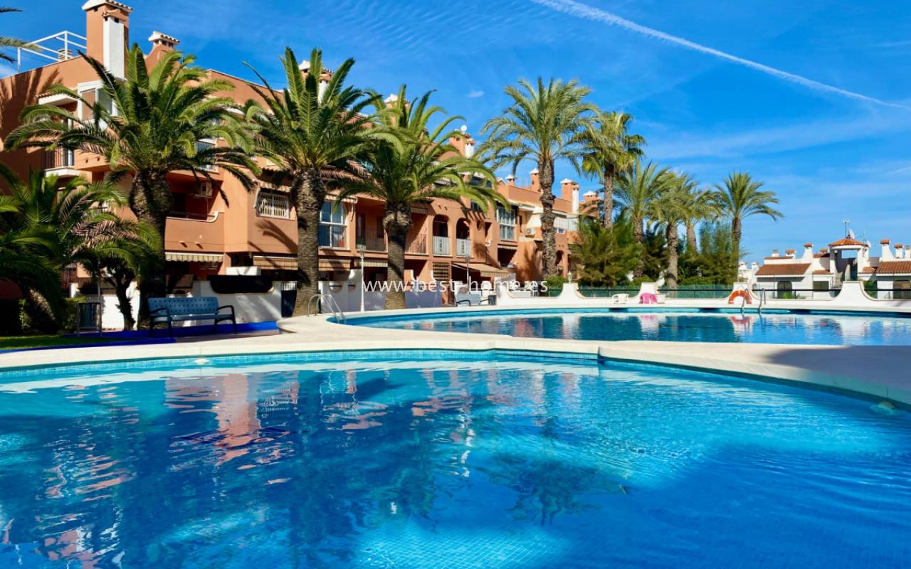 A picturesque penthouse with lagoon views, a solarium, and a charming community pool. It features a living room with an open-plan American kitchen equipped with appliances, one double bedroom, and a bathroom. Additionally, the upper floor boasts a terrace/solarium overlooking the lagoon and a brick fireplace. A major draw is the beautiful swimming pool surrounded by palm trees and lush greenery. The apartment is well-maintained and ideal for vacation rentals.