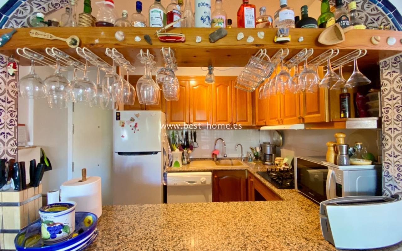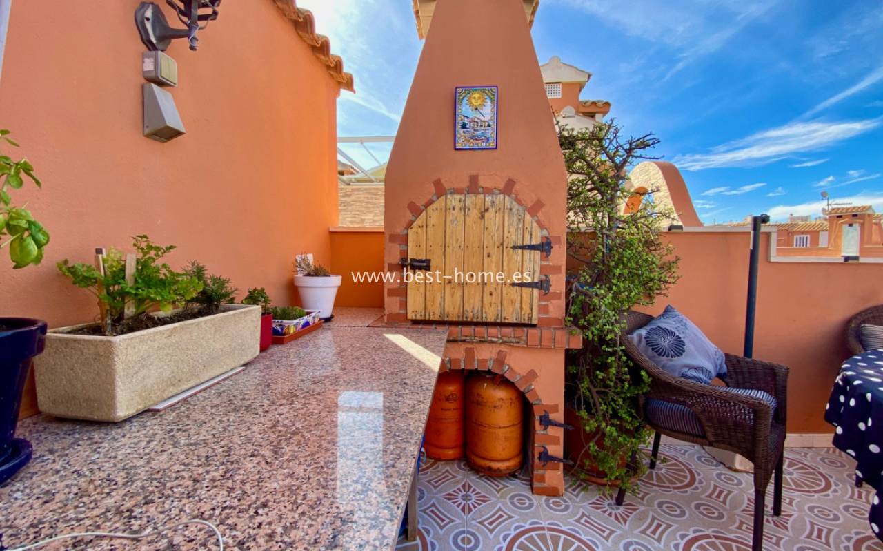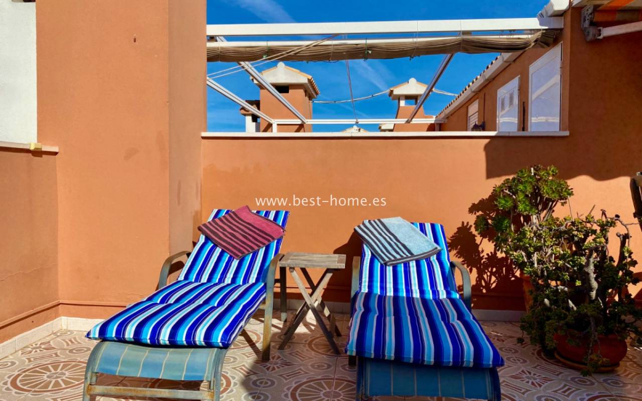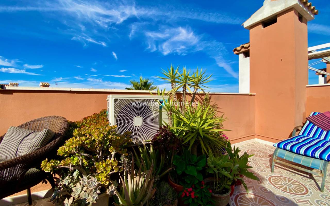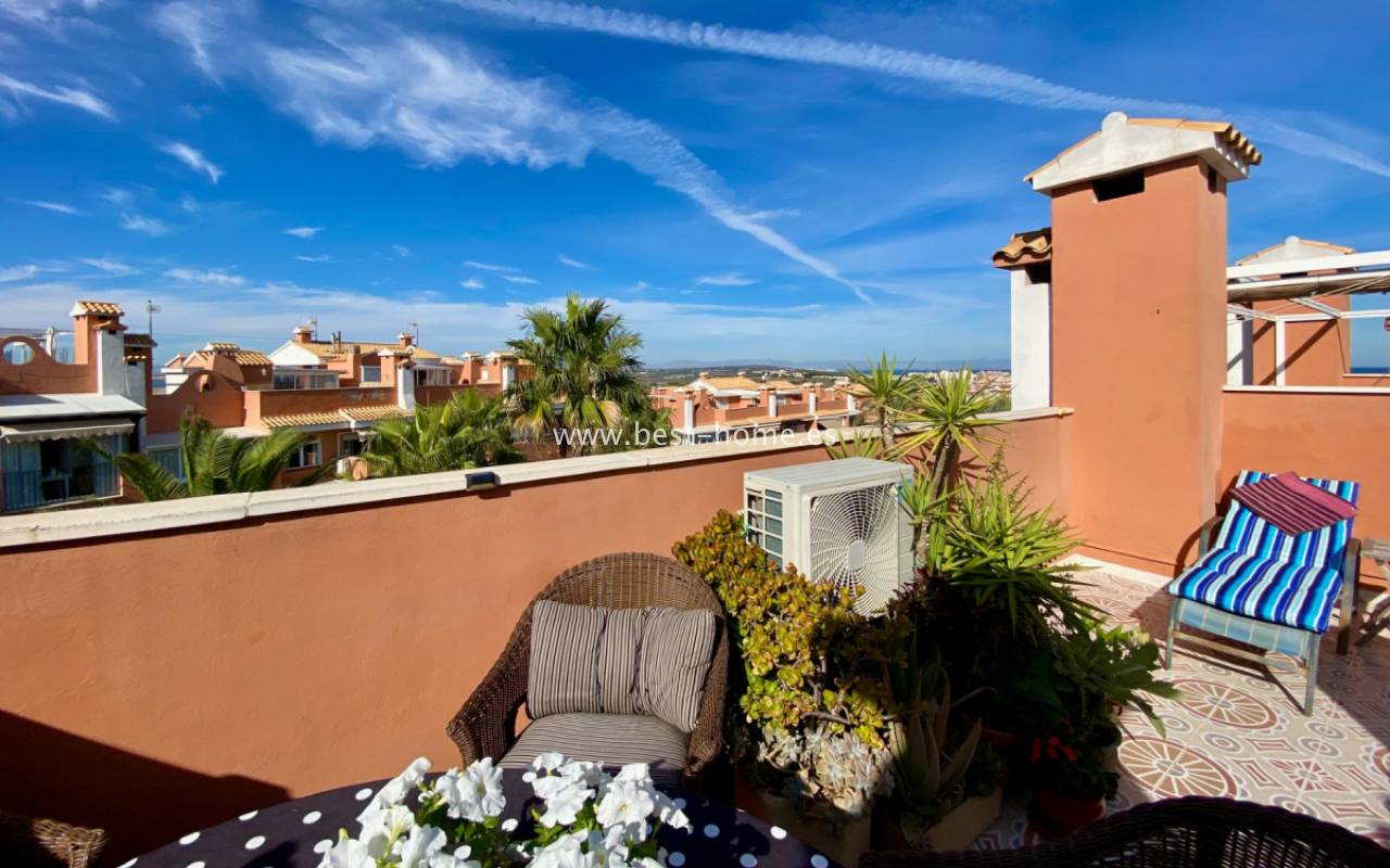 A picturesque penthouse with lagoon views, a solarium, and a charming community pool. It features a living room with an open-plan American kitchen equipped with appliances, one double bedroom, and a bathroom. Additionally, the upper floor boasts a terrace/solarium overlooking the lagoon and a brick fireplace. A major draw is the beautiful swimming pool surrounded by palm trees and lush greenery. The apartment is well-maintained and ideal for vacation rentals.